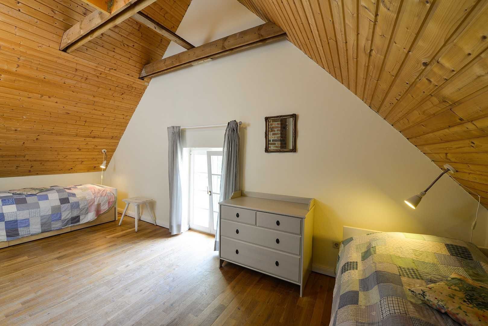 Das frei stehende Ferienhaus Remise befindet sich neben dem Gutshaus und erstreckt sich über zwei Etagen, wobei das Obergeschoss über eine Holztreppe zu erreichen ist. Die Remise für bis zu sechs Personen und in einer Größe von 72 m² ist gemütlich und mit Liebe zum Detail eingerichtet und besteht aus vier Zimmern: Im Erdgeschoss ein großes Wohnzimmer mit offener Küche (Siemens-Geräte) und schönem Blick auf den Garten und das Wasser, ein Schlafzimmer mit zwei Einzelbetten und zwei Schlafzimmer mit einem Doppelbett, die drei Schlafzimmer alle im Obergeschoss. Die Remise hat ein Badezimmer mit Badewanne und Dusche sowie ein separates WC. Die Böden sind aus Eichenholz-Parkett. Im Wohnzimmer befindet sich ein Kaminofen.