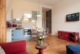 Die 3-Zimmer Ferienwohnung Krabbe mit Süd-West Balkon, befindet sich im 1. Obergeschoss und ist äußerst komfortabel eingerichtet. Mit einer Wohnfläche von 51qm ist das Appartement für eine Belegung mit bis zu 4 Personen gut geeignet. Im hellen Wohn-/Essbereich können Sie es sich auf dem Sofa oder im Lehnsessel so richtig gemütlich machen. Als Unterhaltungstechnik bieten insgesamt 2 Fernseher sowie ein Radio, WLAN ohne Gebühr etwas Abwechslung.