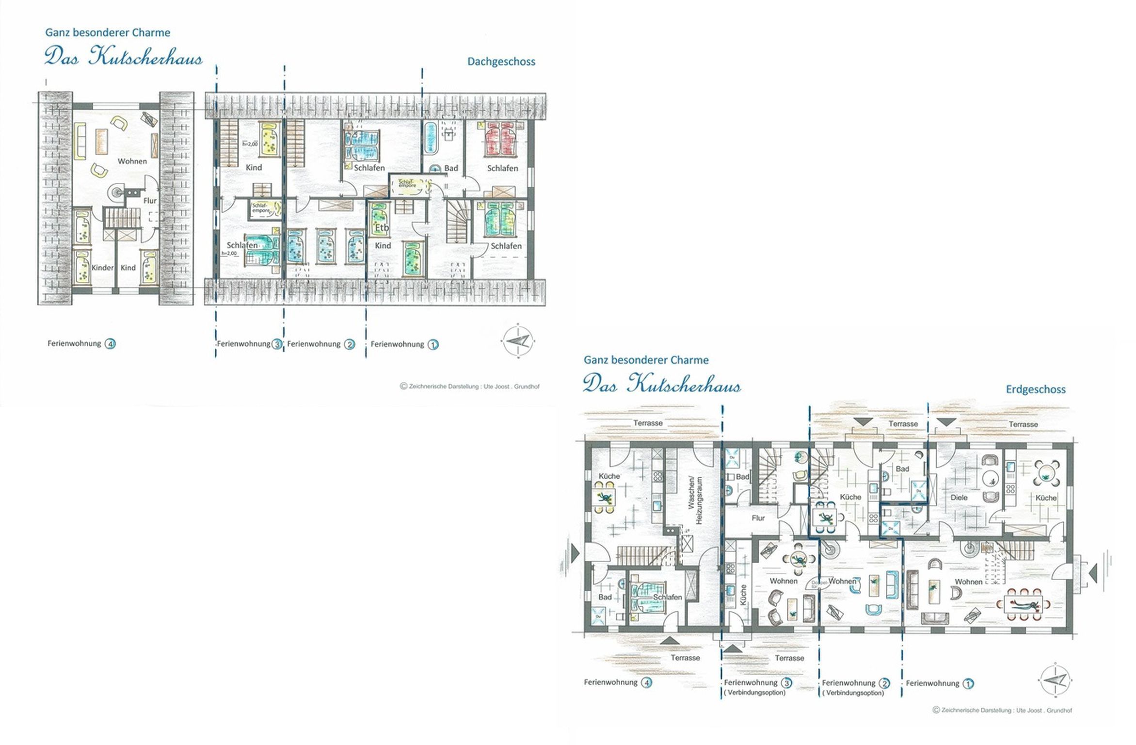 Diese Wohnung und und die Ferienwohnung Kutscherhaus II sind durch eine schalldichte Tür miteinander verbunden, sodass befreundete Familien oder kleine Gruppen die Wohnungen gemeinsam nutzen können.