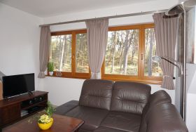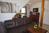 Das Wohnzimmer ist mit einer bequemen Leder-Eck-Couch ausgestattet. Der Schlafraum verfügt über ein Doppelbett (1,8 m x 2 m). Ein Lounge-Sessel, der zum Schlafen ausgeklappt werden kann (Liegefläche ca. 0,85 m x ca. 1,90 m), bietet die Möglichkeit zur Aufbettung für ein Kind im Schlafzimmer neben dem Doppelbett.