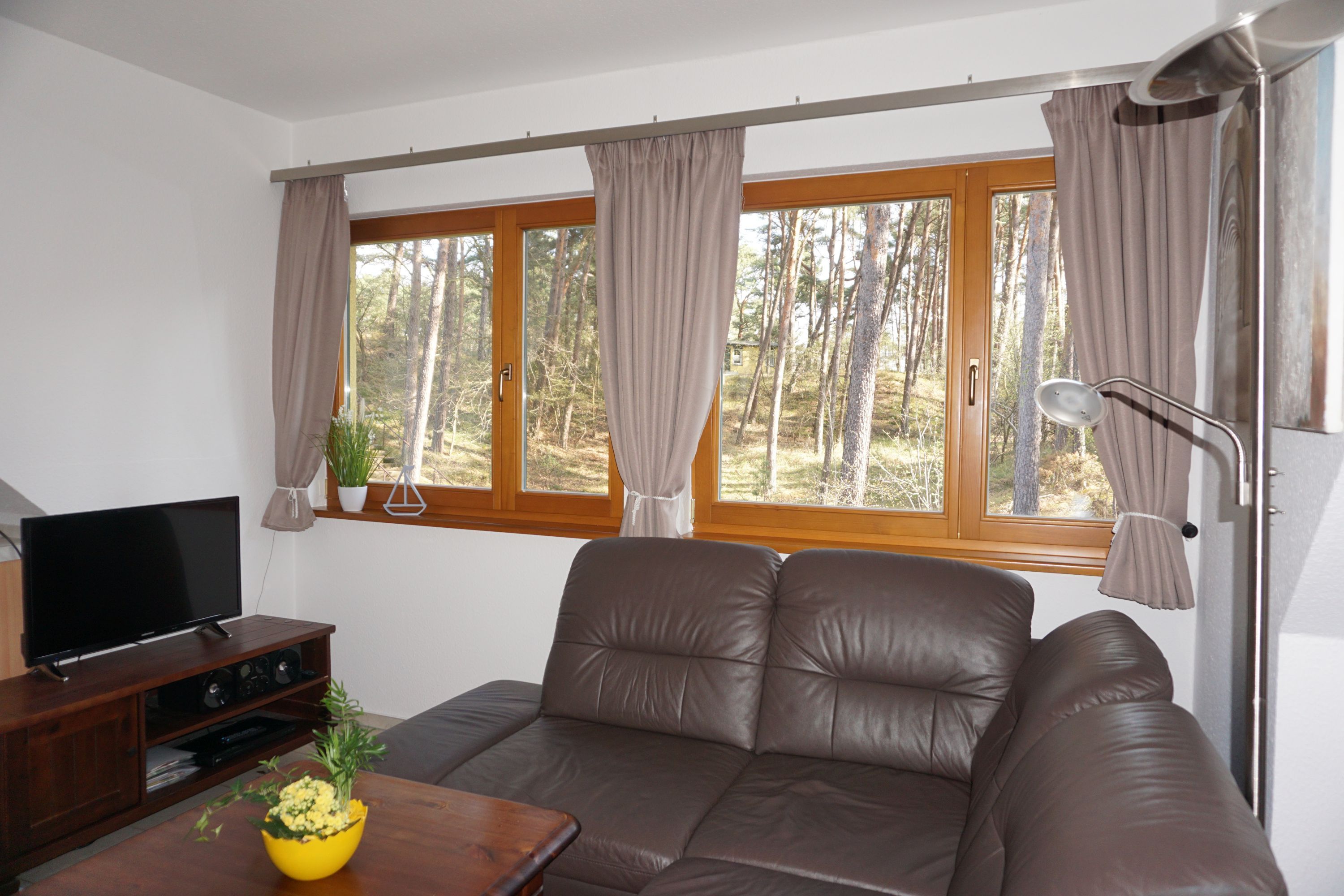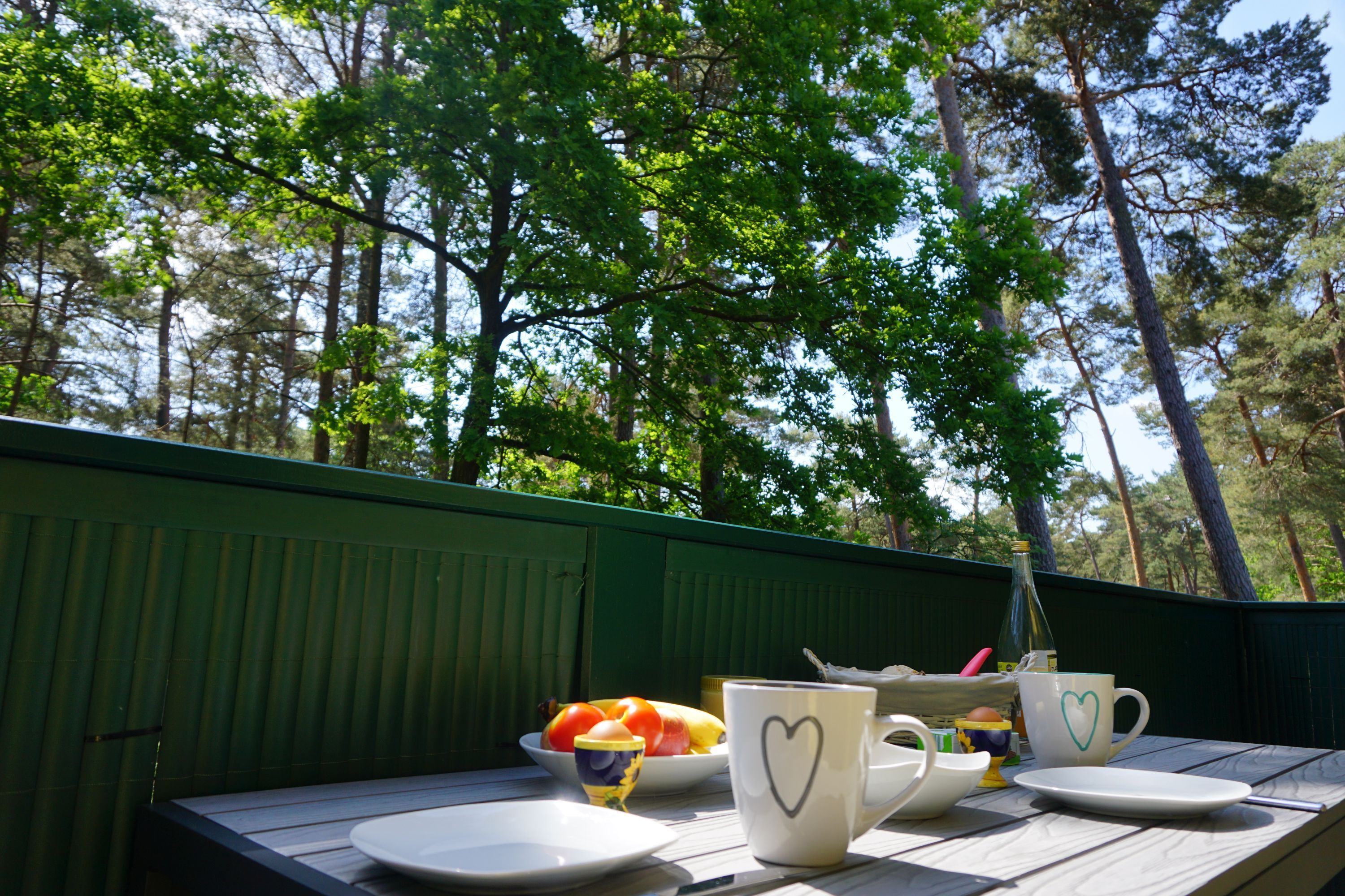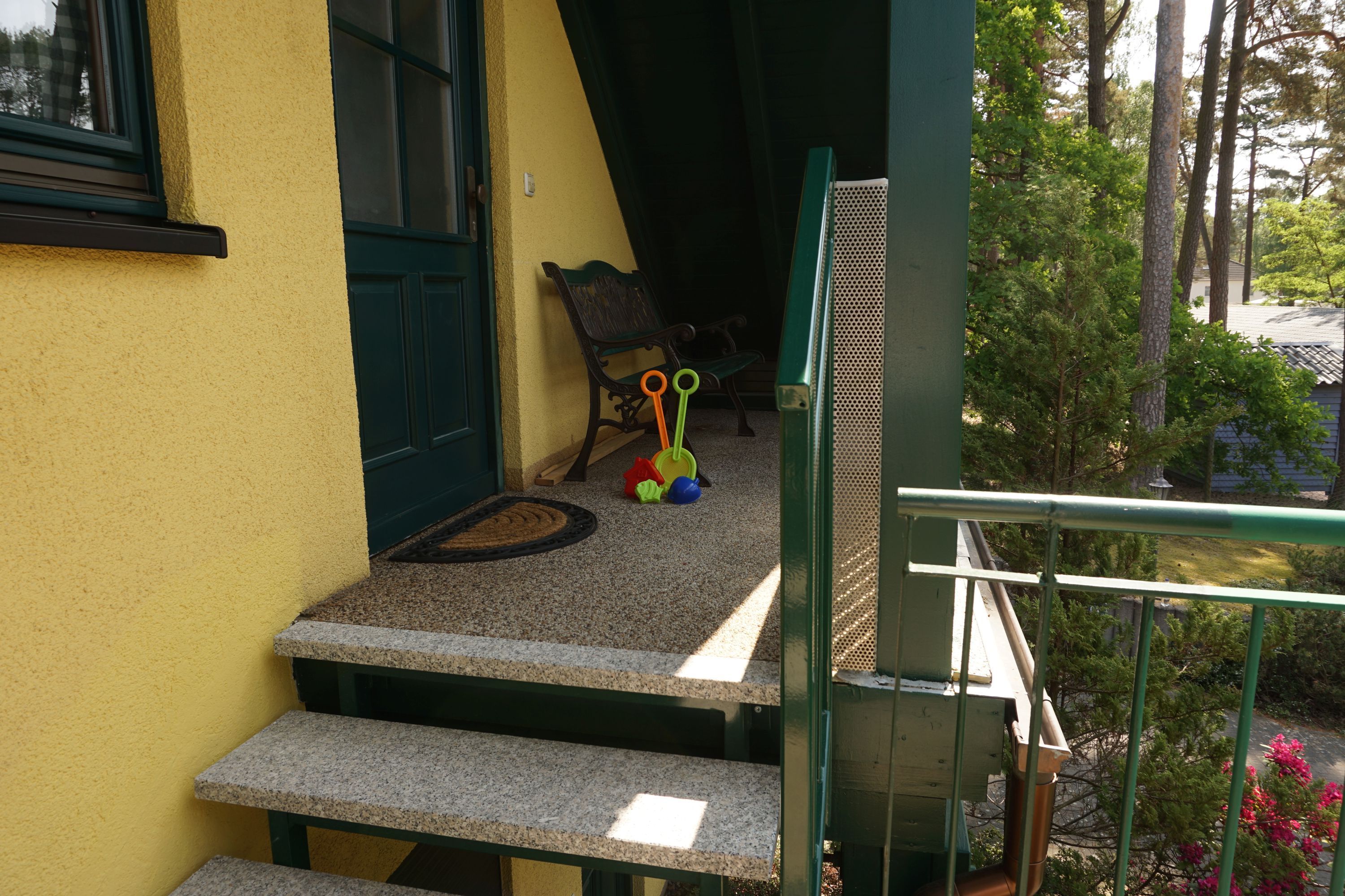 Der Balkon lädt mit Blick in den Dünenwald zum Verweilen ein. Im Außenbereich befindet sich ein PKW-Stellplatz, der im Mietpreis enthalten ist.