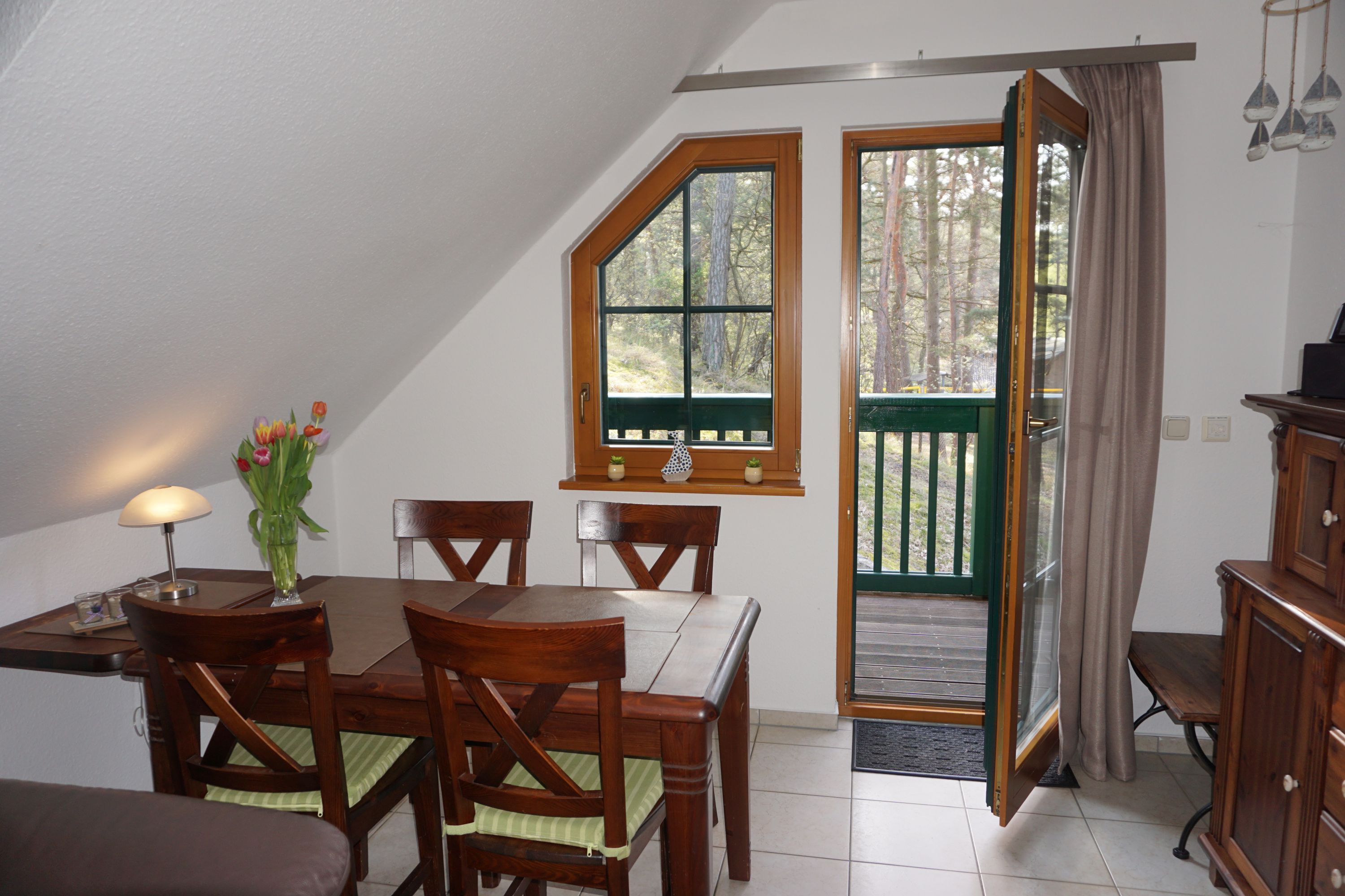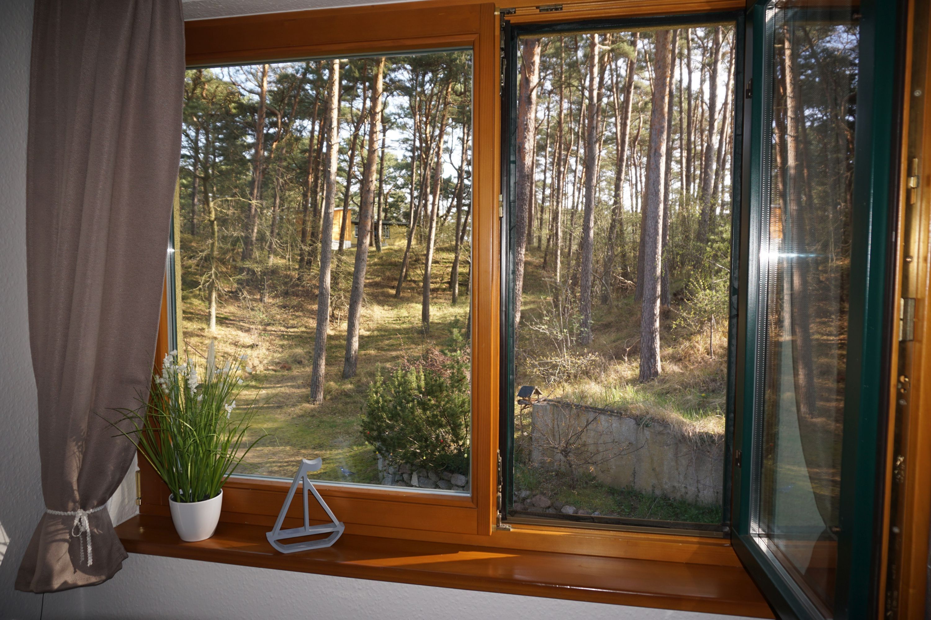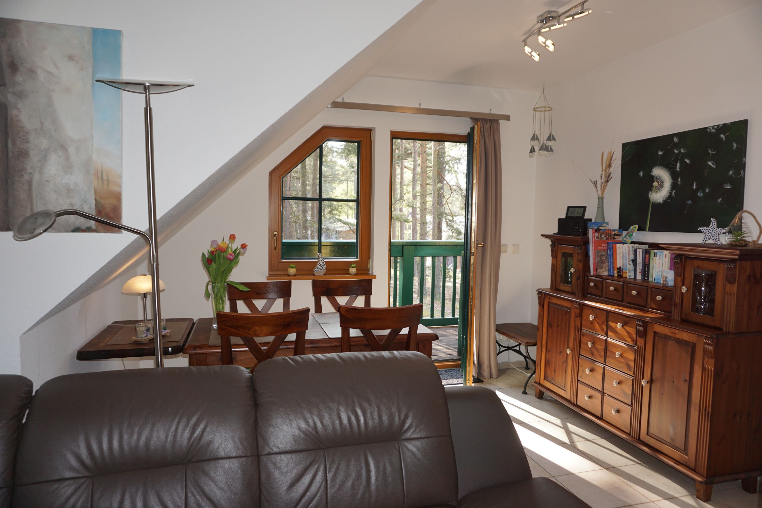 Der Balkon lädt mit Blick in den Dünenwald zum Verweilen ein. Im Außenbereich befindet sich ein PKW-Stellplatz, der im Mietpreis enthalten ist.