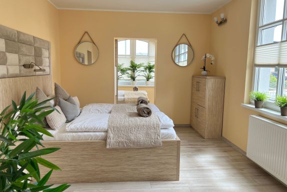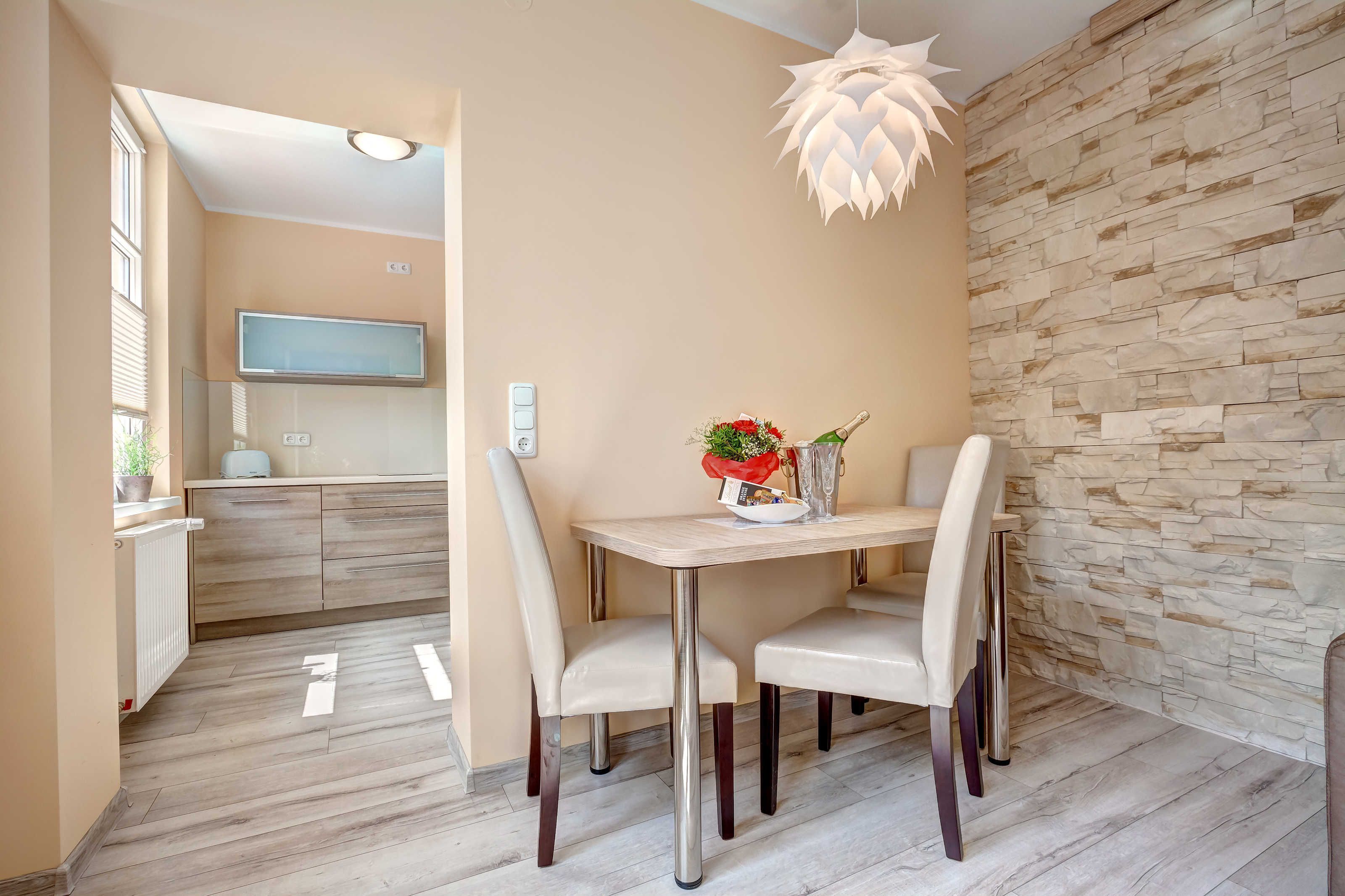 Die nur 80 Meter vom Strand entfernte Erdgeschosswohnung hat einen separaten Eingang. Sie ist besonders familienfreundlich und für Rollstuhlfahrer geeignet durch einen stufenlosen Zugang. Selbst die gesamte Ferienwohnung ist barrierefrei. Allergiker fühlen sich so wohl wie unsere Nichtraucher. In den Schlafzimmern befinden sich zwei extrahohe, bequeme Betten (160cm und 140cm). Selbstverständlich erwartet Sie eine komfortable Vollausstattung. Ansprechende Laminat- und Steinfliesenböden sorgen für Behaglichkeit und eine warme, heimische Atmosphäre. Die gesamte Ferienwohnung wird von einer Fußbodenheizung erwärmt. Im separaten Wohnzimmer steht Ihnen ein LED-SMART-TV, freier Internetzugang sowie eine moderne, grundausgestattete Einbauküche zur Verfügung. Ein Parkplatz direkt vor Ihrem Feriendomizil sorgt für kürzeste Wege. Weiße, kräftige Baumwollbettwäsche und weiche Handtücher werden Ihnen schmeicheln. Geschirrtücher sowie Duschvorleger sind ebenfalls vorhanden. Hochstühle und Kinderreisebetten können nach Rücksprache zur kostenlosen Nutzung bereitgestellt werden. Toilettenhalterung und behindertengerechte Duschhocker sind für unsere bedürftigen Gäste ebenfalls auf Anfrage inklusive. Jungen Familien und gehandicapten Personen werden sämtliche, barrierefreien Zugänge zum Strand, zur Seebrücke und der Ortschaft Ahlbeck sehr entgegenkommen.