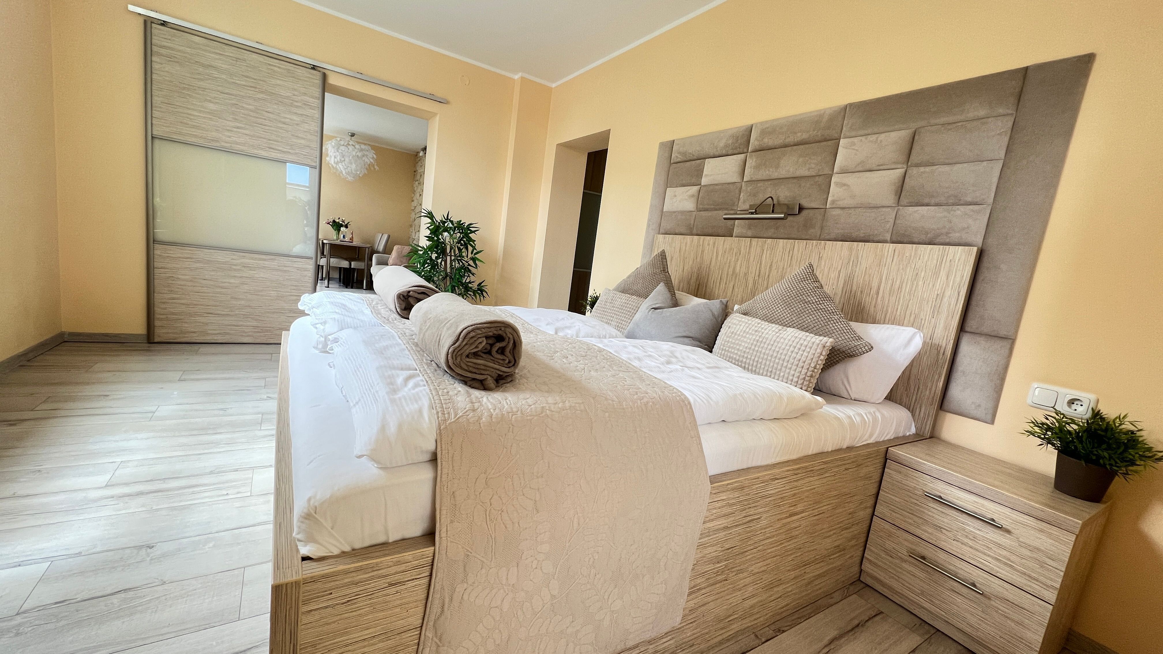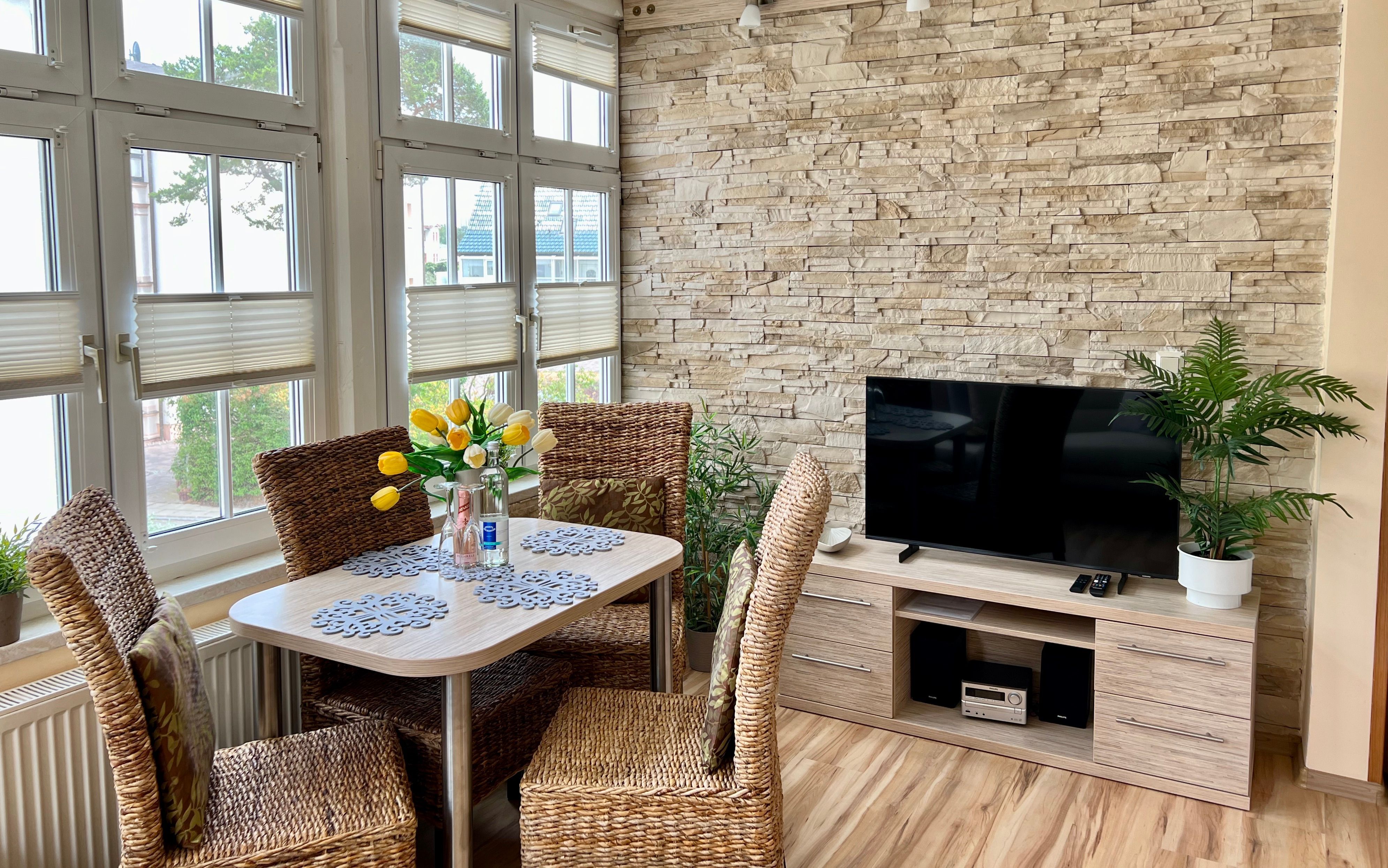 Die nur 80 Meter vom Strand entfernte Obergeschosswohnung besticht durch seine Helligkeit. Viele Fenster mit speziell beschichteten Plissees sorgen für ein individuelles Raumklima. Ein großzügiger Wohn-/Schlafraum sowie ein zweites, separates Schlafzimmer dienen Familien mit ausreichend Platz. Zwei große Betten (160cm und 140cm) sowie eine farblich harmonische Sitzecke lassen Ihrer Ruhe keine Wünsche offen. Eine moderne, grundausgestattete Einbauküche, LED-SMART-TV, HiFi-Anlage und Internetzugang lassen Sie bei uns alle Sorgen vergessen. Ihr Appartement ist sowohl Allergiker wie Nichtraucher freundlich. Weiße, kräftige Baumwollbettwäsche und weiche Handtücher werden Ihnen schmeicheln. Geschirrtücher und Duschvorleger sind vorhanden. Interessant für junge Familien sind die Unterbringungsmöglichkeiten mitgebrachten Eigentums (entweder im Haus Ihres Appartements Parterre oder im Fahrradschuppen). Auf dem Hof finden Sie Wäscheständer für Ihre nasse Wäsche. Ihrem Fahrzeug ist ein Parkplatz direkt am Ferienhaus reserviert. Für eventuell benötigte Hochstühle oder Kinderreisebetten entstehen Ihnen nach Rücksprache keine zusätzlichen Kosten. Bitte informieren Sie uns über Ihre Wünsche rechtzeitig.