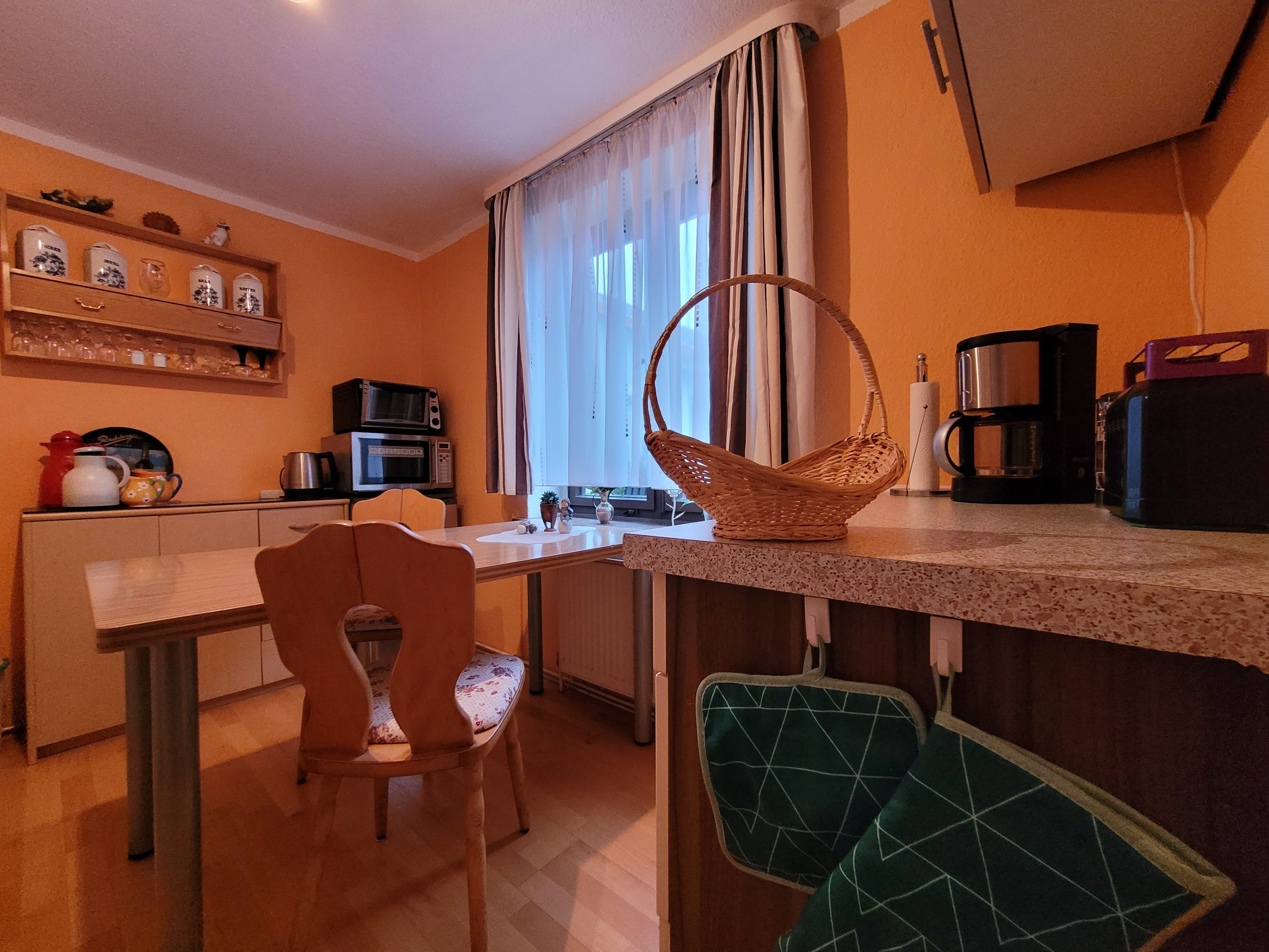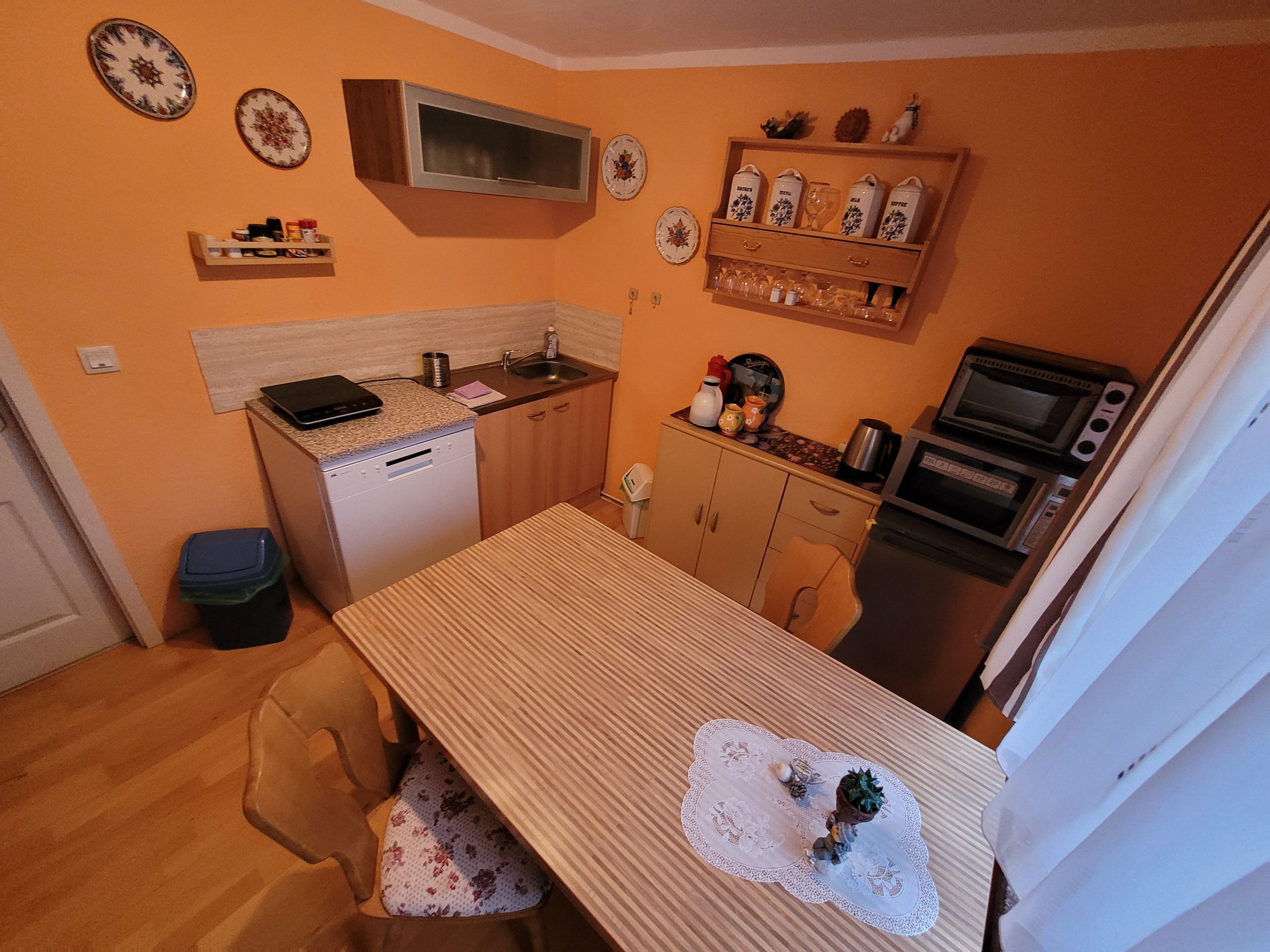 Unseren Gästen aus dem Einzel- und Doppelzimmer steht im Haus eine Gemeinschaftsküche mit Cerankochfeld, Backofen, Mikrowelle, Kaffeemaschine, Wasserkocher, Toaster, Kühlschrank mit Gefrierfach, Geschirrspüler und Spüle zur Verfügung.