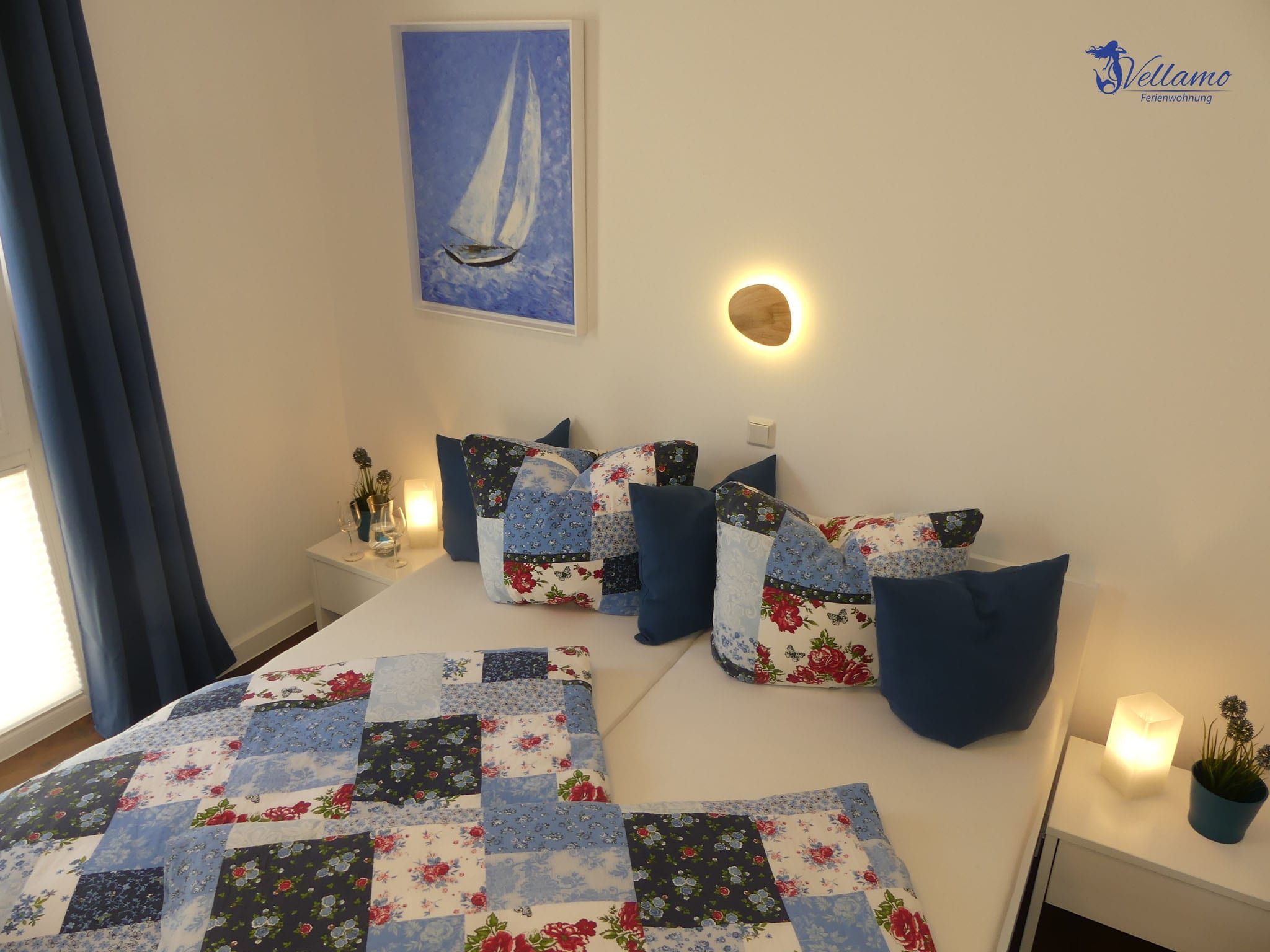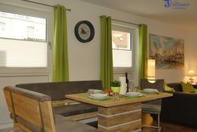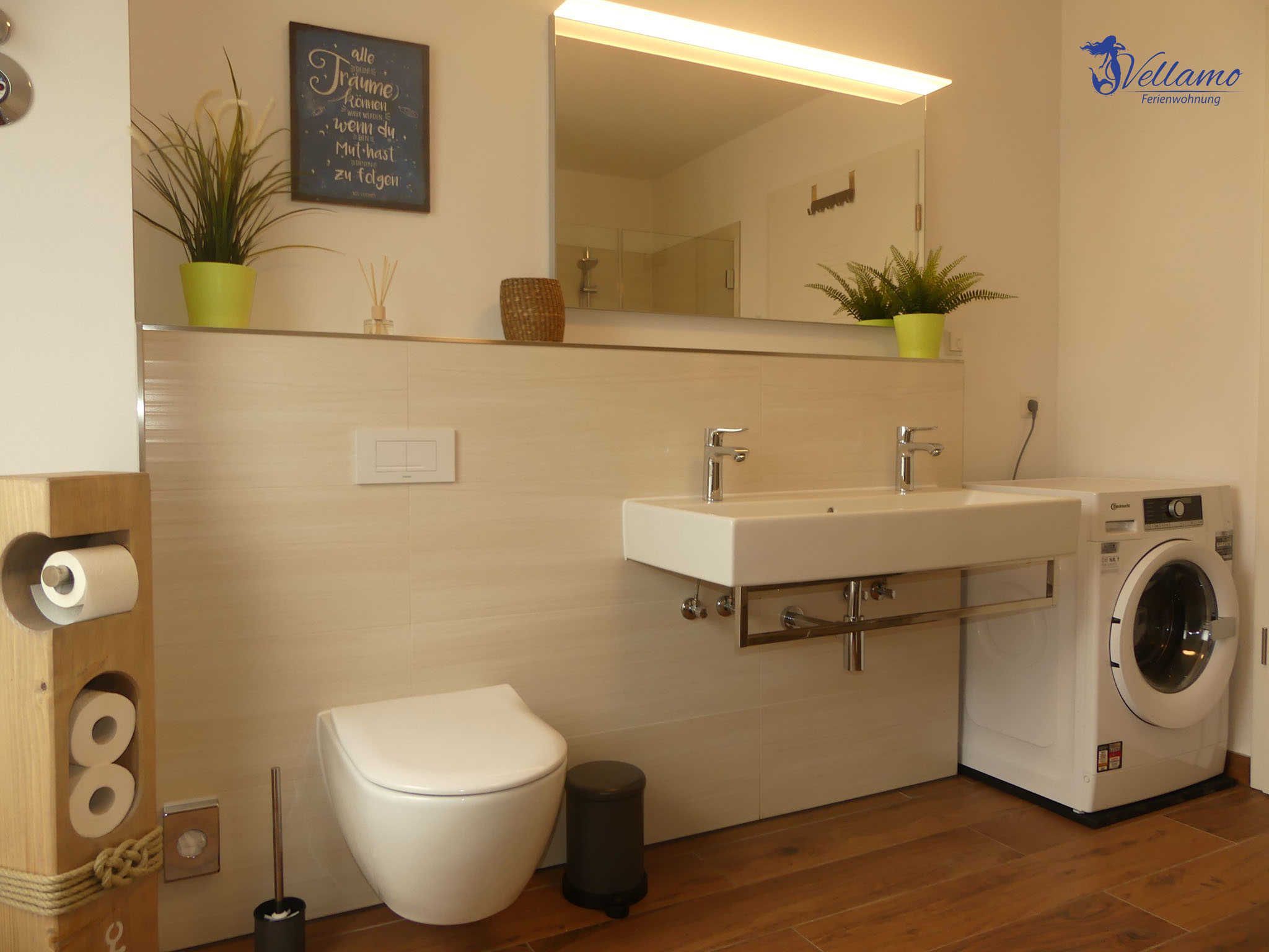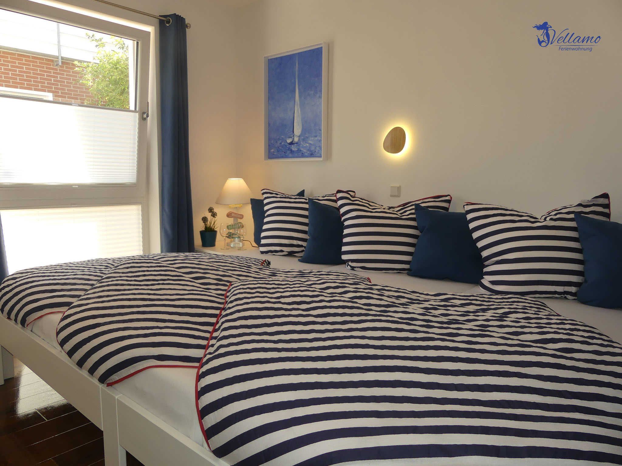 Die Ferienwohnung Vellamo bietet modernsten Ansprüchen Raum. Sie hat einen großzügigen Wohn-Essbereich mit voll ausgestatteter Einbauküche. Unseren Gästen stehen 2 Schlafzimmer zur Verfügung. Im 1. SZ steht ein Doppelbett mit einer Liegefläche von 180 x200 cm. Im 2. SZ finden Sie ein Familienbett mit einer Breite von 270 cm , welches 3 Personen ausreichend Platz bietet. Das Bad ist ausgestattet mit Dusche, Badewanne und einer Waschmaschine für die Wäsche zwischendurch. Kostenloses WLAN steht zur Verfügung. Zur Wohnung gehört ein extrabreiter Stellplatz mit Ladestation. Unsere Gäste laden ihr Elektroauto hier kostenfrei.