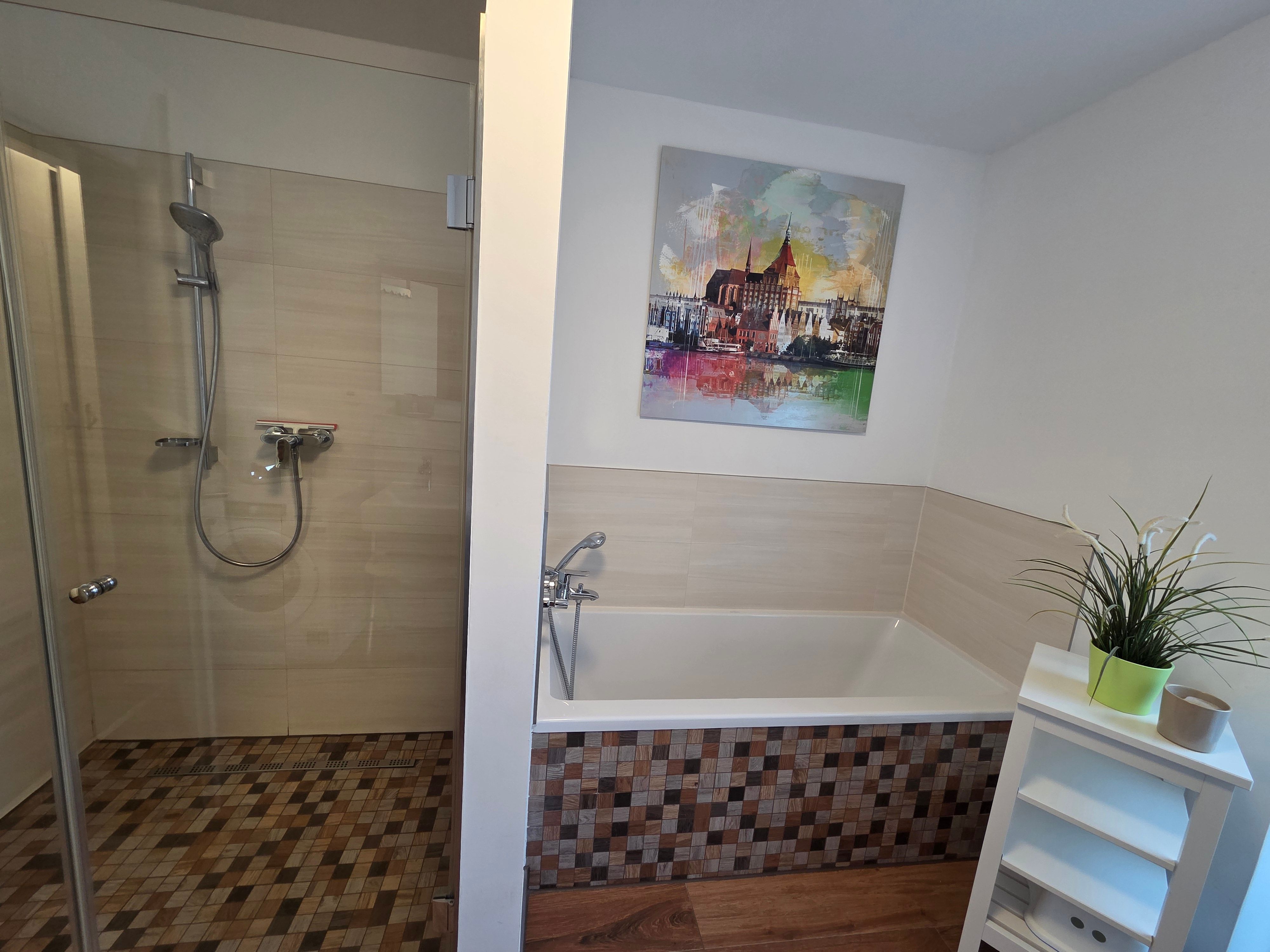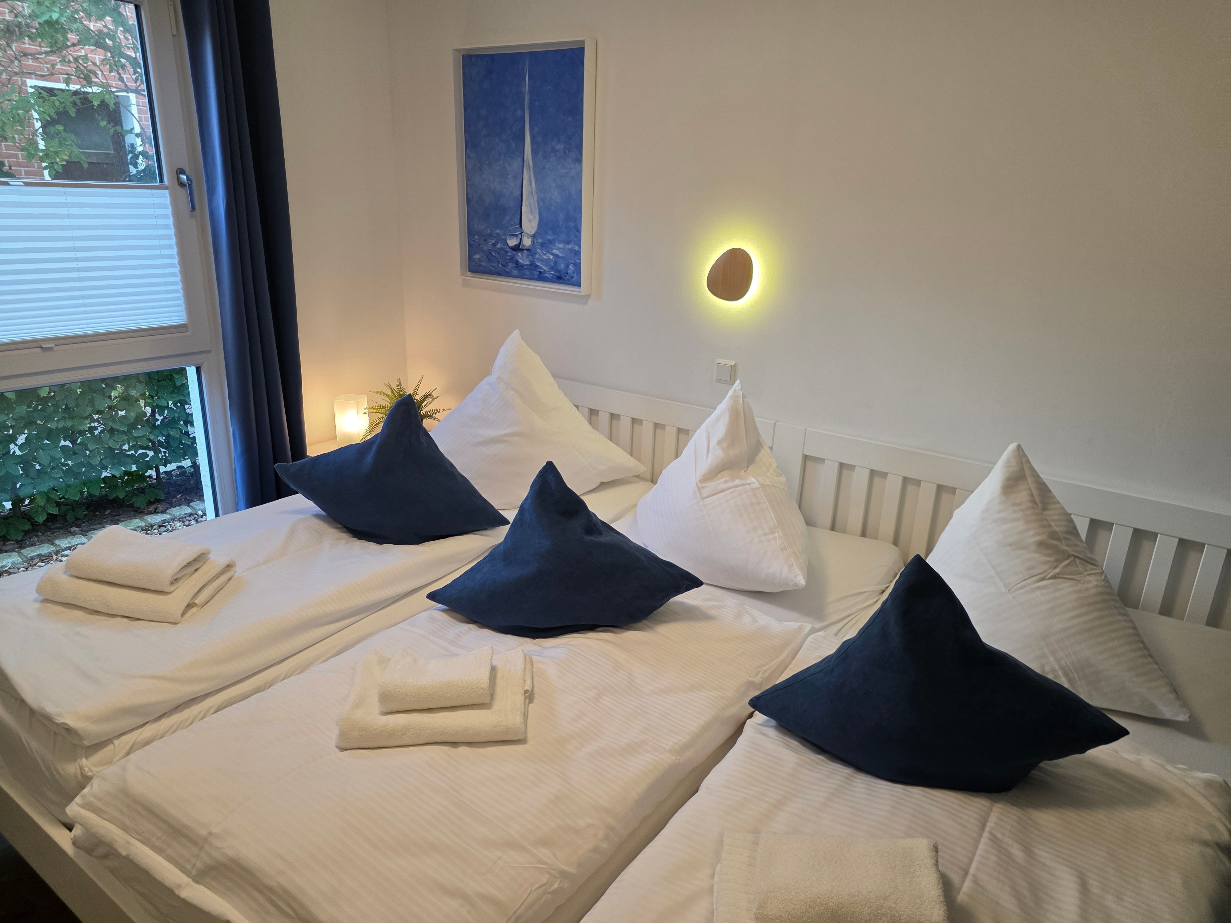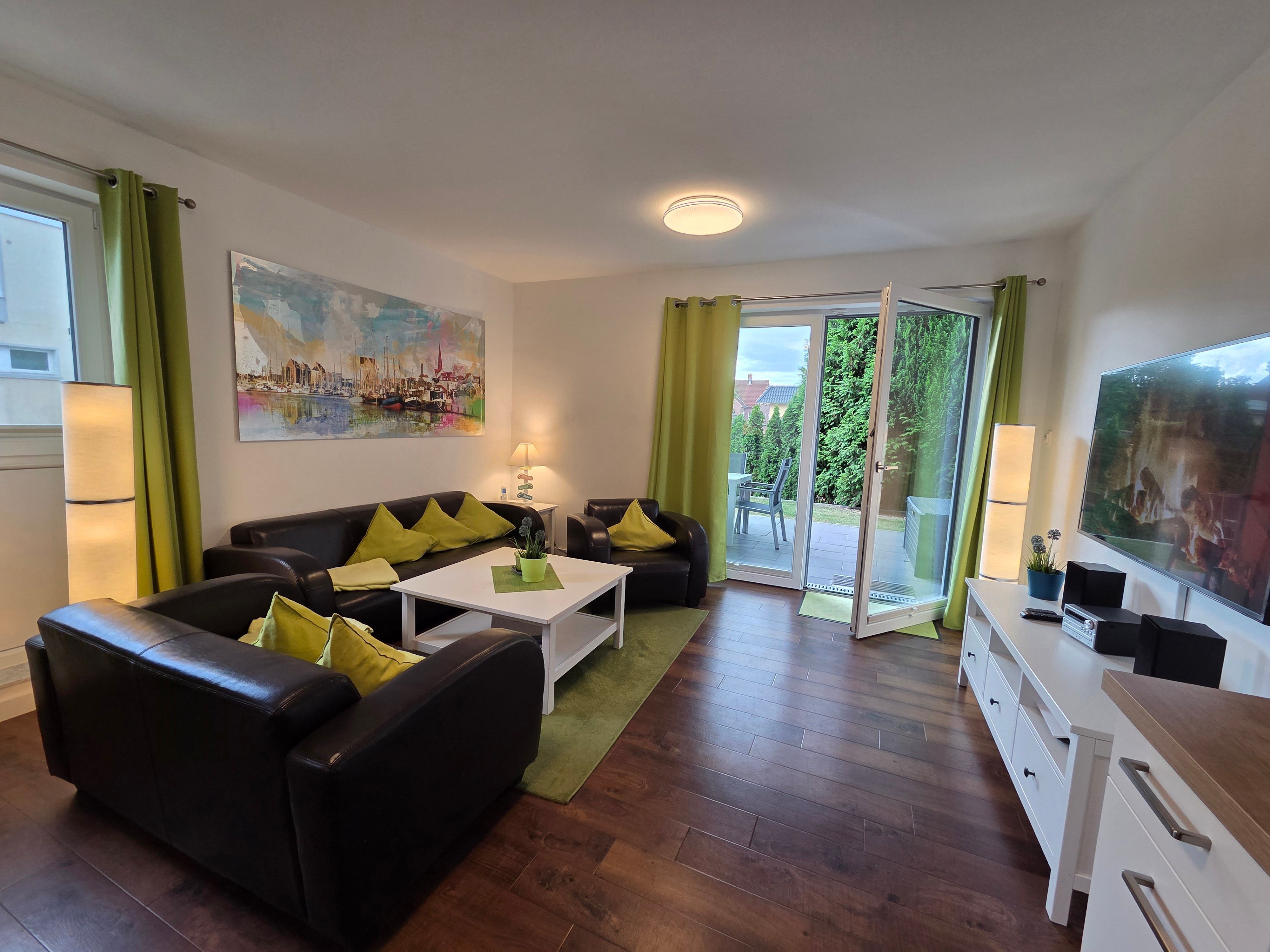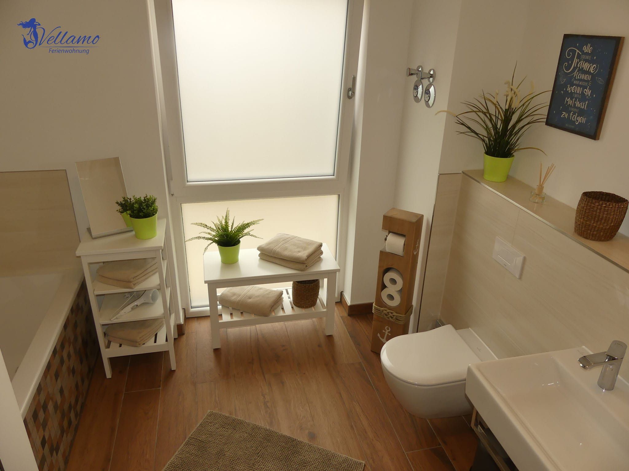 Die Ferienwohnung Vellamo bietet modernsten Ansprüchen Raum. Sie hat einen großzügigen Wohn-Essbereich mit voll ausgestatteter Einbauküche. Unseren Gästen stehen 2 Schlafzimmer zur Verfügung. Im 1. SZ steht ein Doppelbett mit einer Liegefläche von 180 x200 cm. Im 2. SZ finden Sie ein Familienbett mit einer Breite von 270 cm , welches 3 Personen ausreichend Platz bietet. Das Bad ist ausgestattet mit Dusche, Badewanne und einer Waschmaschine für die Wäsche zwischendurch. Kostenloses WLAN steht zur Verfügung. Zur Wohnung gehört ein extrabreiter Stellplatz mit Ladestation. Unsere Gäste laden ihr Elektroauto hier kostenfrei.