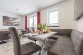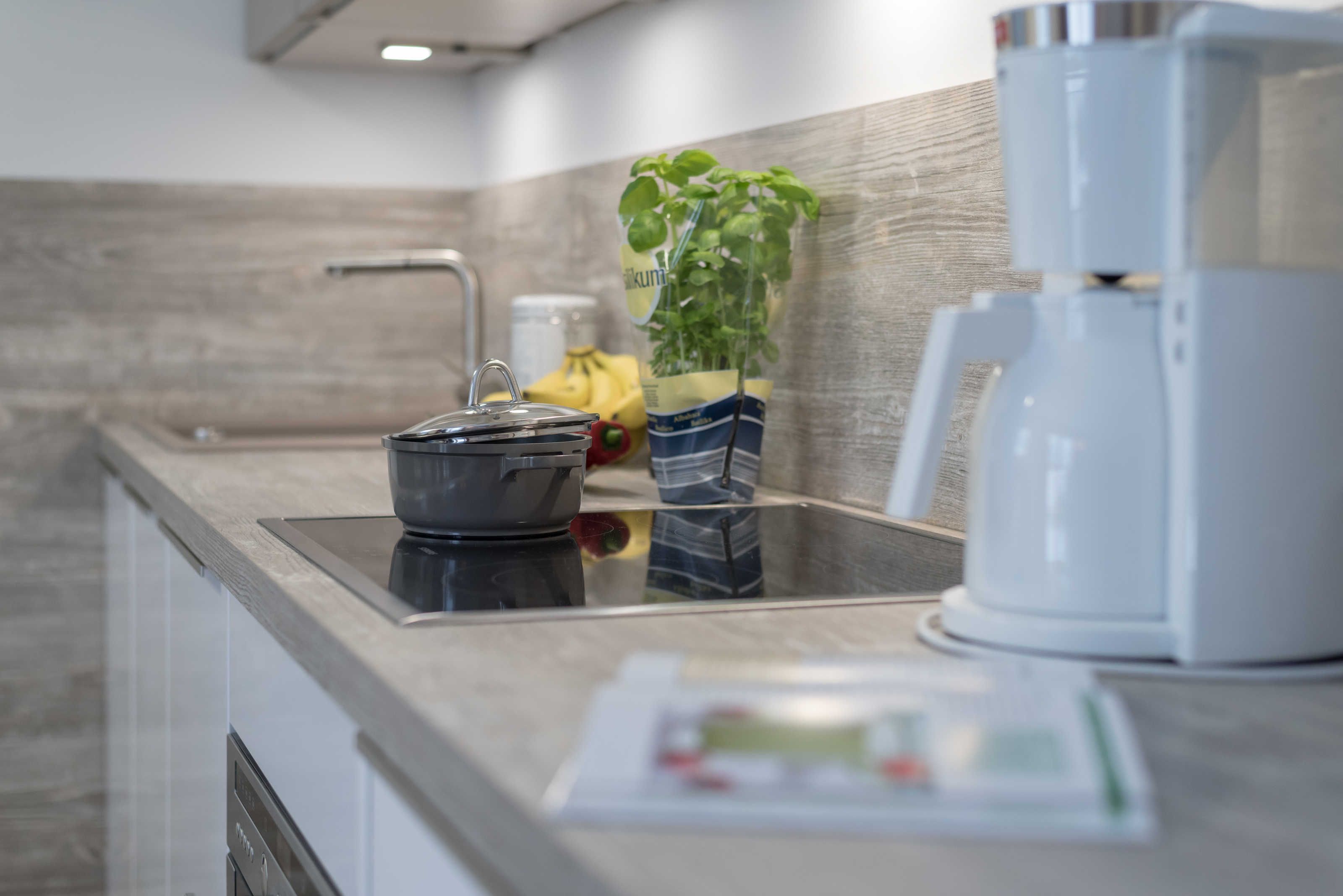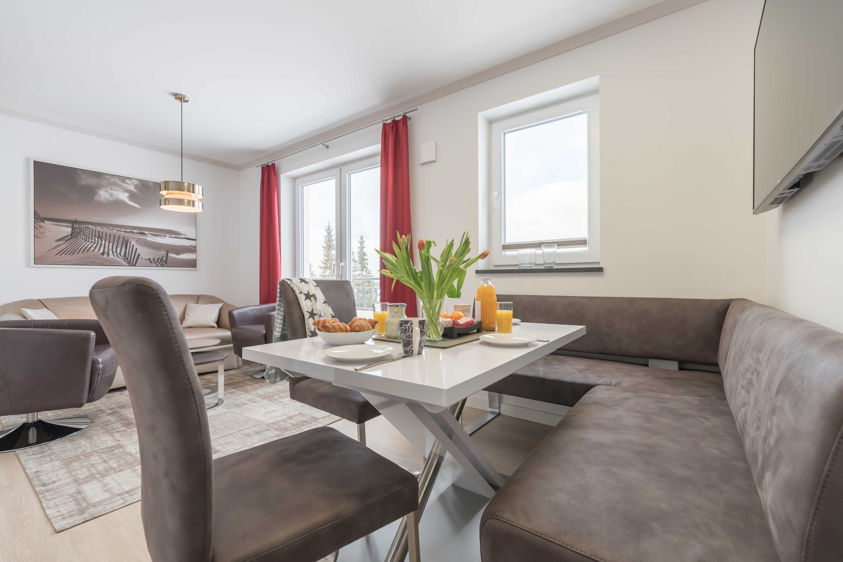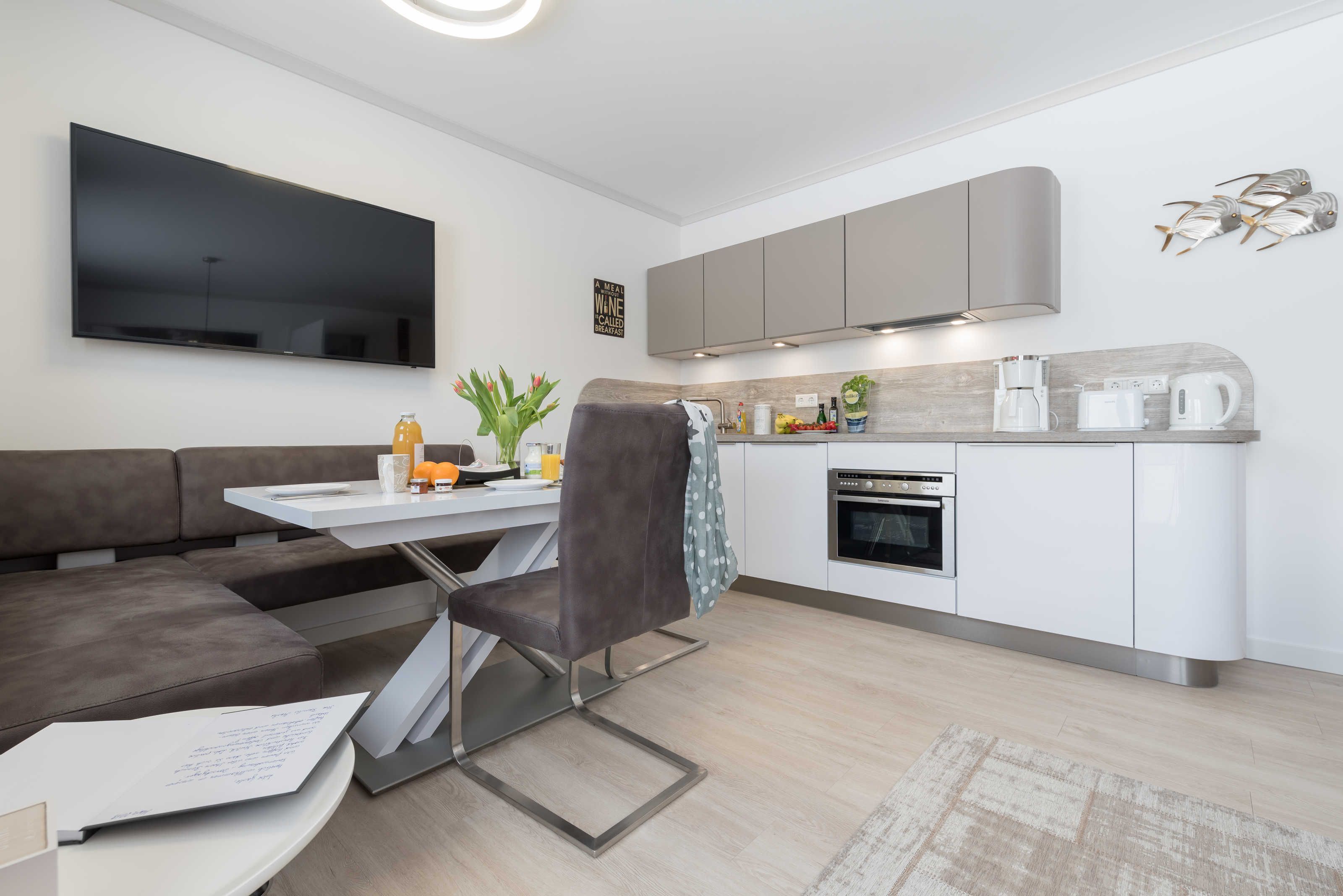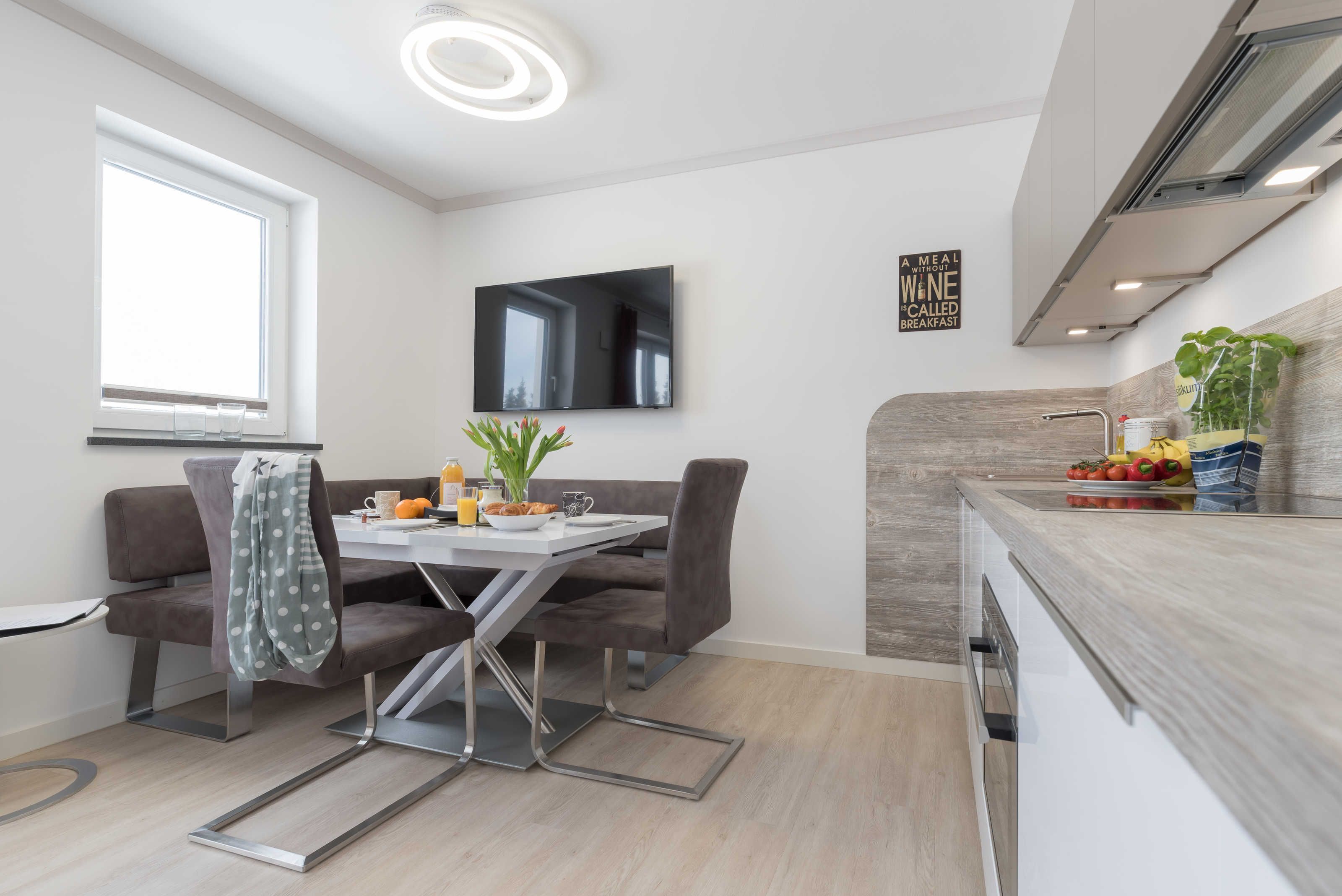 Im offenen Koch- und Essbereich finden Sie eine Einbauküche sowie eine Eckbank mit Tisch (ausziehbar) und zwei Stühlen. Diese gemütliche Sitzecke eignet sich auch hervorragend um den Abend im Kreise der Familie mit Gesellschaftsspielen ausklingen zu lassen. Die voll ausgestattete Einbauküche mit Mikrowelle (im Backofen integriert), Cerankochfeld, Geschirrspüler und Kühlschrank (mit kleinem Gefrierfach) lässt keine Wünsche offen.