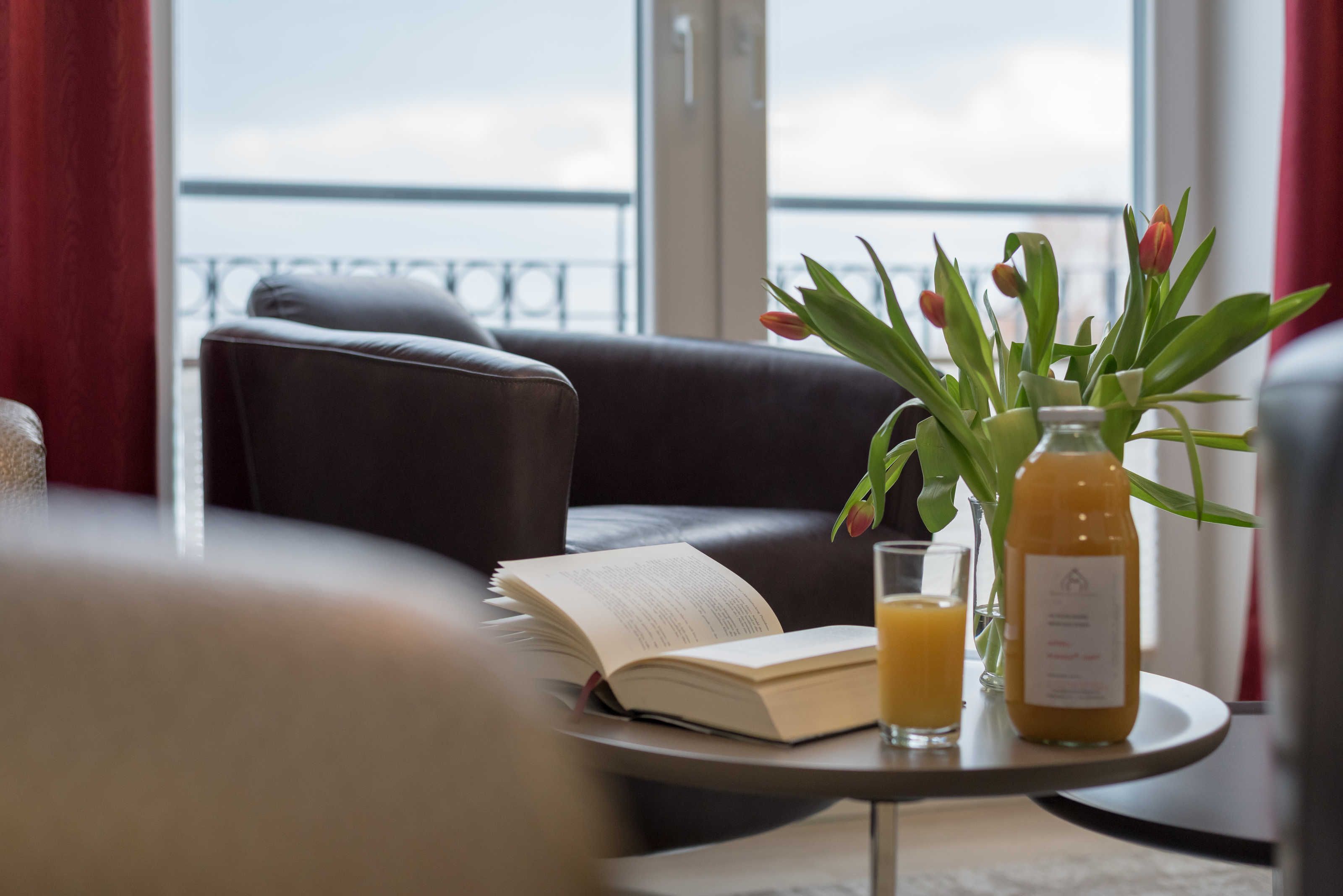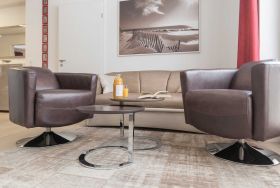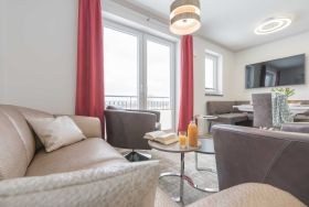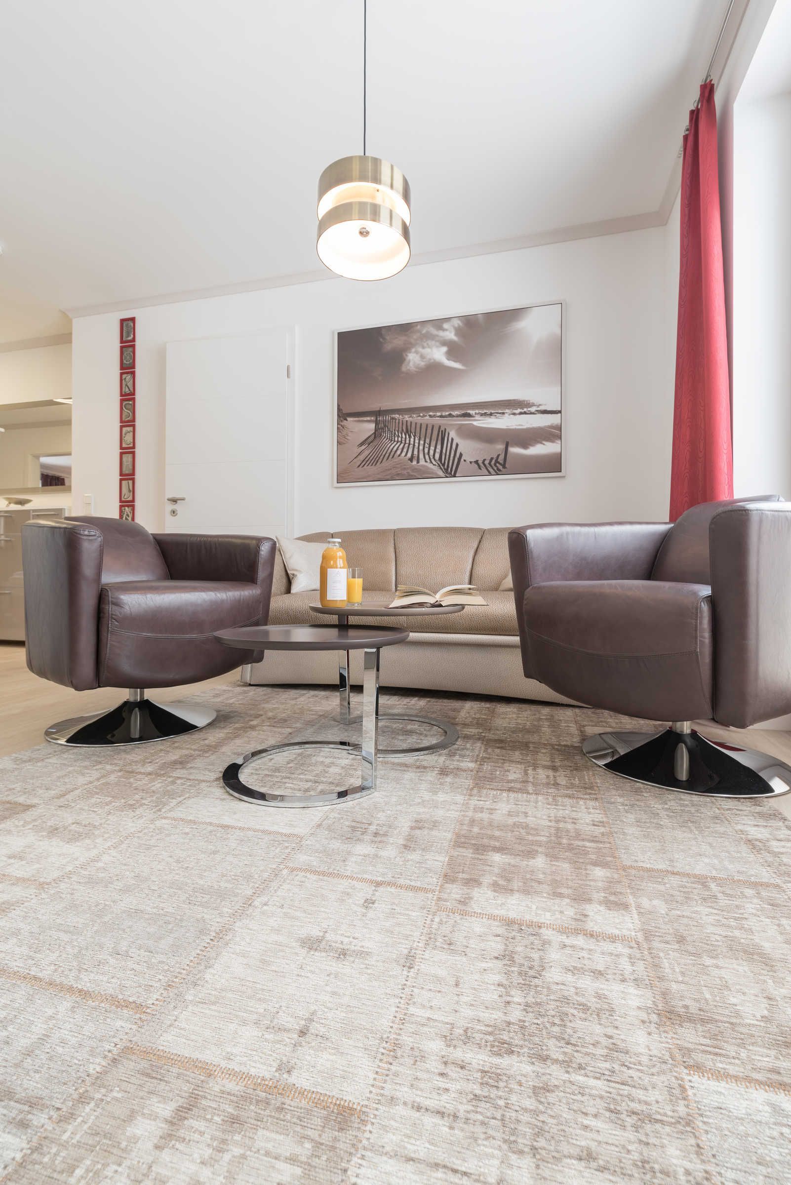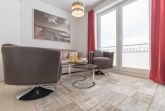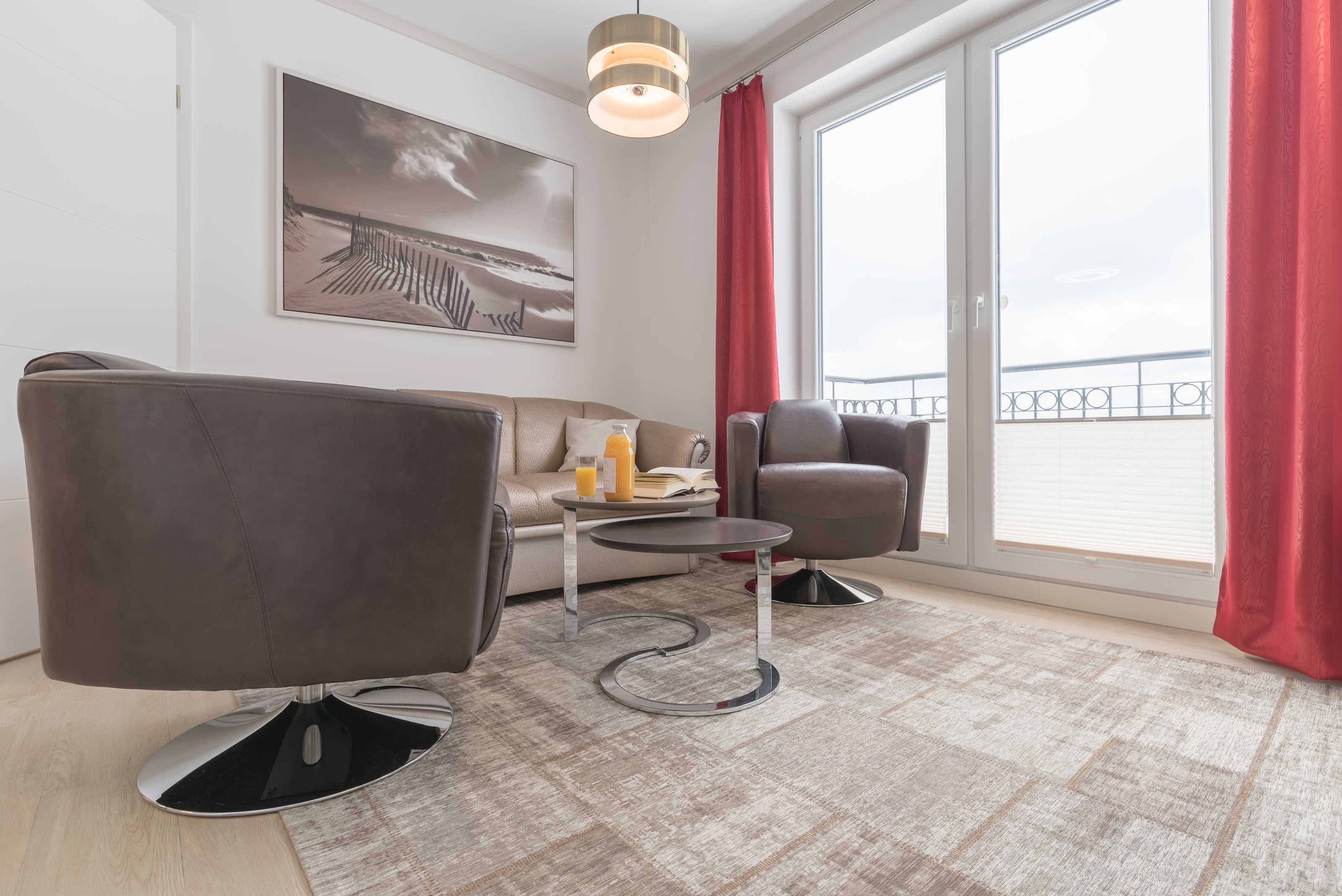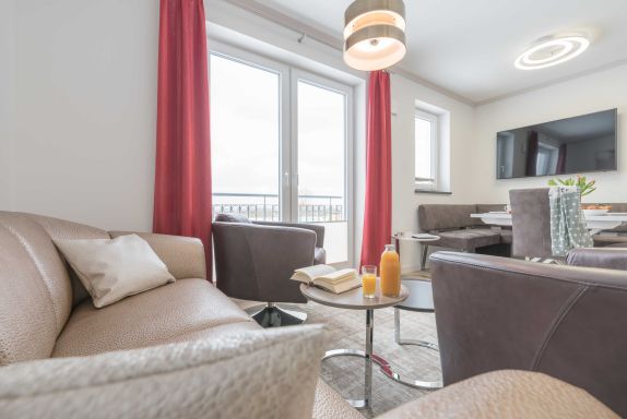 Im liebevoll eingerichteten Wohnbereich finden Sie ein kleines Sofa (Zweisitzer) und zwei gemütliche Drehsessel. Ein großer Flat Screen-TV ist an der gegenüberliegenden Wand befestigt.