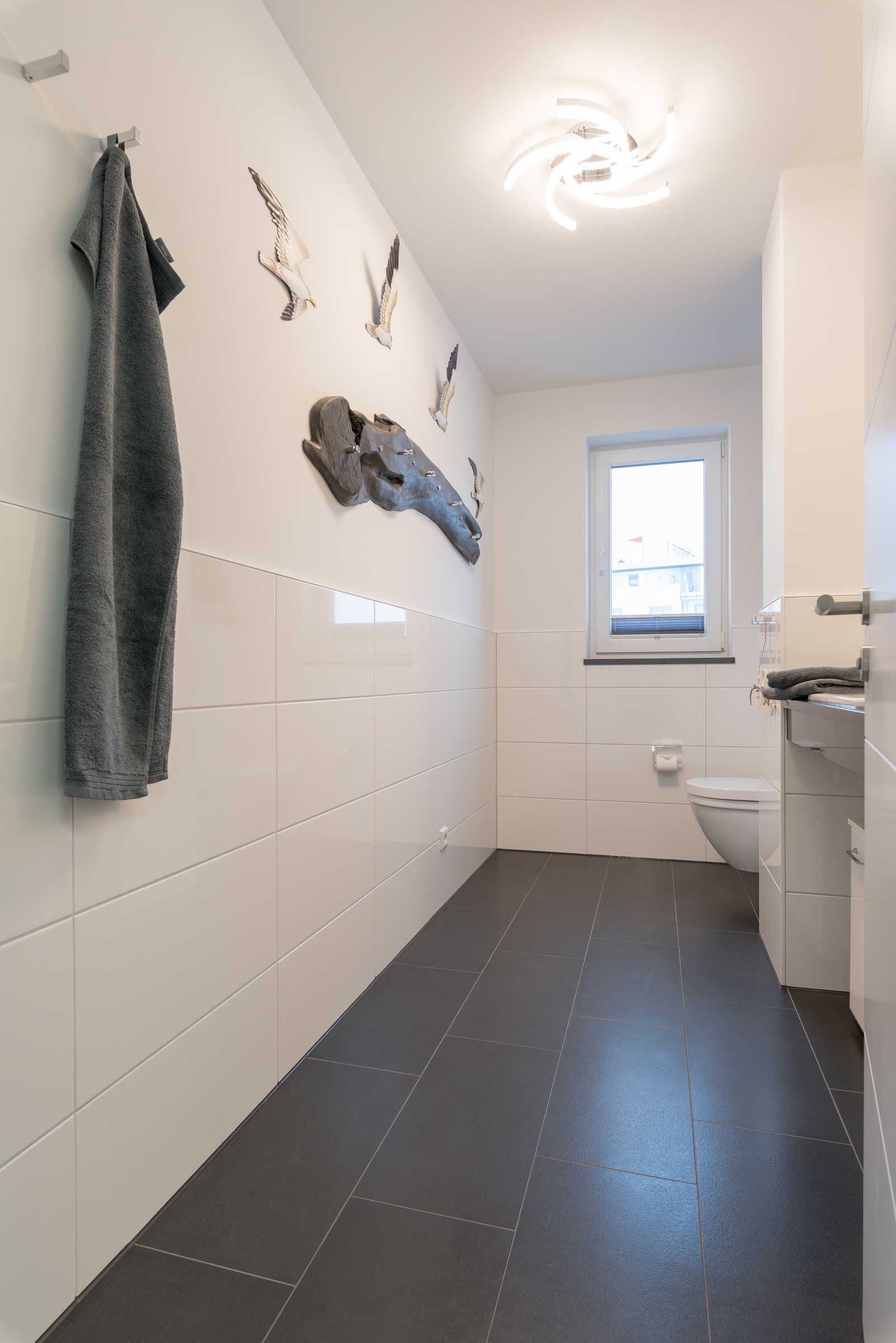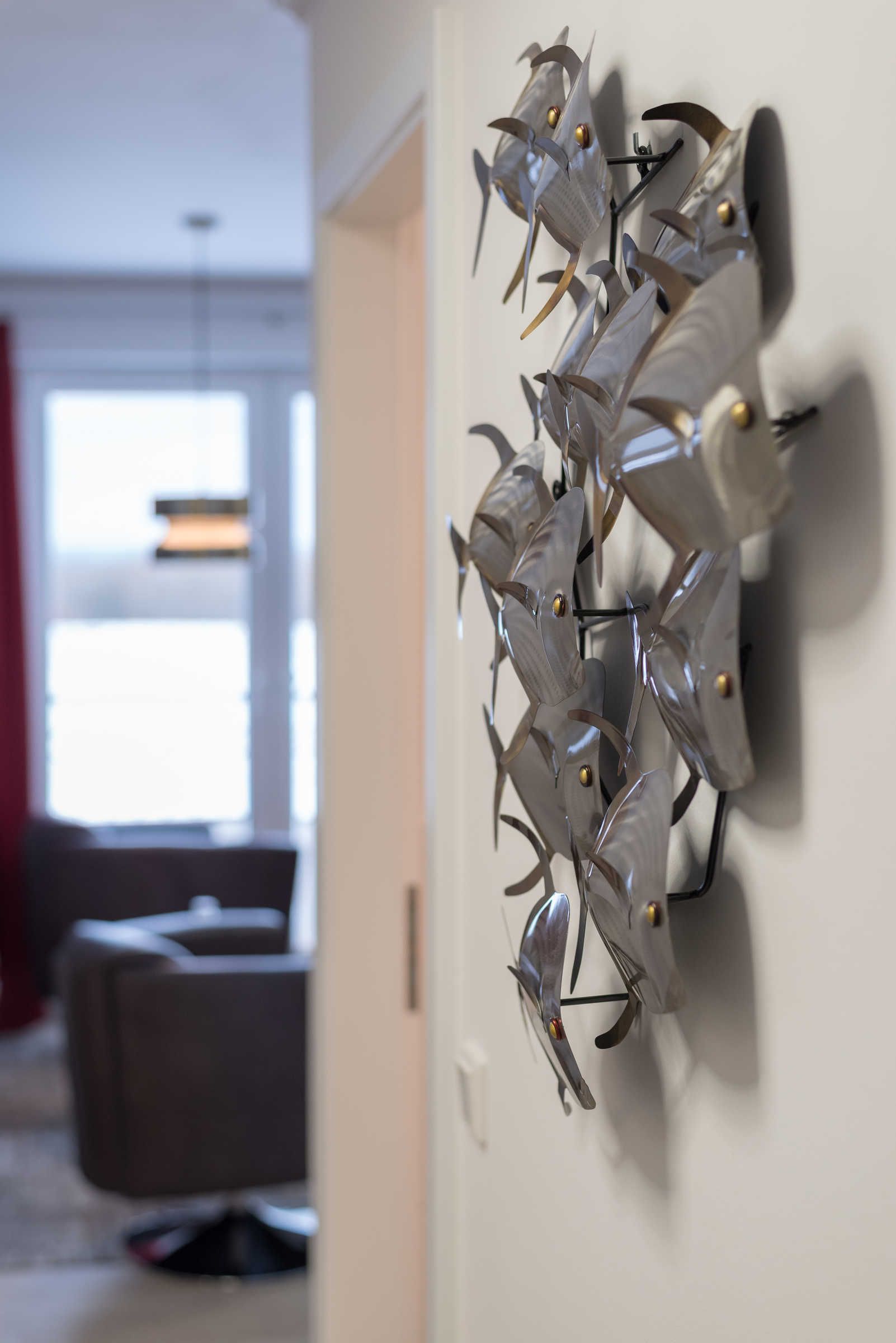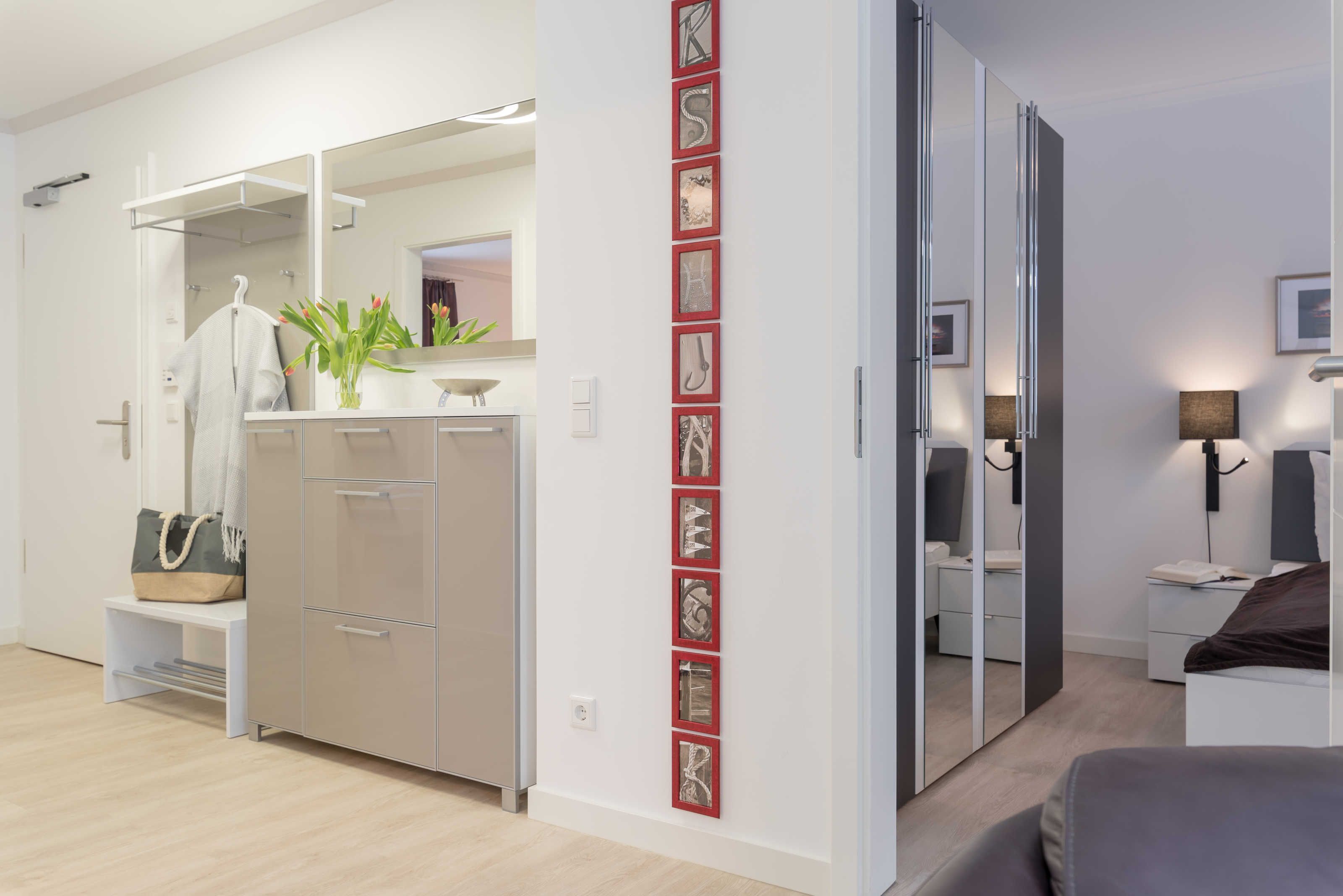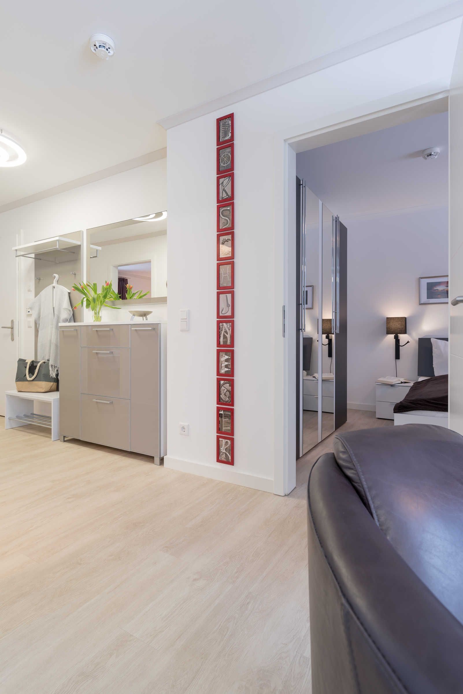 In dem geräumigen Flur steht neben der Garderobe ein Schrank mit einer kleinen Auswahl an Büchern und Spielen.