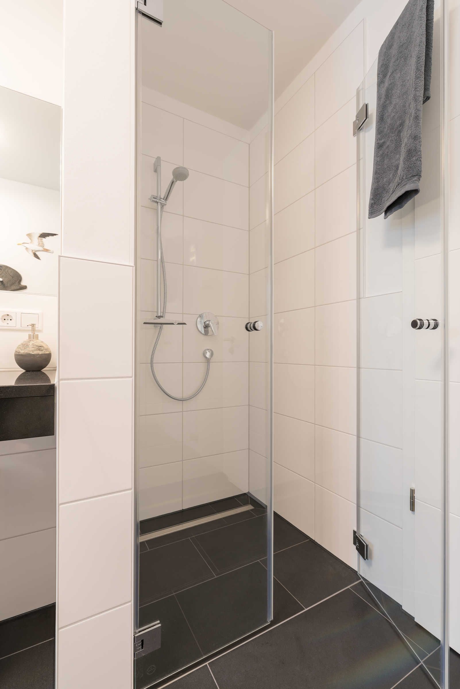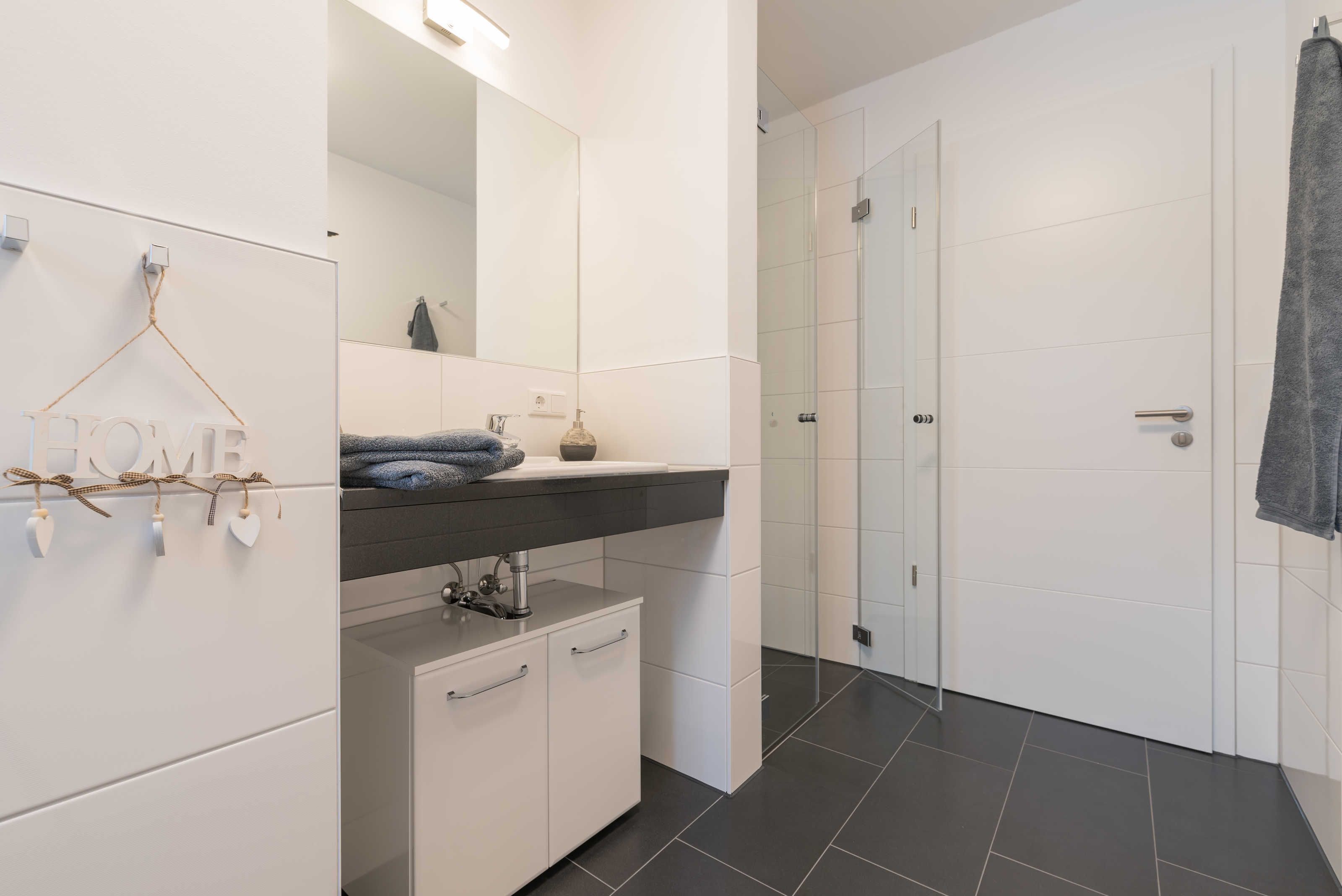 Das Bad ist mit einer ebenerdigen Dusche, einem beleuchteten Wandspiegel und einem Waschtisch samt Unterschrank ausgestattet. Das Badfenster hat ebenfalls ein Fliegengitter.