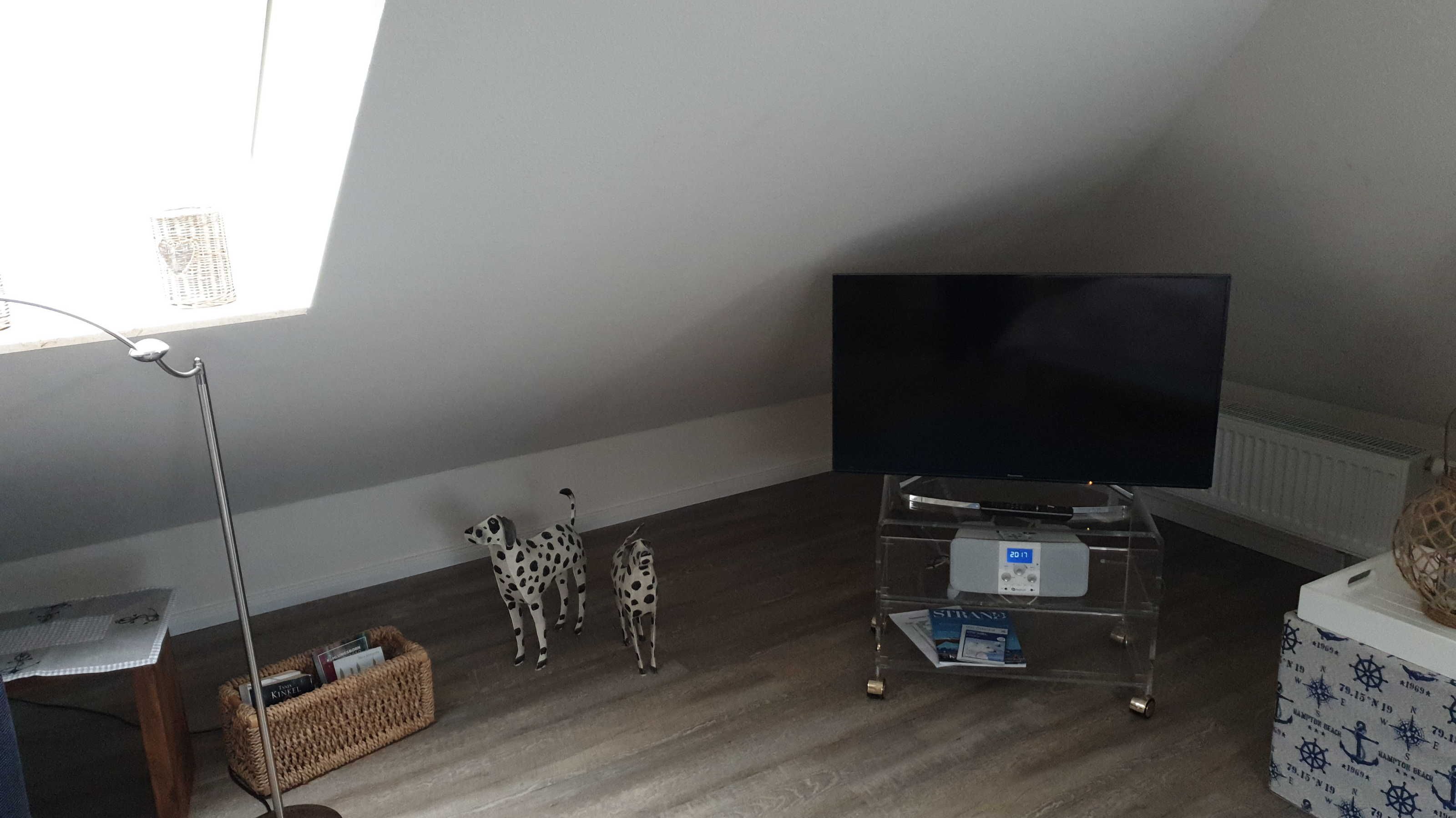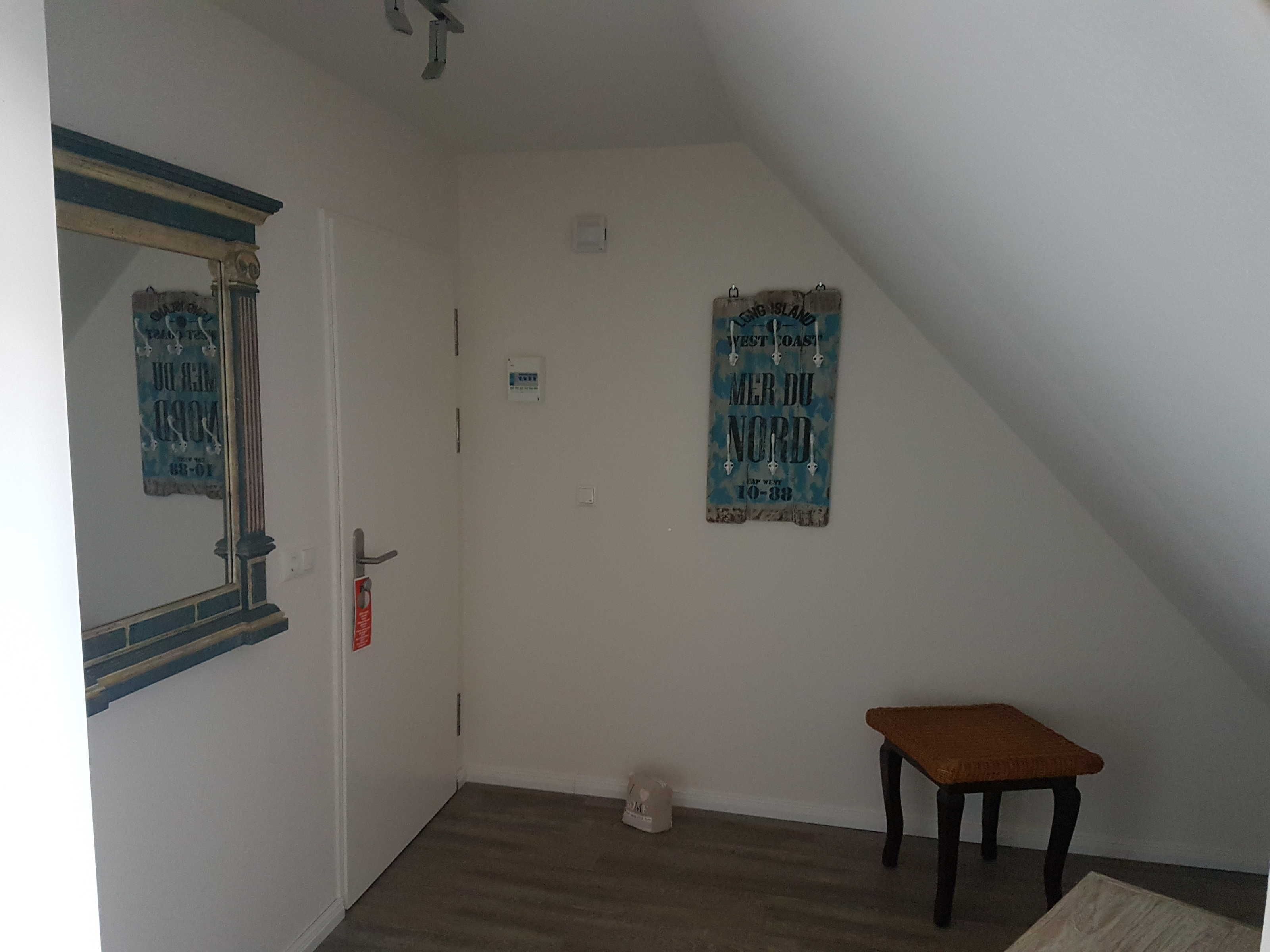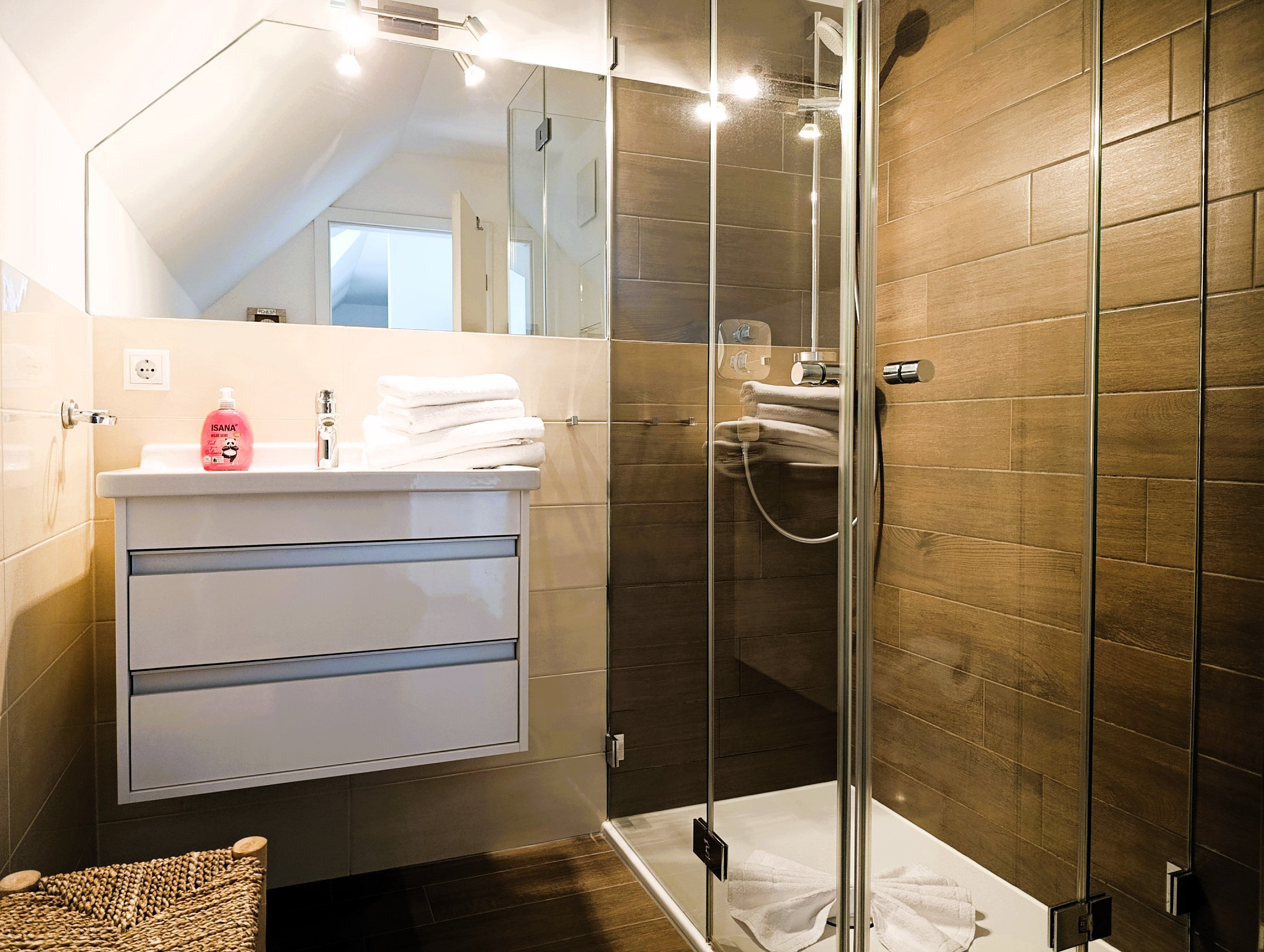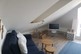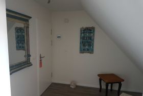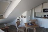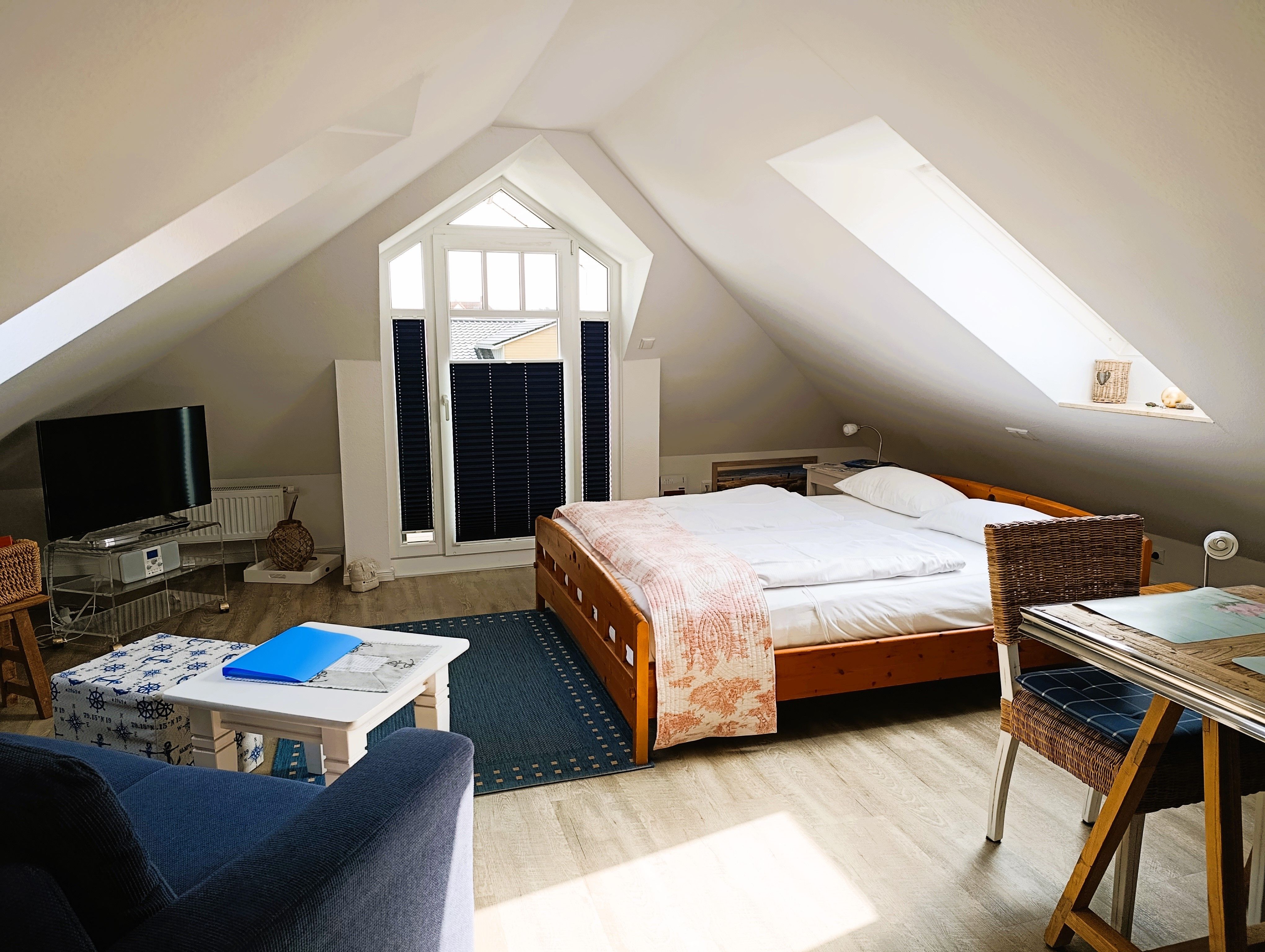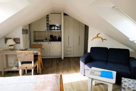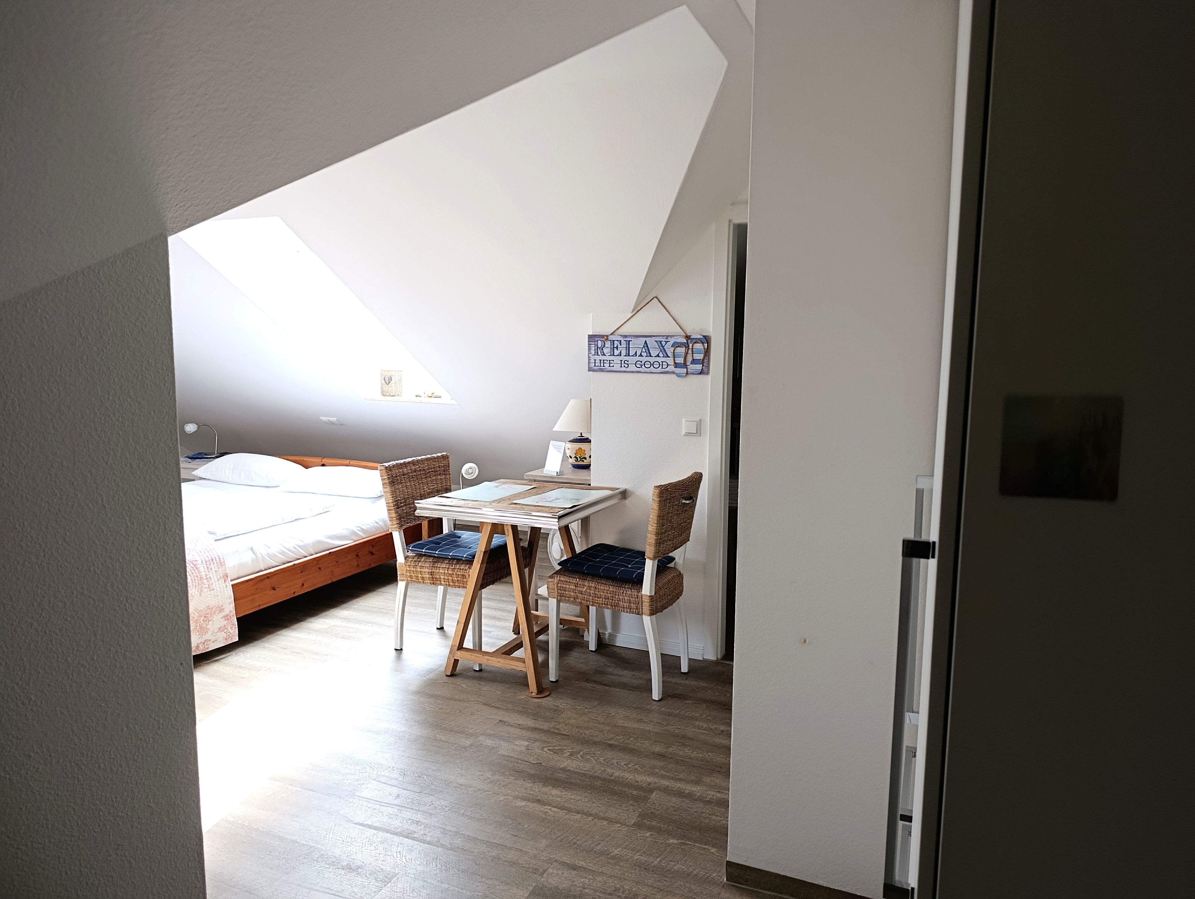 Das funktional gestaltete Ferienzimmer in der 3. Etage hat einen offenen Schlaf-/Wohnbereich, Wohnbereich mit Küchenzeile und Essbereich und einen Balkon. Im Schlafbereich steht ein Doppelbett. Die moderne und praktische Küchenzeile ist mit 2-Platten-Ceranfeld, Kühlschrank mit Gefrierfach, Mikrowelle, Kaffeemaschine und div. Geschirr ausgestattet. Ein Bad mit ebenerdiger Dusche, Waschbecken und WC komplettieren den guten Gesamteindruck des Ferienzimmers.