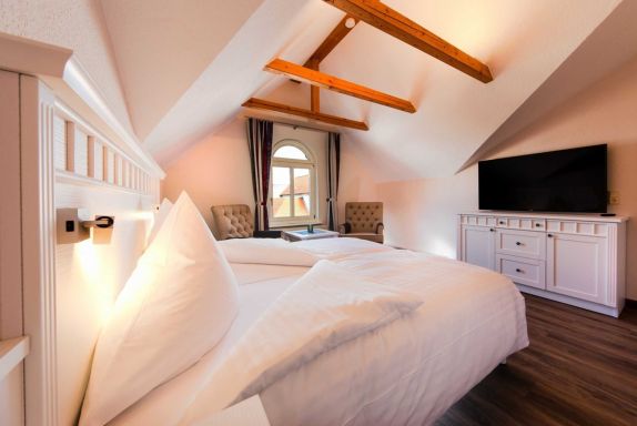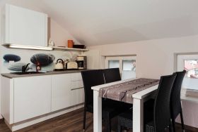 Ein lauschiges Urlaubsnest für 2 Personen - dieses Appartement. Direkt unterm Dach bietet es unseren Feriengästen einen kombinierten Wohn- und Schlafbereich mit zwei gemütlichen Sesseln, eine voll ausgestattete Küche mit Essplatz für ein gemütliches Mahl sowie ein Badezimmer mit Dusche, Waschtisch, WC, Handtuchheizkörper und Föhn.