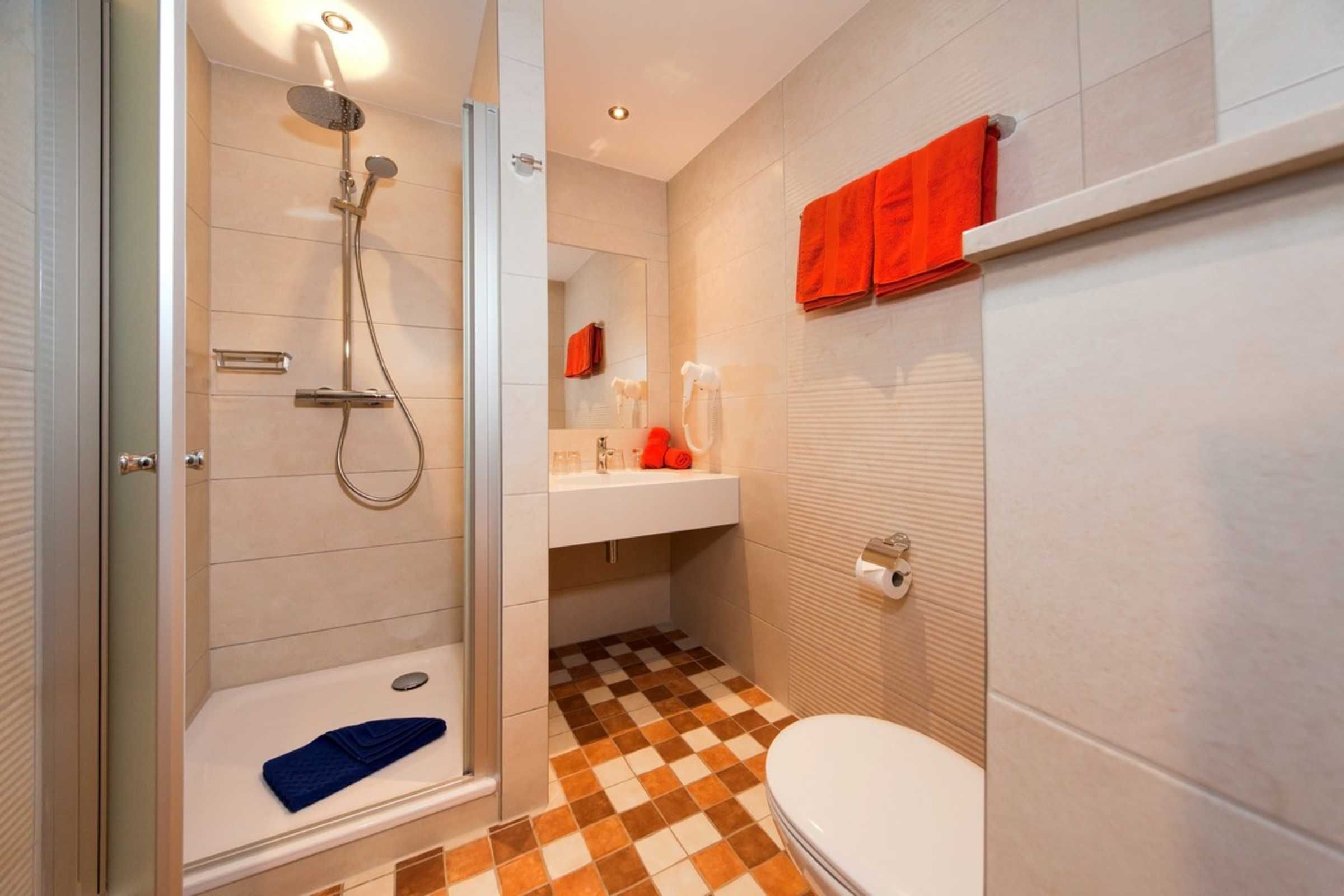 Das Bad ist ausgestattet mit Dusche, Waschtisch, WC, Handtuchheizkörper und Föhn.