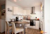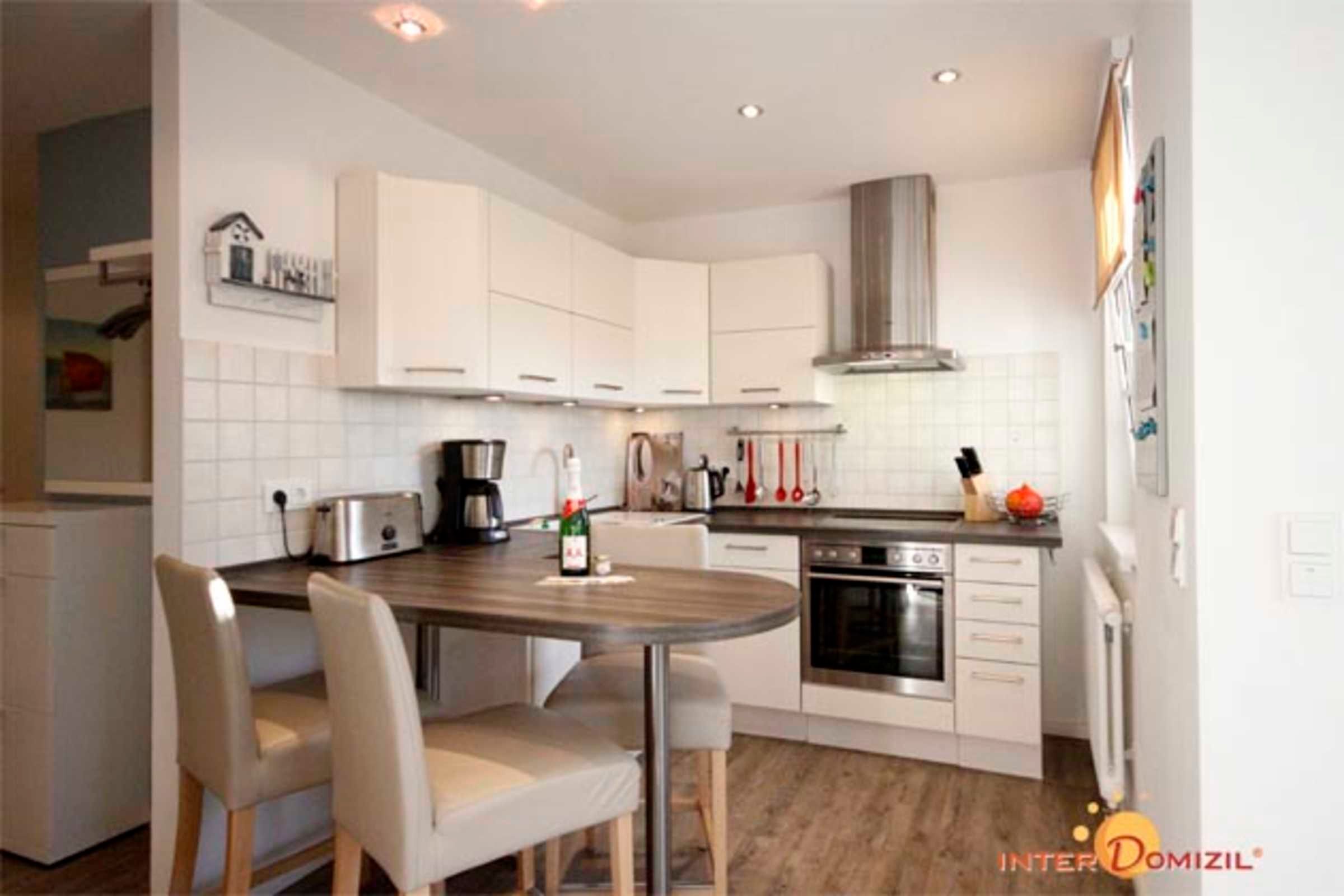 Die Wohnung hat einen großzügigen Wohn-/Essbereich, ausgestattet mit einer modernen Küchenzeile mit Esstisch sowie einem bequemen Sofa, TV mit DVD-Player, Radio und CD-Player.