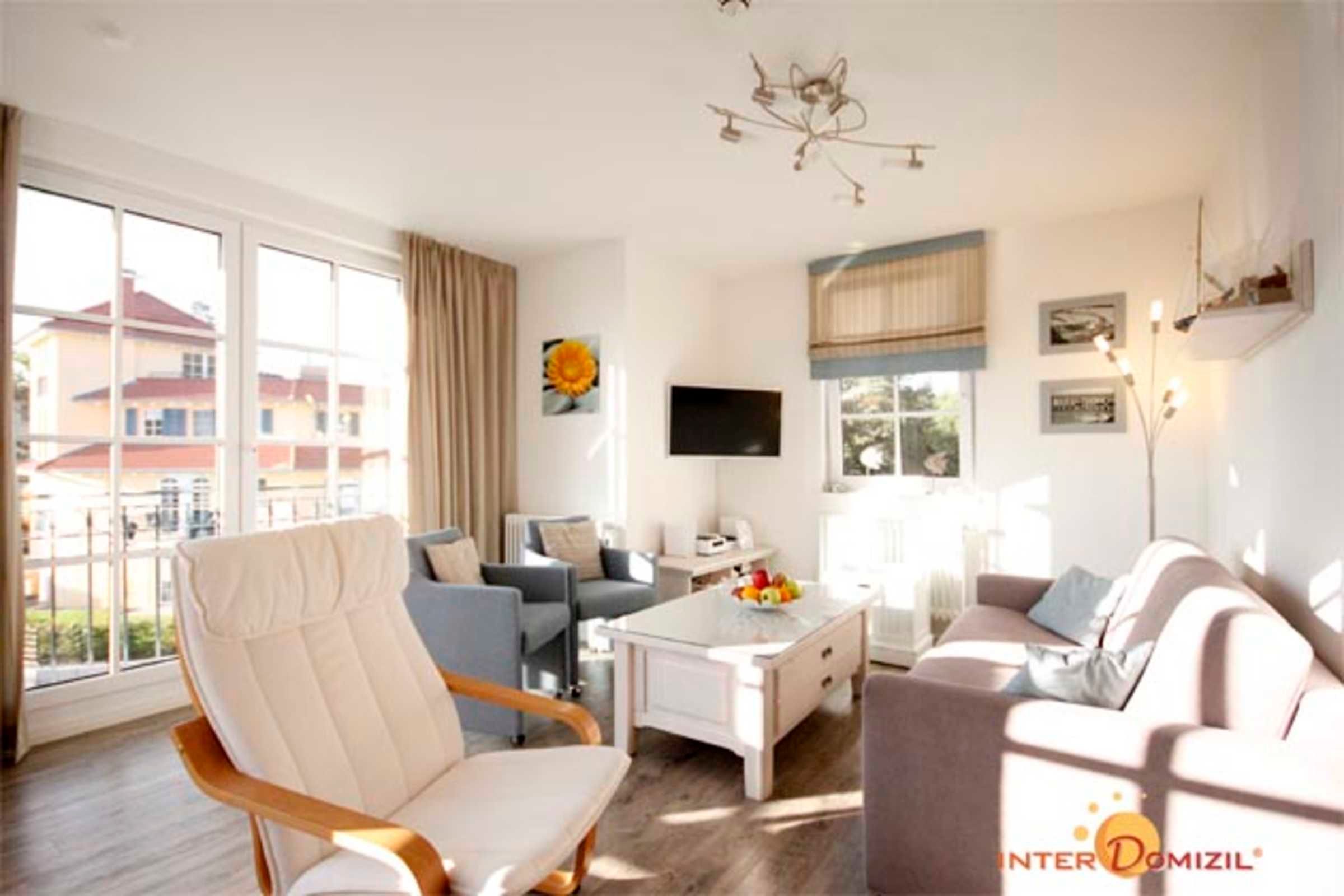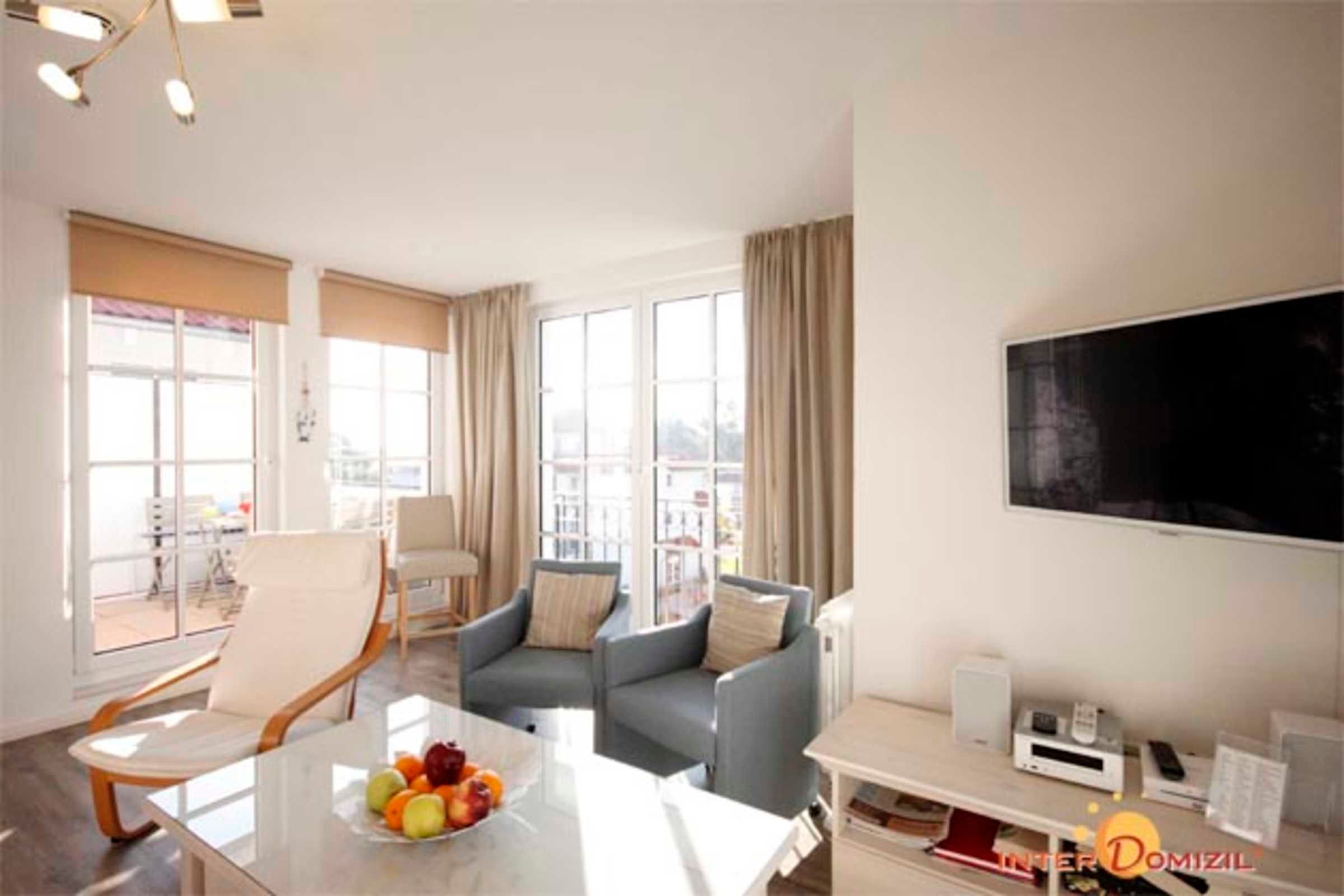Die helle und komfortabel ausgestattete 3-Zimmer-Ferienwohnung Seebrise in großzügiger Ecklage mit Süd-Balkon und eingeschränktem Meerblick liegt ruhig in der dritten Etage der Residenz Haus Meeresblick.