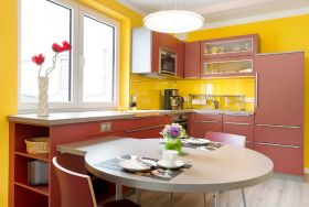 Küche mit Backofen, Mikrowelle, Spülmaschine, Gefrierfach