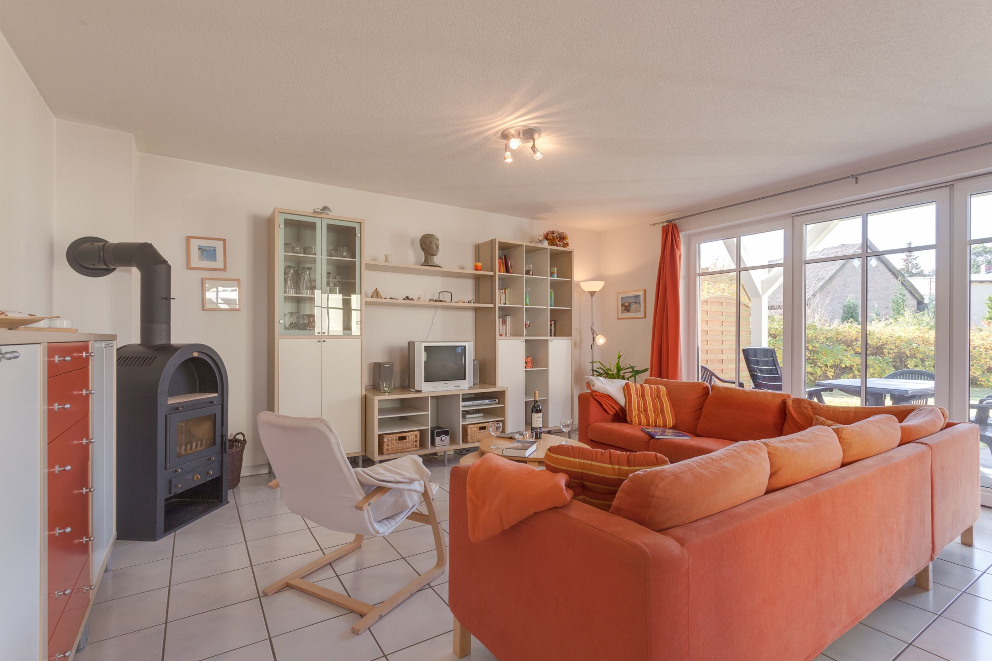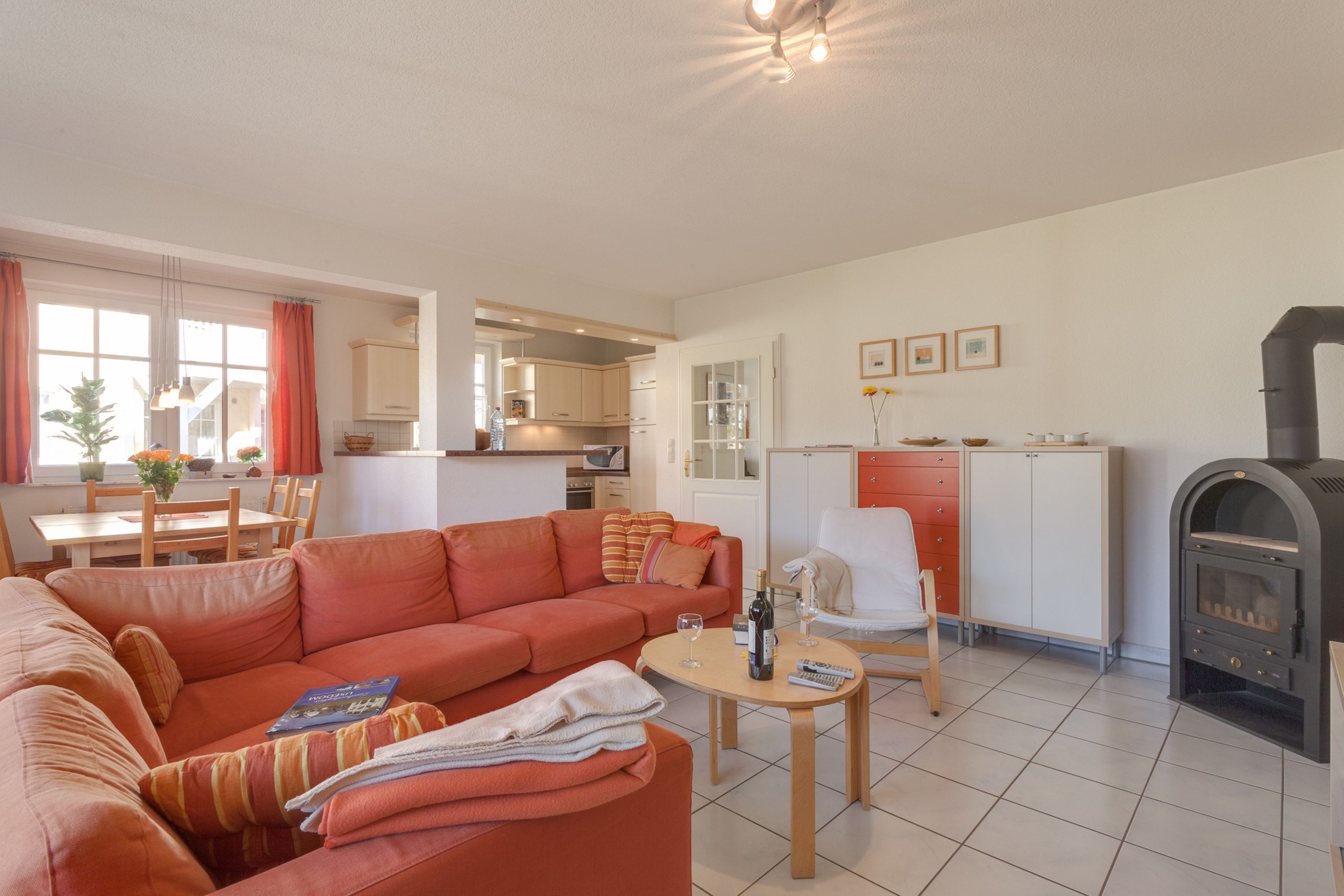 Die großzügige Ferienwohnung im Erdgeschoss mit gehobenem Ambiente betreten Sie über einen eigenen Hauseingang. Sie verfügt über ein großes Wohnzimmer mit gemütlicher Couchlandschaft und Kaminofen sowie einen hellen Essbereich mit integrierter Markeneinbauküche. An den mit hellen Villeroy&Boch-Fliesen ausgelegten sonnigen Wohnraum schließt sich eine große, nach Südwesten ausgerichtete überdachte Terrasse mit Gartenmöbeln an, auf der Sie entspannt die lauen Sommerabende genießen können. Die moderne Küche in hellem Ahorn besteht aus einem Cerankochfeld mit Backofen, Geschirrspüler, Mikrowelle, Kühl-Gefrierkombination, Kaffeemaschine, Wasserkocher, Toaster sowie reichlich Geschirr, Töpfen uvm..