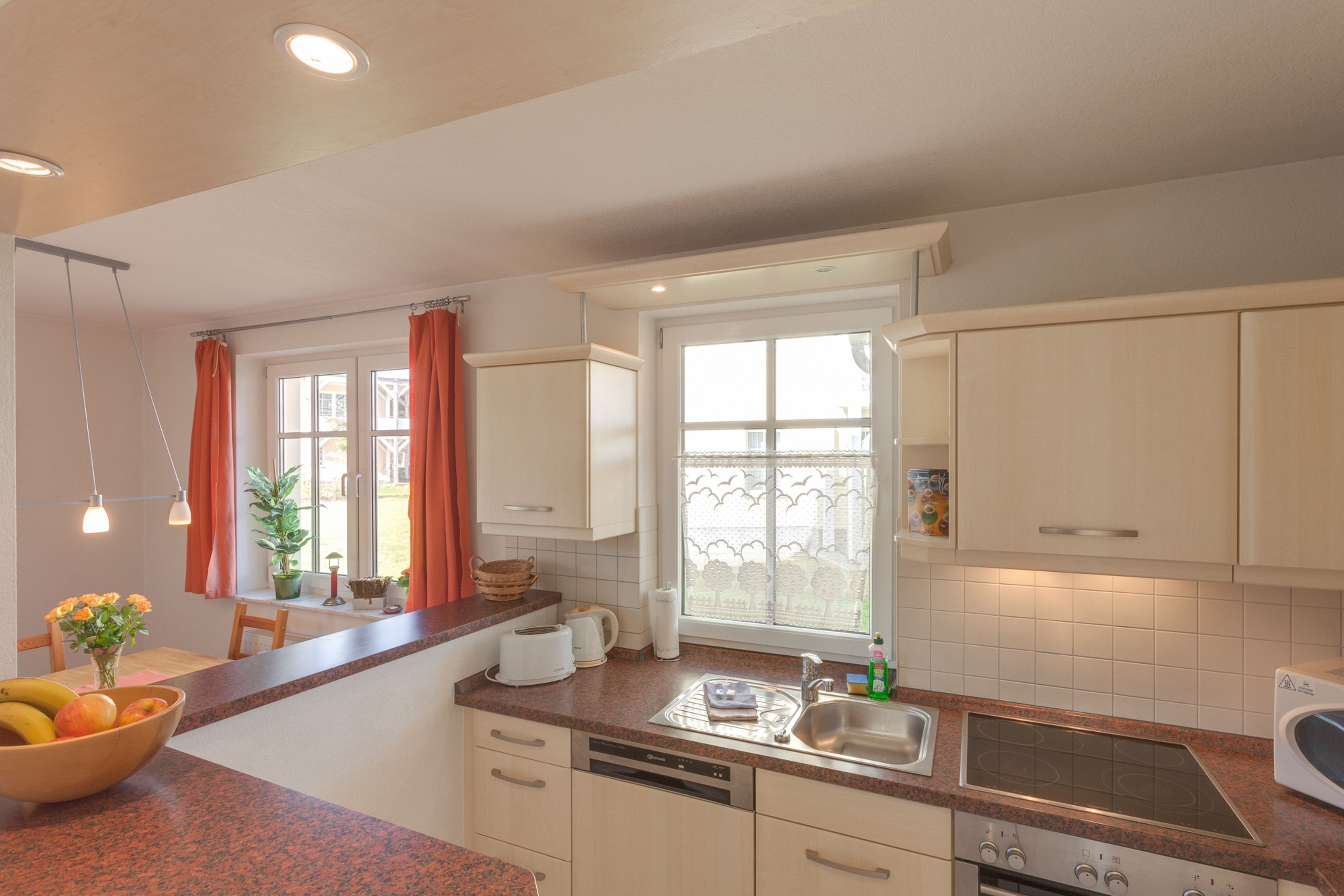 Die großzügige Ferienwohnung im Erdgeschoss mit gehobenem Ambiente betreten Sie über einen eigenen Hauseingang. Sie verfügt über ein großes Wohnzimmer mit gemütlicher Couchlandschaft und Kaminofen sowie einem hellen Essbereich mit integrierter Markeneinbauküche. An den mit hellen Villeroy&Boch-Fliesen ausgelegten sonnigen Wohnraum schließt sich eine große, nach Südwesten ausgerichtete überdachte Terrasse mit Gartenmöbeln an, auf der Sie entspannt die lauen Sommerabende genießen können. Die moderne Küche in hellem Ahorn besteht aus einem Cerankochfeld mit Backofen, Geschirrspüler, Mikrowelle, Kühl-Gefrierkombination, Kaffeemaschine, Wasserkocher, Toaster sowie reichlich Geschirr, Töpfen uvm..
