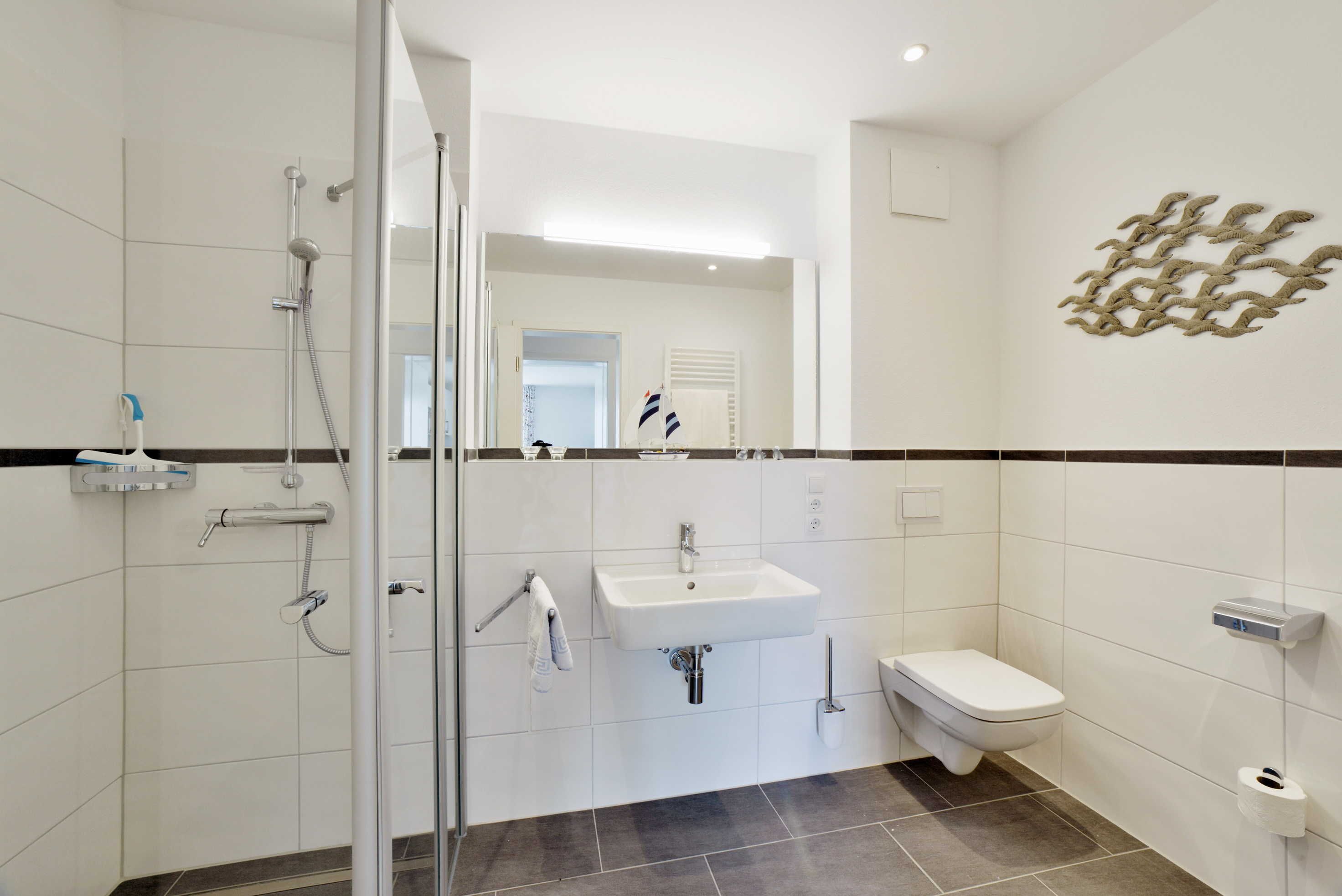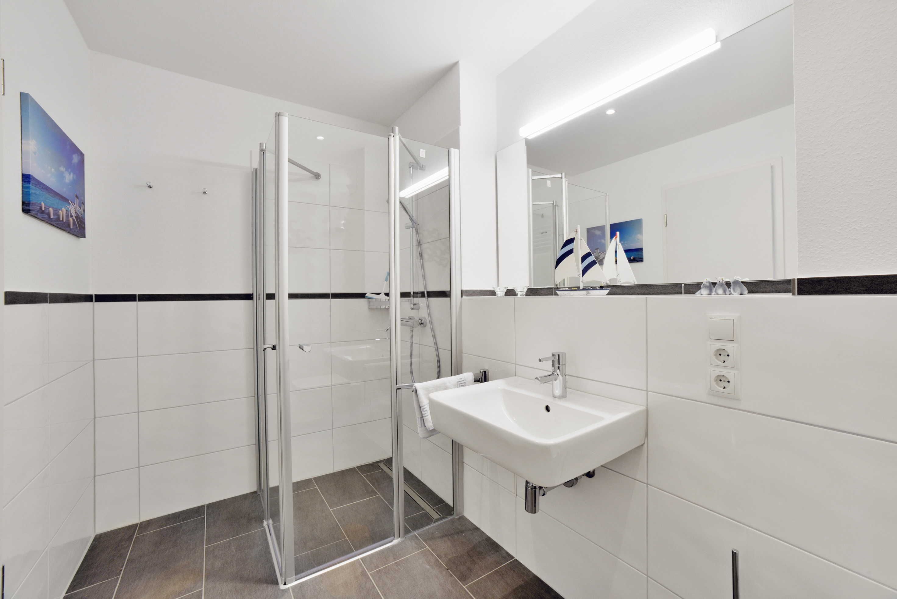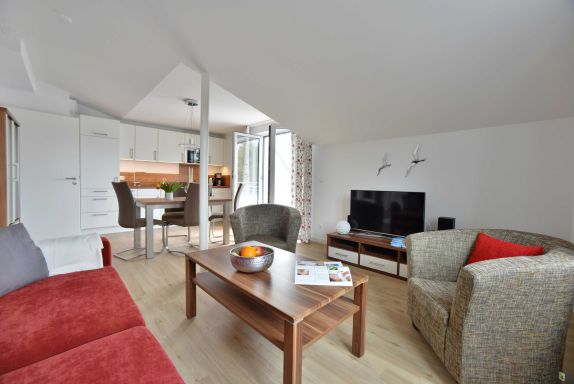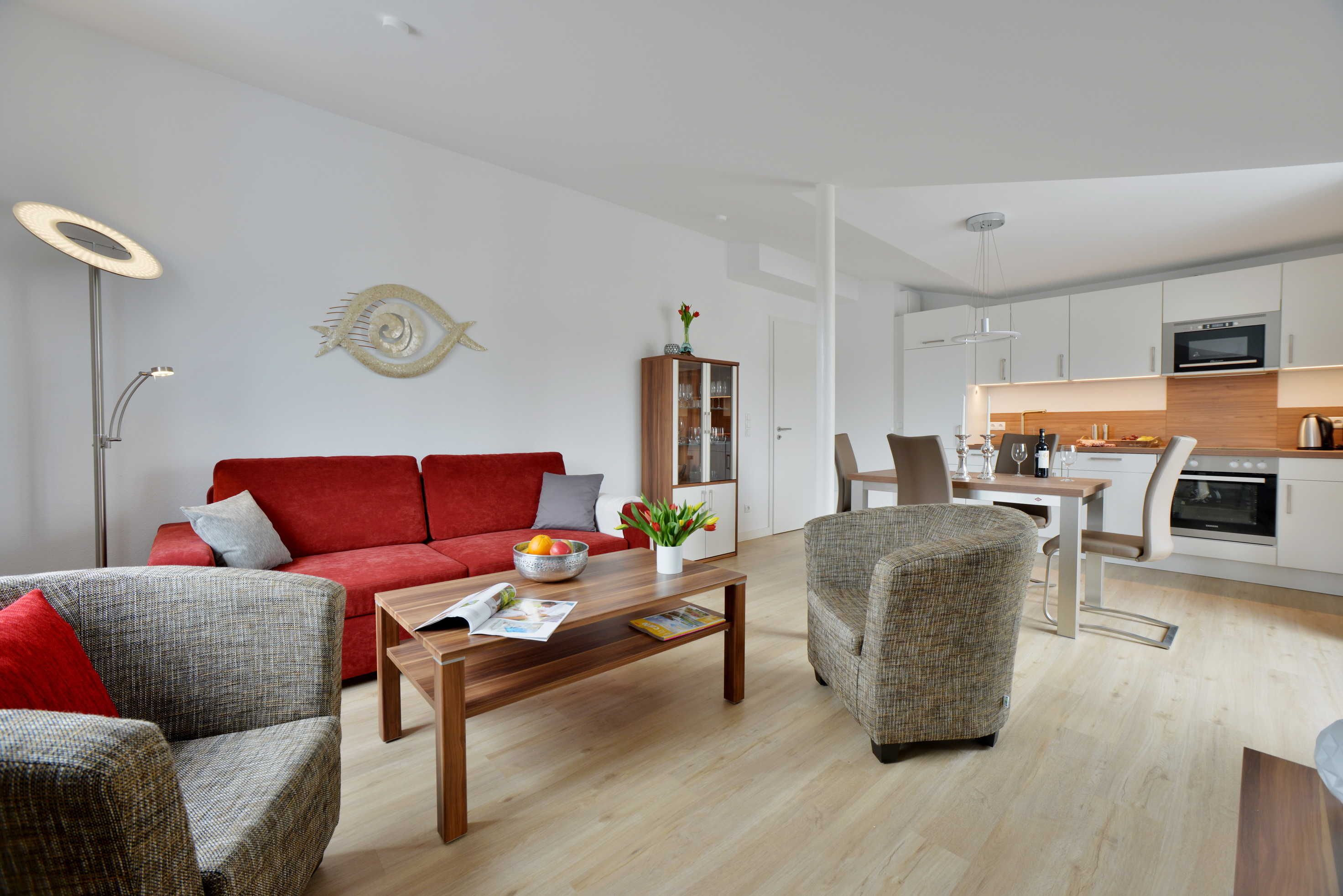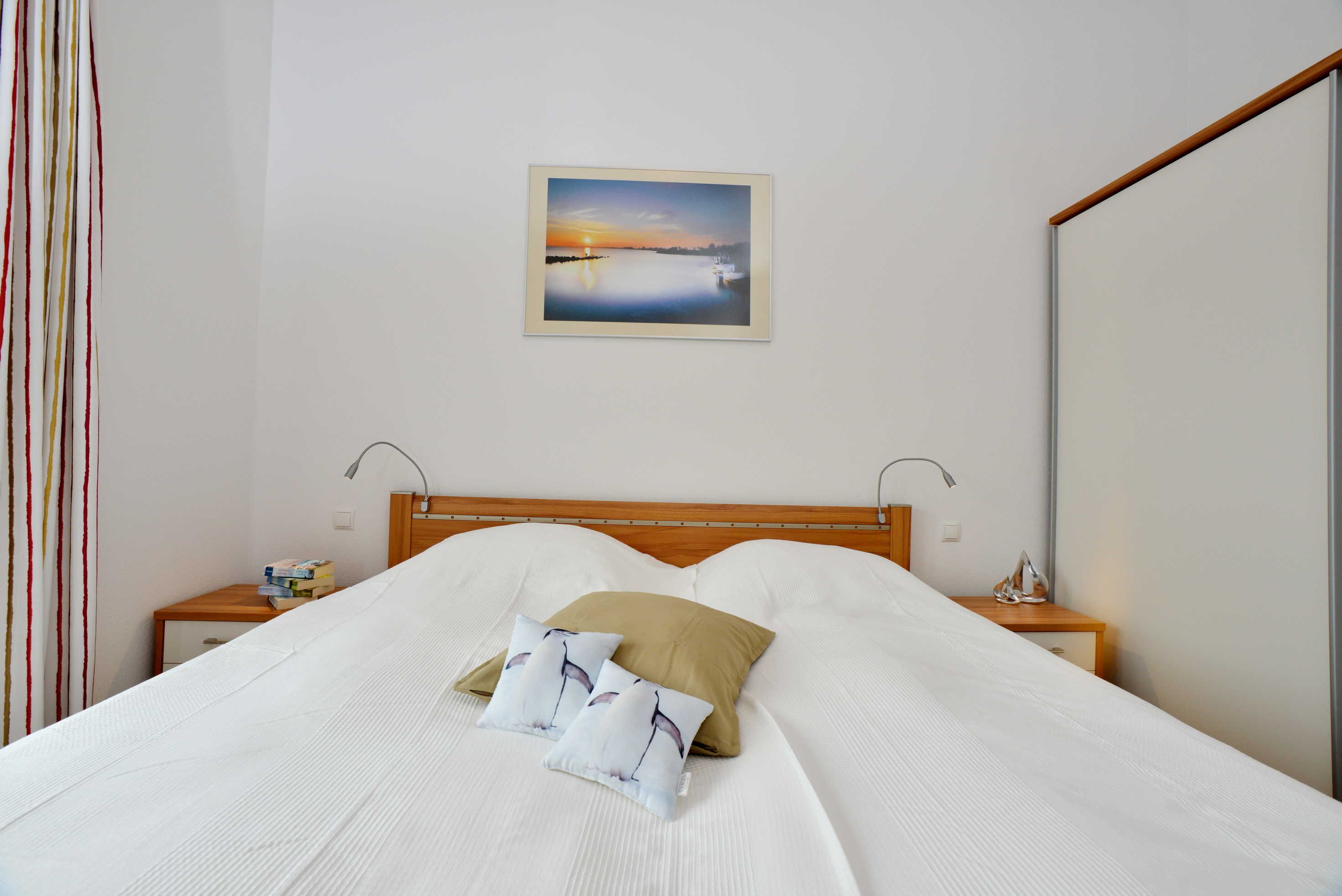 Die Ferienwohnung Strandkorb verfügt über ein Doppelbett im Schlafzimmer und eine Schlafcouch im Wohnbereich. Ein Kinder-/ Babybett kann zugestellt werden.