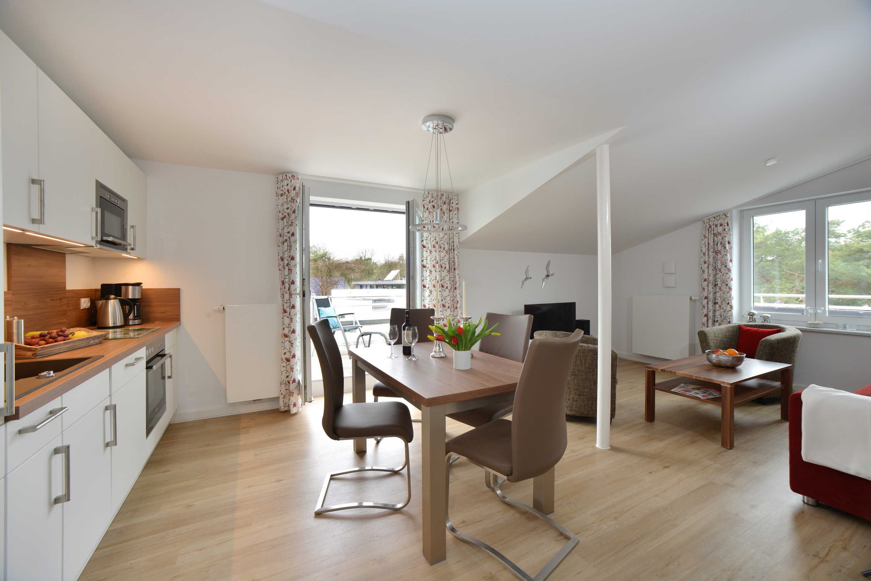 Die Ferienwohnung verfügt über ein Doppelbett im Schlafzimmer und eine große, bequeme Schlafcouch im Wohnbereich. Die modern und umfangreich ausgestattete Küche und der liebevoll eingerichtete Essbereich lassen keine Wünsche offen.