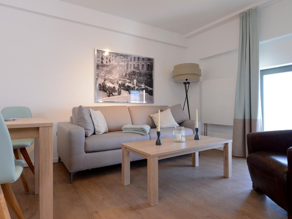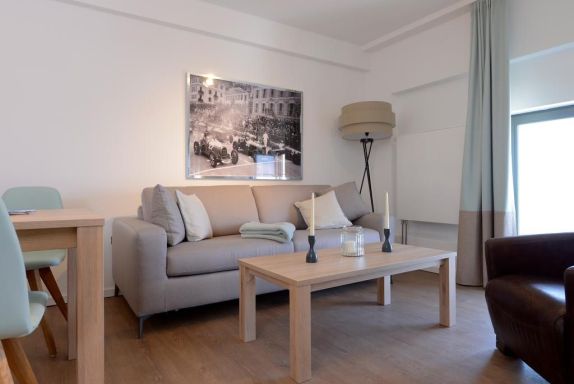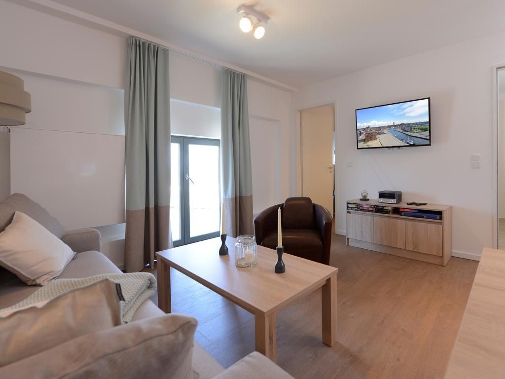 Hier residieren Sie in der 6. Etage des Ohlerich Speichers. Durch den Lift ist dieses einfach zu erreichen. Das stilvoll eingerichtete 2-Zimmer-Appartement bietet auf 51m² Wohnfläche Platz für 2 Personen. Der geräumige Wohn- und Essbereich lädt mit einer gemütlichen Couch, einem