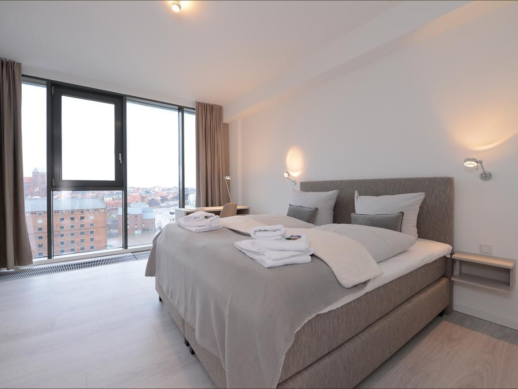 Das exklusive 3-Zimmer-Appartement in der 7. Etage, verfügt über 94m² Wohnfläche und einer Terrasse mit spektakulärem Ausblick. Bis zu 6 Personen können hier einen traumhaften Urlaub verbringen. Das Wohn- / Esszimmer mit integrierter Küche ist sehr geschmackvoll mit einem Sofa, einer Essecke und einem TV- Gerät ausgestattet. Von dort haben Sie den Zugang zur Dachterrasse.