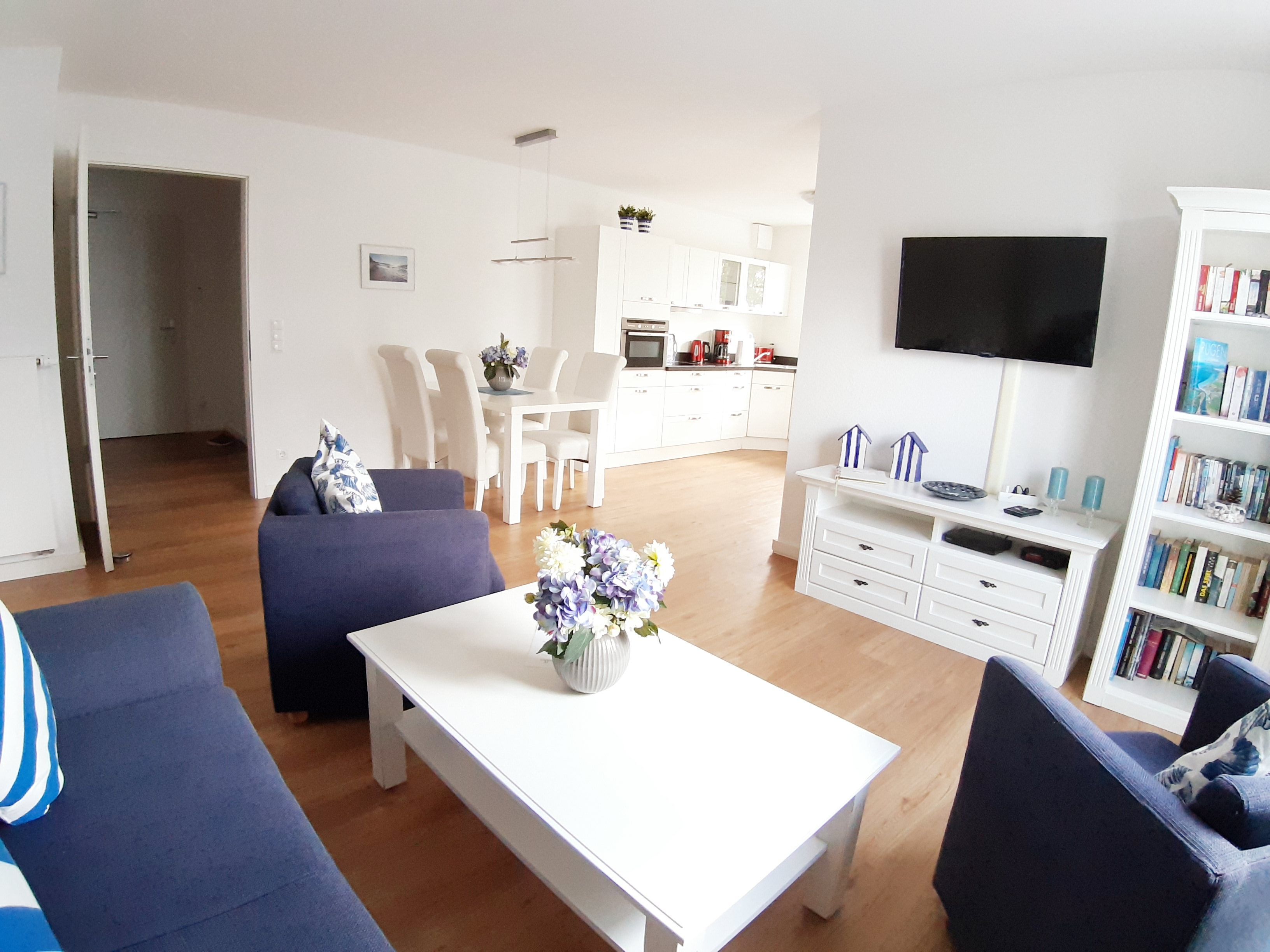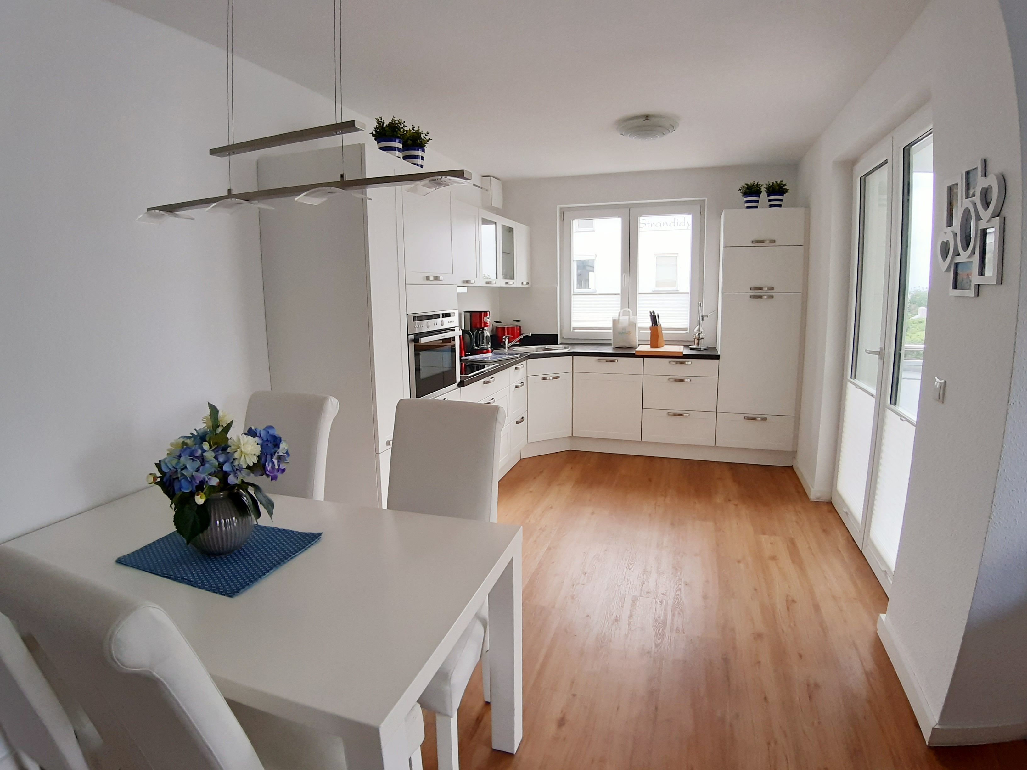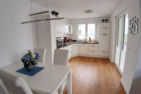 Die Küche ist exklusiv ausgestattet mit allen dazu gehörenden technischen Geräten wie Spülmaschine, Kühlschrank mit Gefrierfach und hoch eingebautem Backofen.