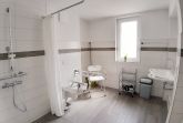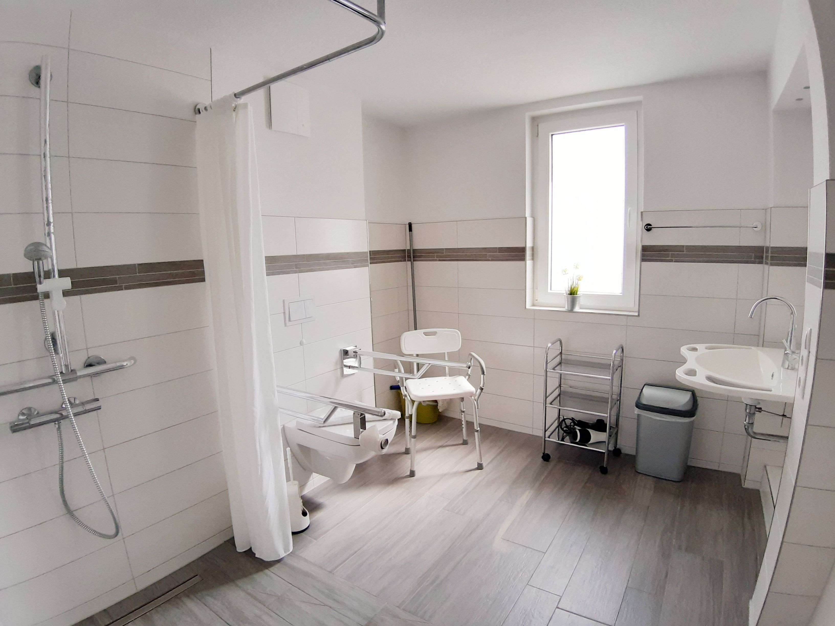 Es sind zwei Bäder vorhanden. Ein Gäste-WC und ein Bad mit barrierefreier Dusche, einem unterfahrbaren Waschbecken mit Haltegriffen sowie HEWI-Haltegriffen an der Toilette.