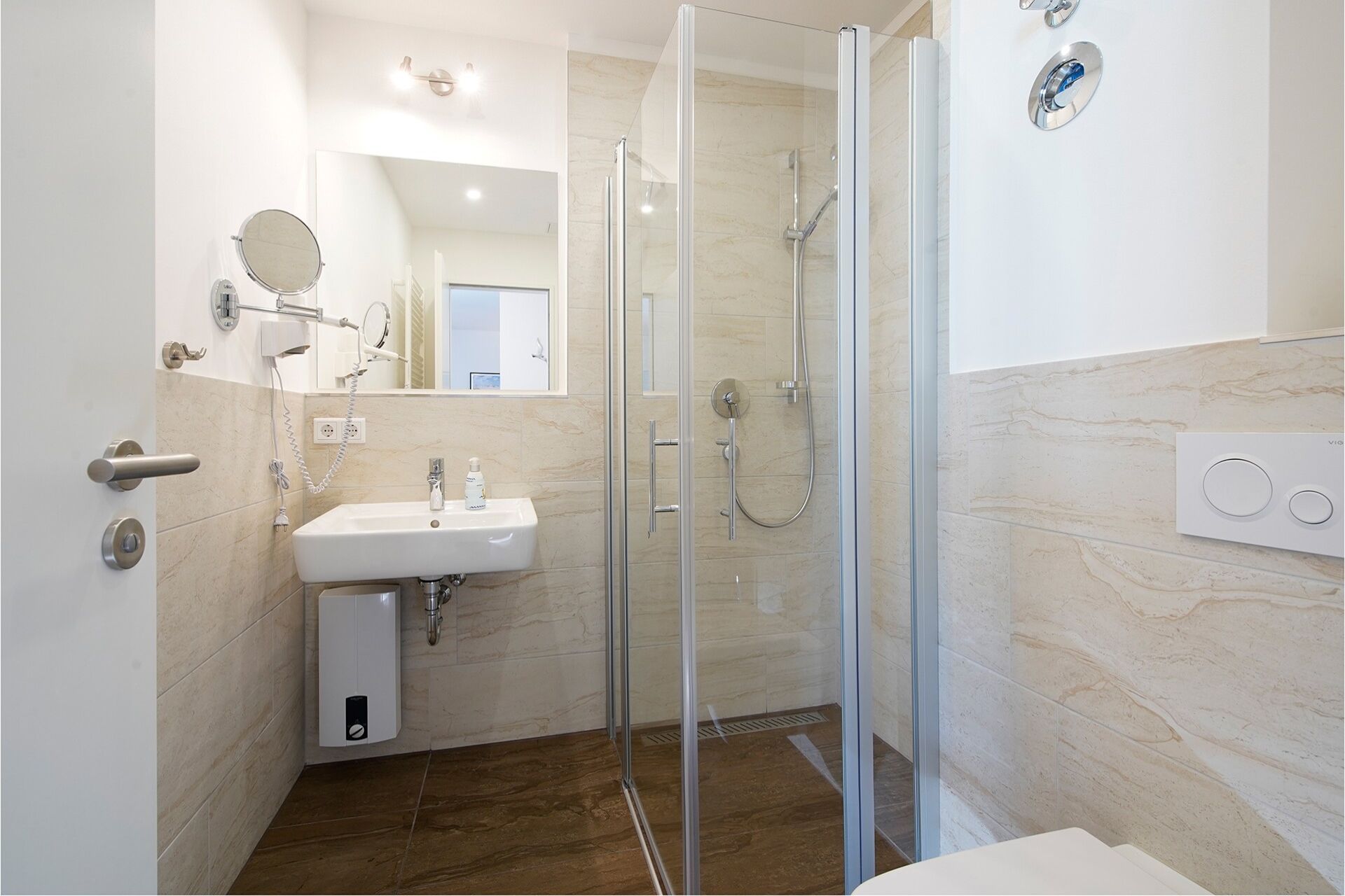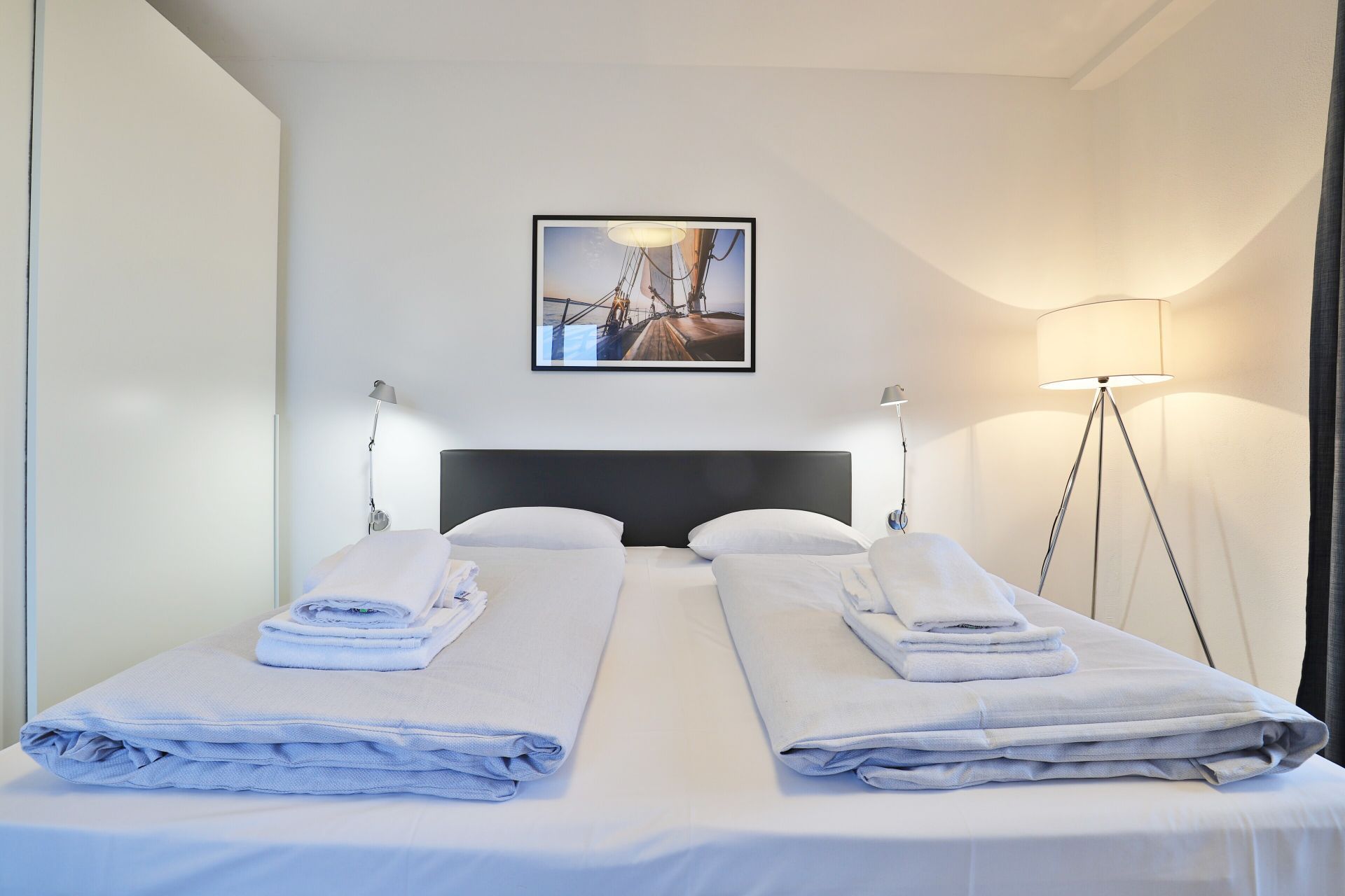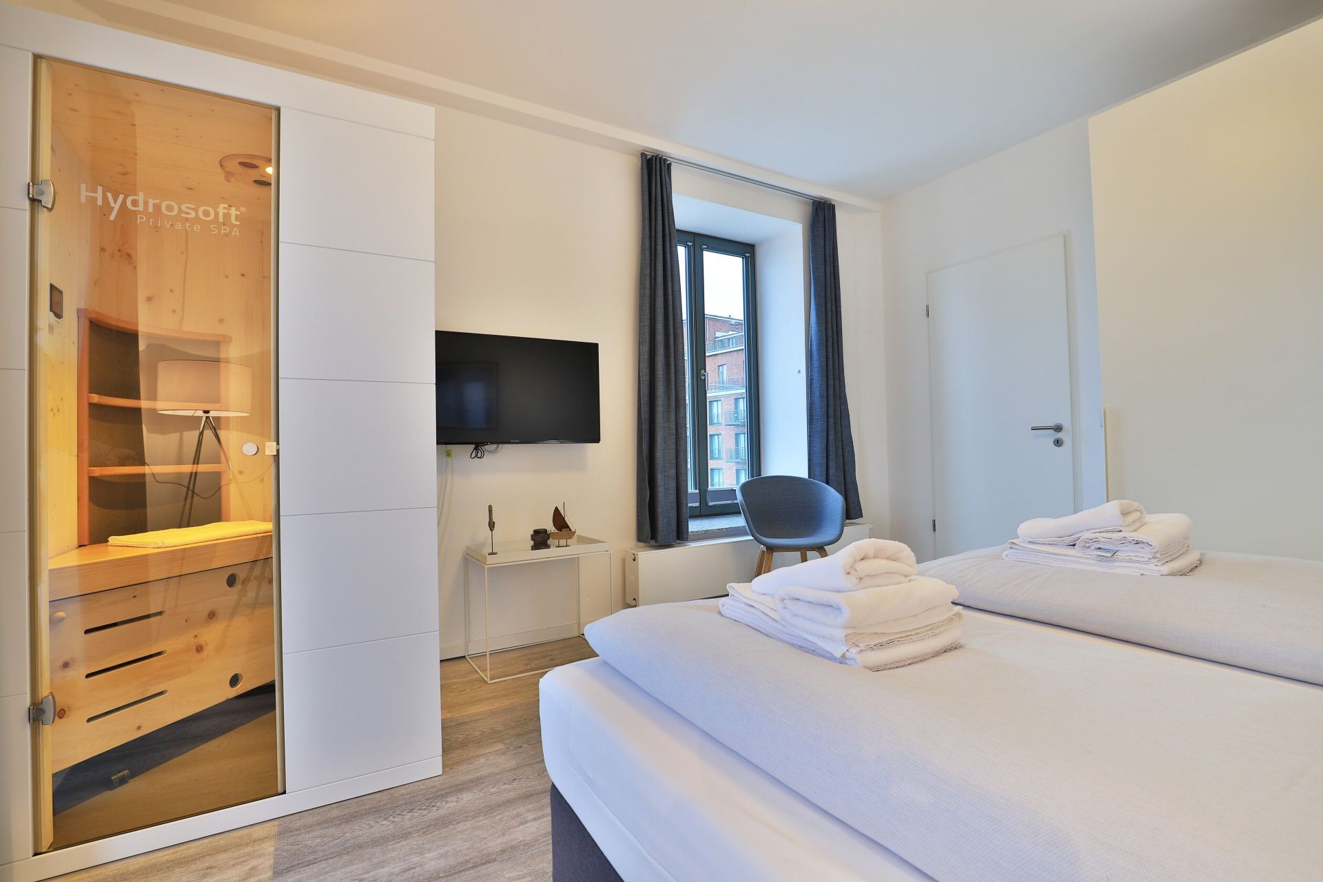 Appartementhaus mit 48 Appartements. Das stilvolle 2- Zimmer-Appartement befindet sich im 4. Obergeschoss des Speichers, dass leicht über den Lift zu erreichen ist. Bis zu 4 Personen können hier auf 57 m² einen Urlaub der Extraklasse verbringen. Das Appartement ist sehr modern eingerichtet und lässt somit wirklich keine Wünsche mehr offen. Das Appartement verfügt über ein Wohn-/Esszimmer , eine Küche ein exklusiv ausgestattetes Schlafzimmer und ein Badezimmer in einer hochwertigen Ausstattung. Die Küche ist komplett ausgestattet mit Mikrowelle, Geschirrspüler, Kaffeemaschine, Wasserkocher, Kühlschrank u.v.m..Von diesem eleganten Appartement können Sie eine spektakuläre Aussicht genießen. Bei Anreise sind 2 Betten bezogen und Handtücher liegen für Sie bereit. WLAN steht Ihnen kostenfrei zur Verfügung. In unmittelbarer Nähe sind öffentliche Parkplätze vorhanden. Einzigartig im Haus: Genießen Sie die Hydrosoft-Infrarotsauna Wellness auf höchstem Niveau! Mit nur 38°C und 6080 % Luftfeuchtigkeit ist sie besonders gesundheitsfreundlich.