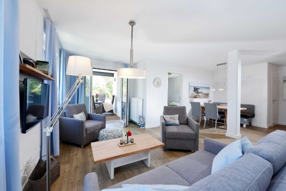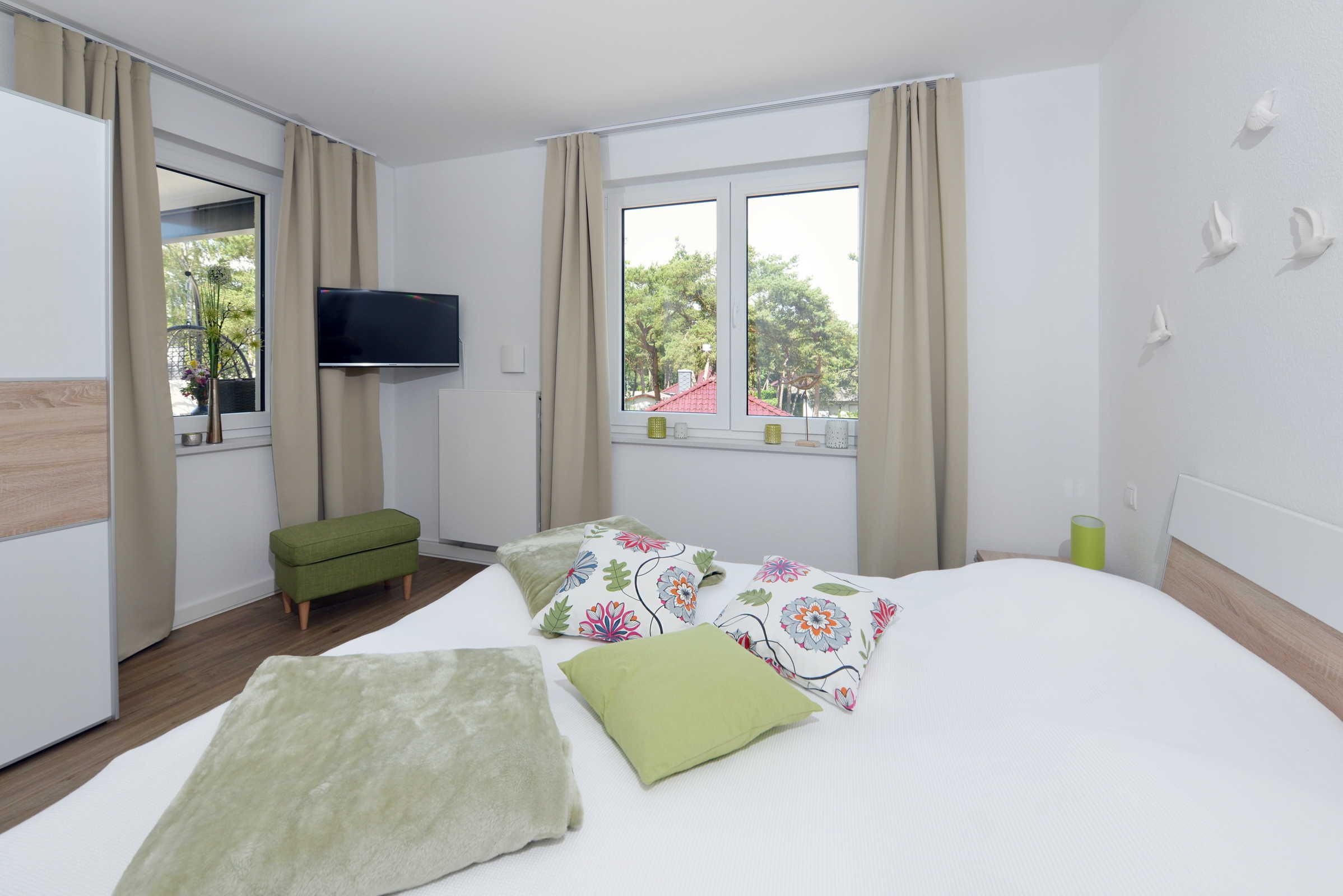 Ihr Urlaubsdomizil besitzt ein Schlafzimmer mit Doppelbett, im Wohnbereich finden Sie eine gemütliche Couch mit Schlaffunktion und einen Flatscreen-TV, einen Essbereich sowie die mit allen Annehmlichkeiten ausgestattete Küche.