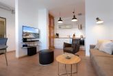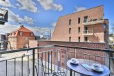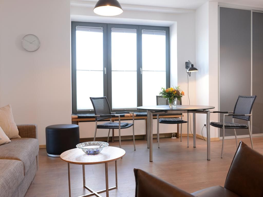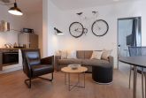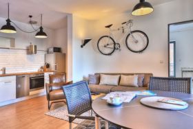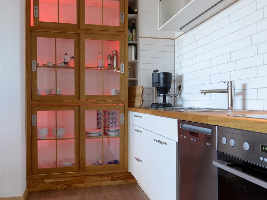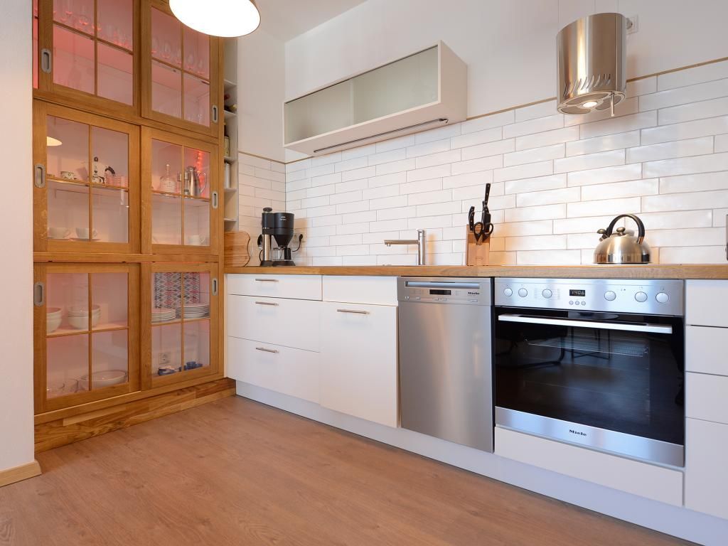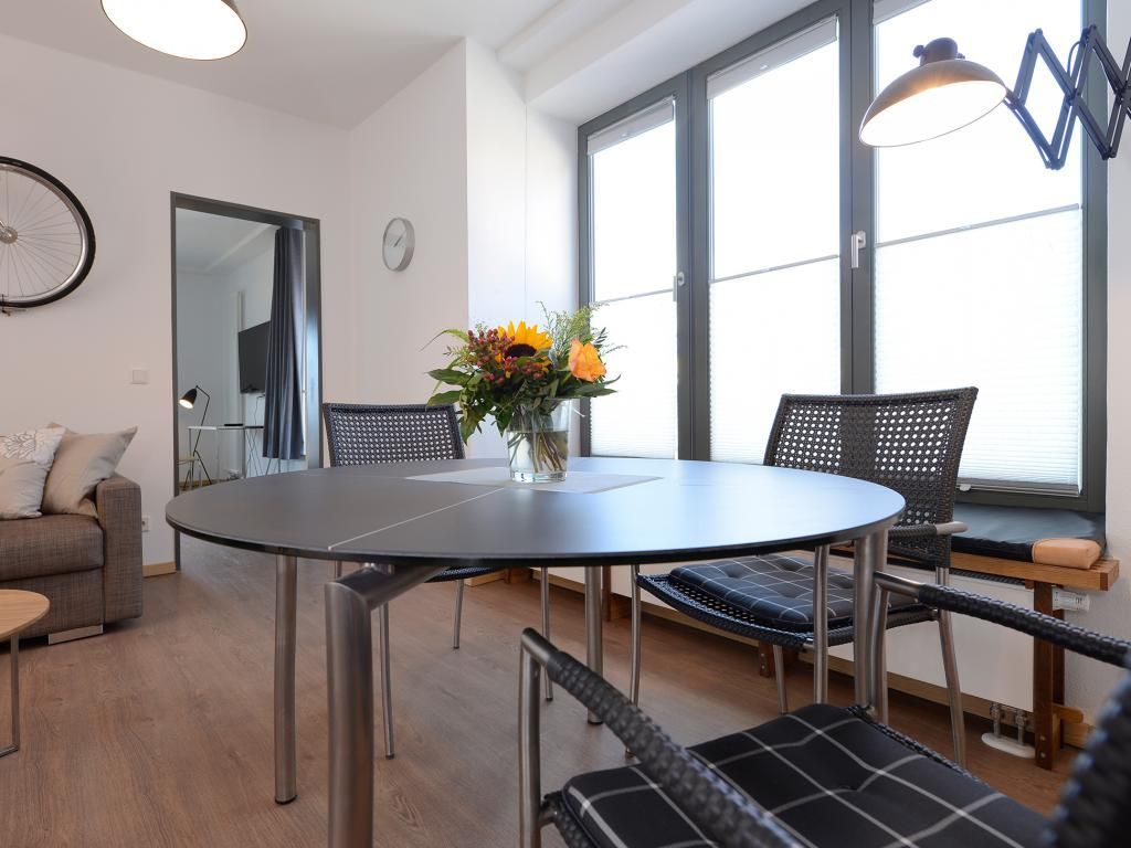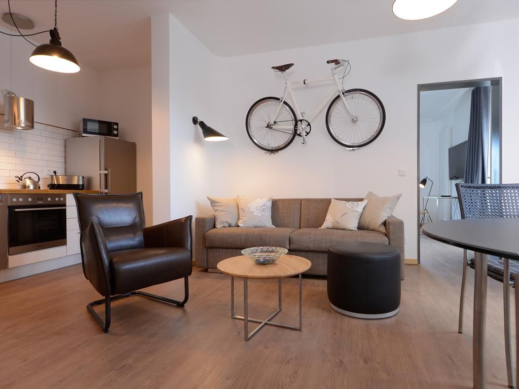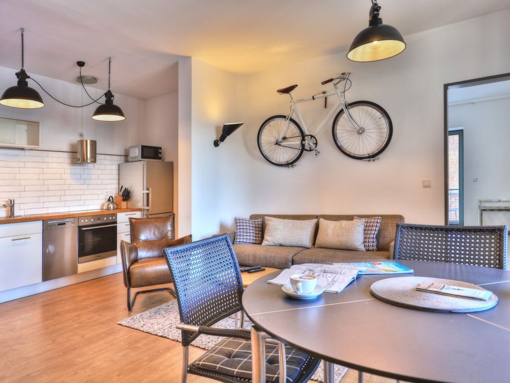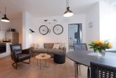 Das hochwertig eingerichtete 2-Zimmer-Appartemnet befindet sich in der 1. Etage dieses außergewöhnlichen Gebäudes und bietet einen Urlaub der Extraklasse. Auf 57 m² Wohnfläche können 4 Personen einen unbeschwerten Urlaub verbringen. Das Appartement verfügt über einen hellen, geschmackvoll eingerichteten Wohnraum mit Fernseher und integrierter Küche, die voll ausgestattet ist (u.a. mit Geschirrspüler, Mikrowelle, Kaffeemaschine, Wasserkocher).Von dort aus haben Sie Zugang auf den Balkon. Das moderne Schlafzimmer ist mit einem Doppelbett eingerichtet. Des Weiteren verfügt das Appartement über ein Duschbad in hochwertiger Ausführung.