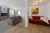 Im Wohnbereich finden Sie eine vollständig ausgestattete Küche, einen Essbereich, eine gemütliche Couchecke mit Flatscreen-TV und Blu-ray-Player sowie den Zugang zur großzügigen Terrasse mit Gartenmöbeln. Außerdem ist eine separate Schlafcouch vorhanden.