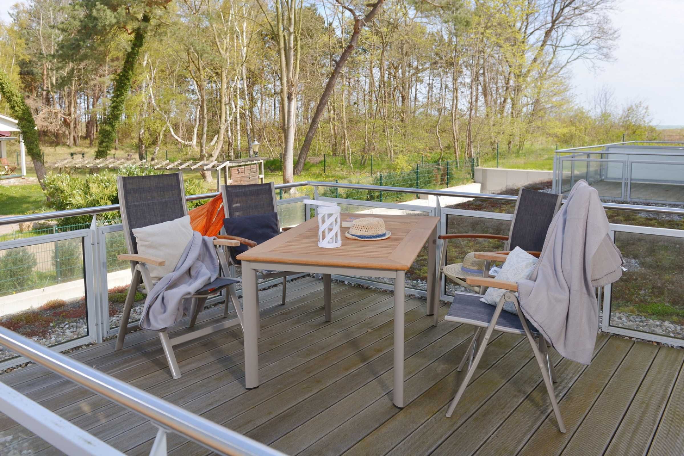 Von der großen Terrasse mit Sitzgruppe und Strandkorb vernehmen Sie das Rauschen der Wellen und genießen das Licht und die Wärme der Sonne.