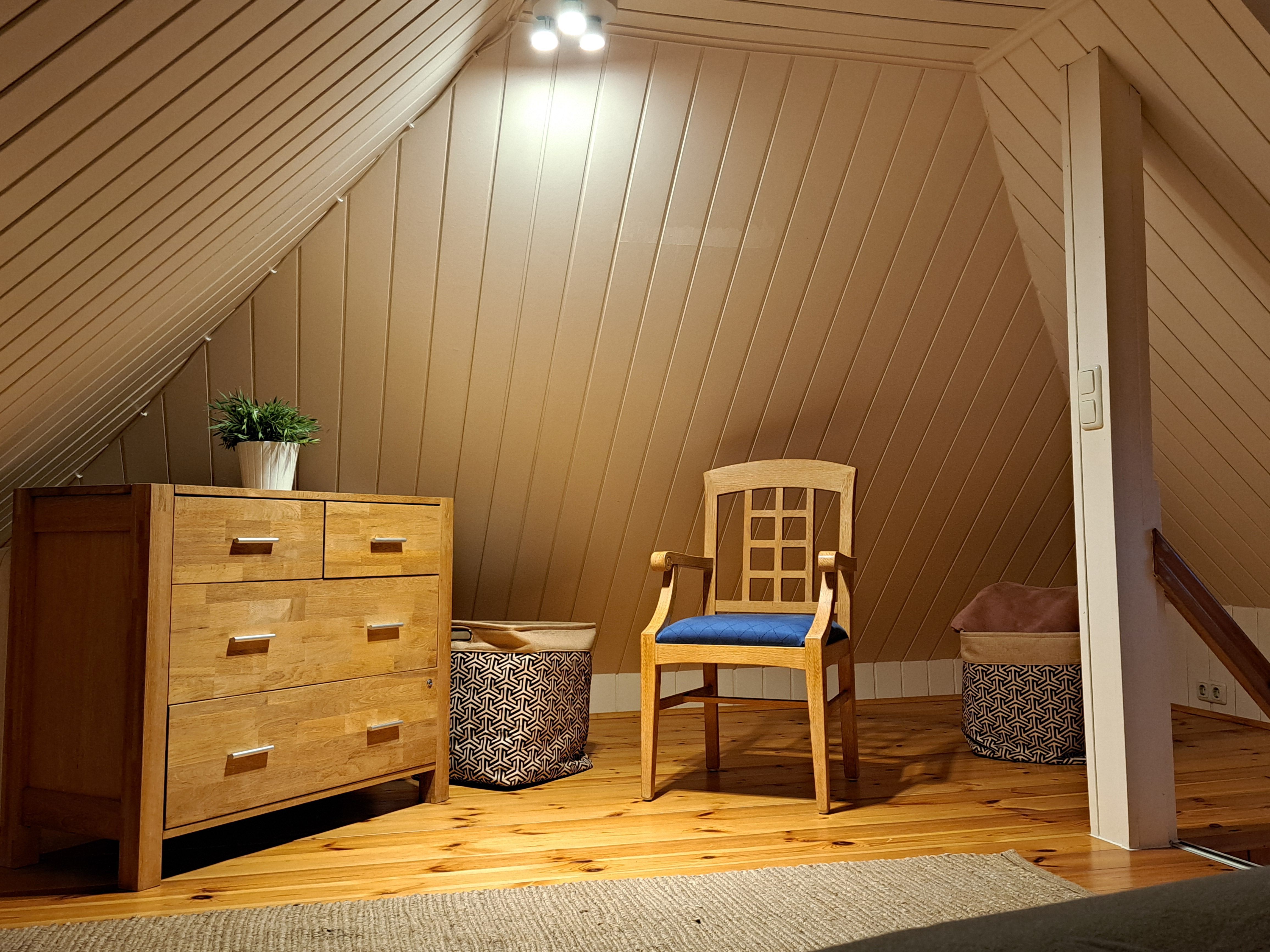 Das qualitativ hochwertig eingerichtete Badezimmer mit ebenerdiger Dusche bietet vielseitige Möglichkeiten für Wellness und Entspannung. Direkt im Dachgiebel des Ferienhauses an der Ostsee befindet sich das modern eingerichtete Schlafzimmer inklusive Doppelbett für zwei Personen mit einer Größe von 1,80 x 2,00 m (getrennte Matratzen), Deckenhöhe ca. 1,80 m. Ebenso steht ein Reisebett für ein Kleinkind bereit. Dank der Konvektorenheizung bietet das Ferienhaus in Dierhagen auch zu kalten Jahreszeiten eine gemütliche Wärme. Nichtraucher, WLAN, keine Haustiere.
