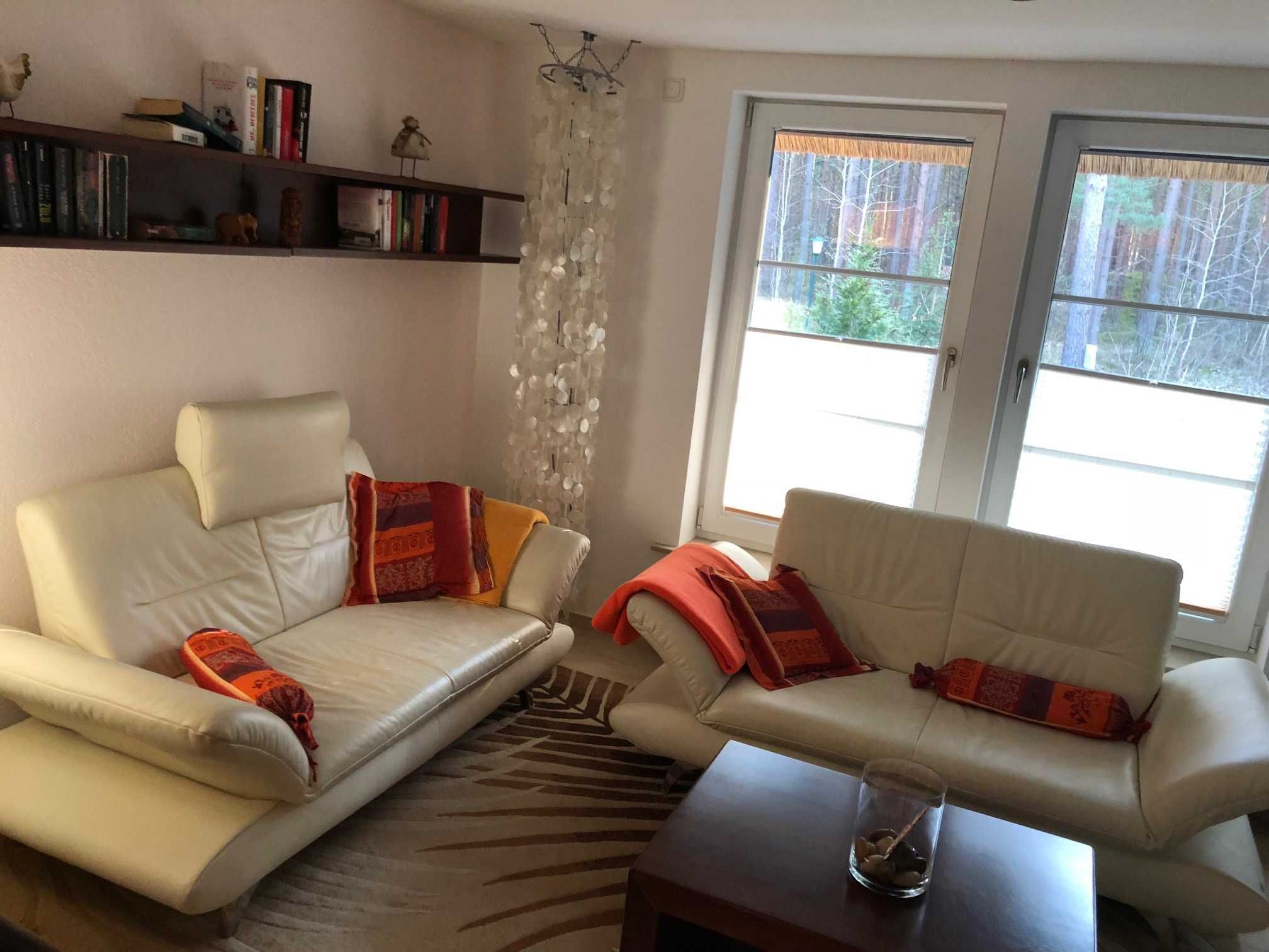 Das Haus ist liebevoll eingerichtet und verfügt über eine integrierte Küche im Wohnbereich. Eine Waschmaschine ist vorhanden. Das Wohnzimmer verfügt neben einer Couchgarnitur mit Tisch auch über einen Kamin. Im Haus gibt es 2 Schlafzimmer mit Doppelbett (jeweils 2 x 80 x 200 cm) im oberen Bereich. Im Erdgeschoss ist ein Bad mit Dusche, im oberen Bereich ein Gäste WC vorhanden.
