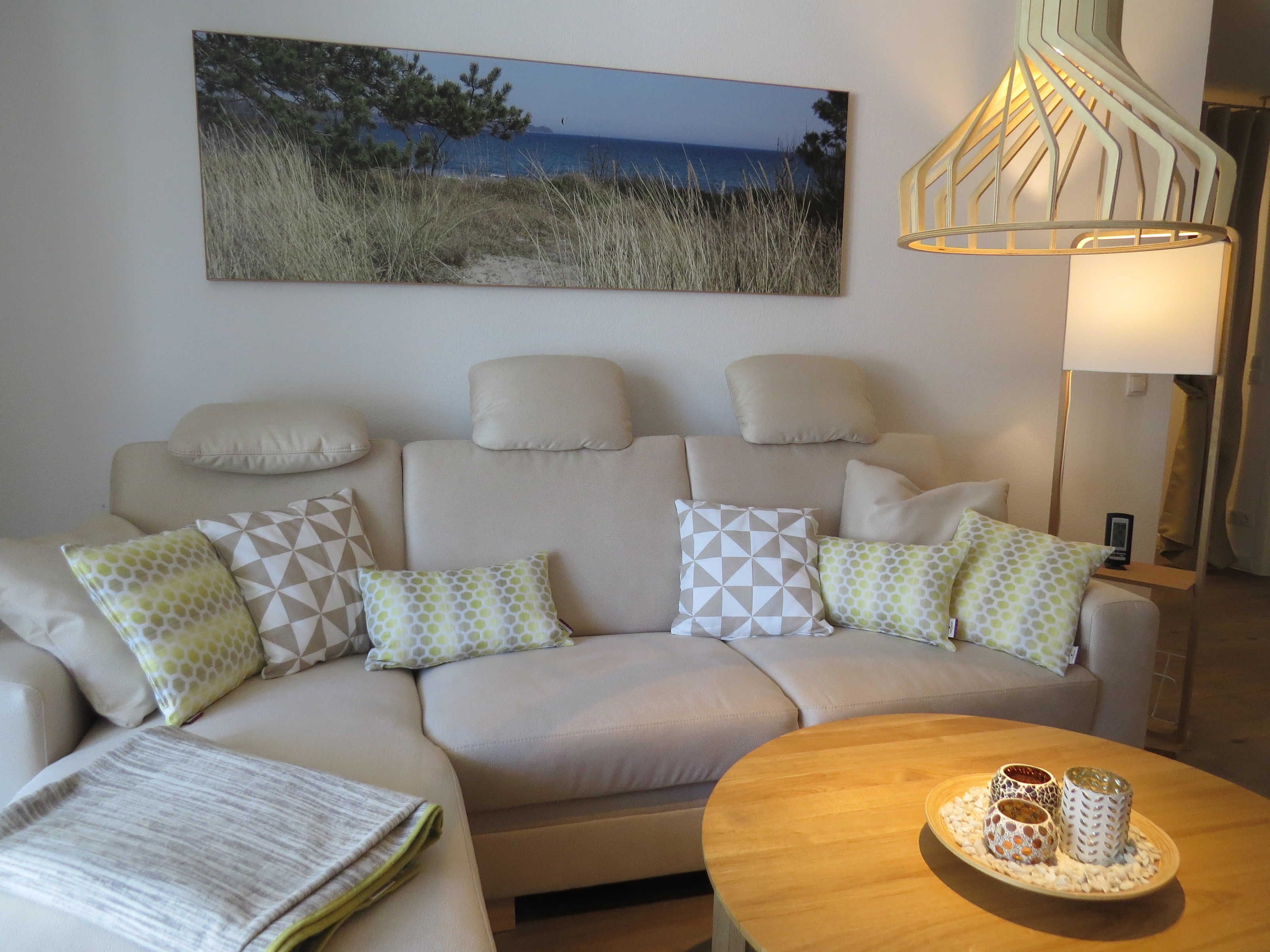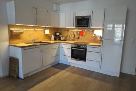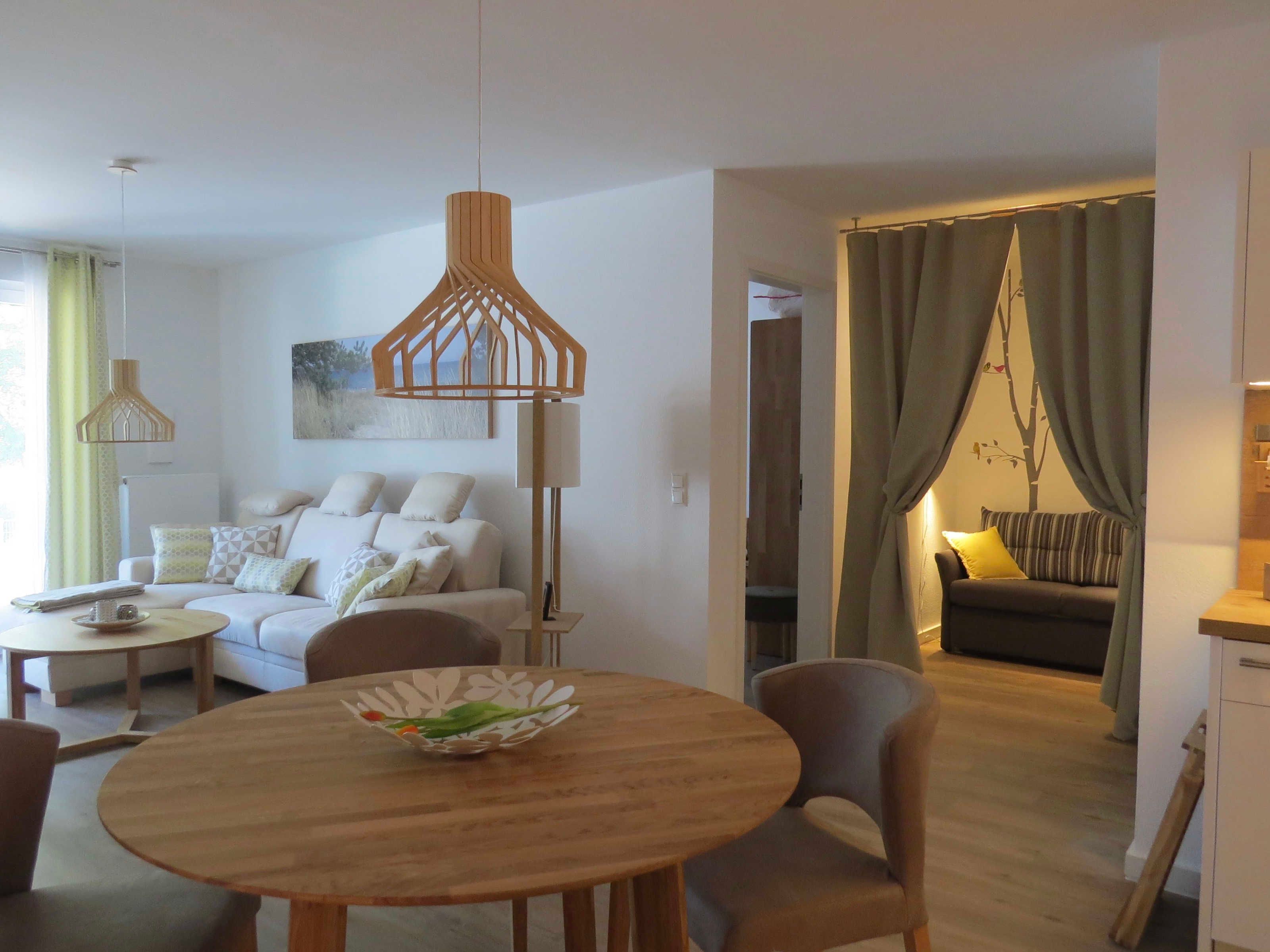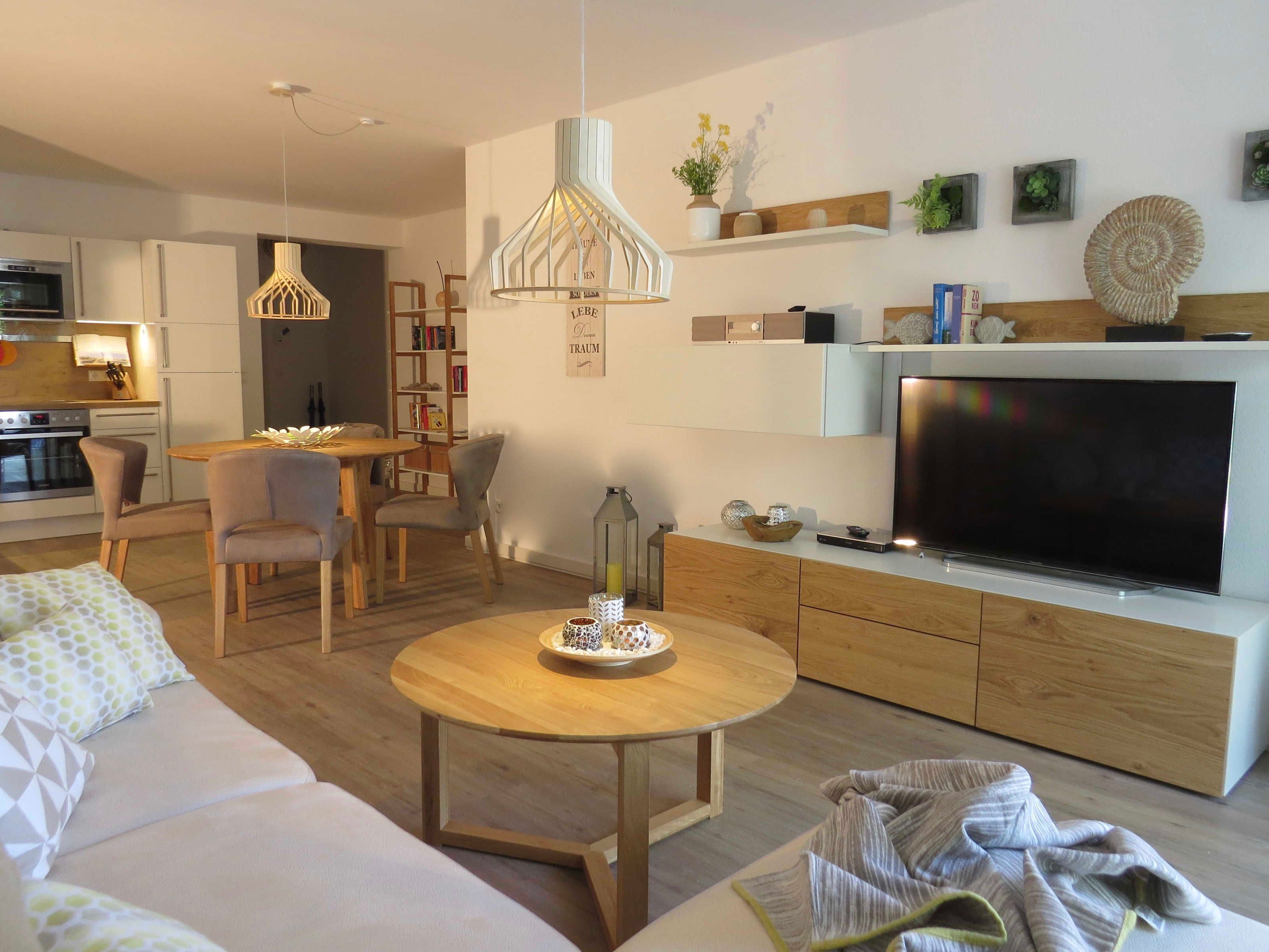 Das Feriendomizil besitzt einen großen Wohnbereich mit Couchecke und Flatscreen-TV, eine Küche mit allen Annehmlichkeiten und einen Esstisch, der Platz für 4 Personen bietet.