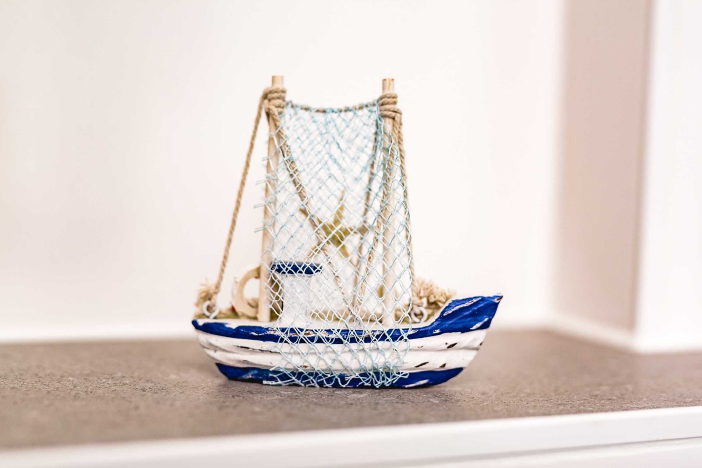 Viel Weiß trifft auf Farbakzente in Blau und Sandtönen und verleiht unserer Hochparterre-Wohnung (ca. 810 Stufen) Leichtigkeit und nordischen Charme. Wohnzimmer und verglaster Balkon laden mit gemütlichen Sitzgelegenheiten zum Verweilen ein.