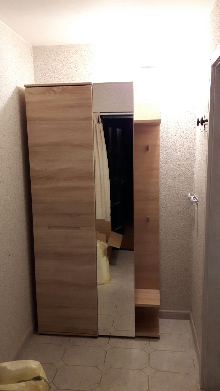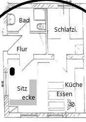 Die Ferienwohnung hat einen Wohn- Schlafraum mit Küchenzeile, darin eine Tischgruppe für die Mahlzeiten und im Wohnbereich eine Sitzcouch über Eck.