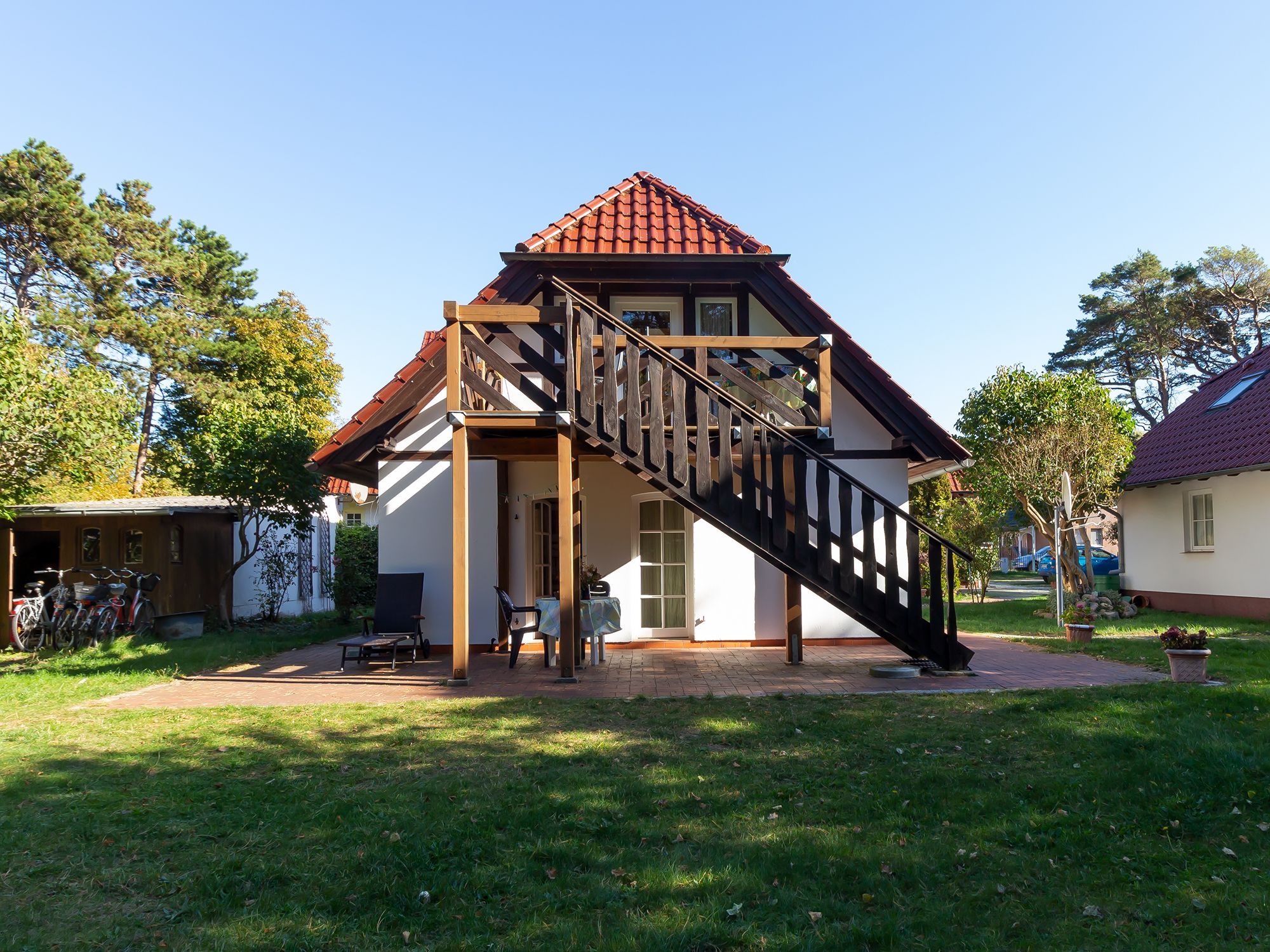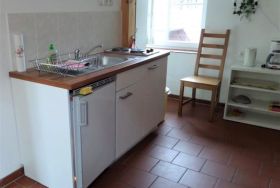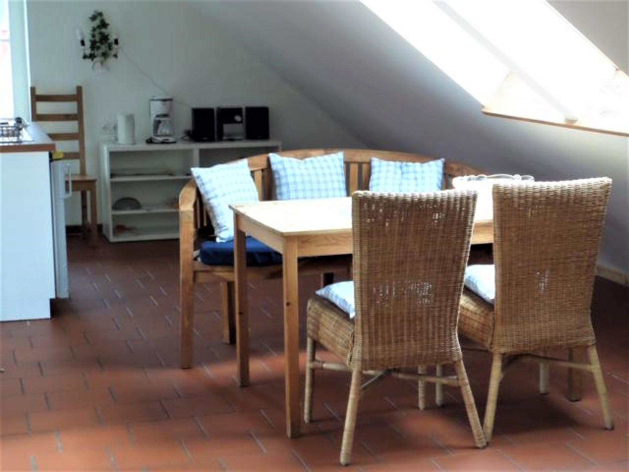 Das Ferienappartement Ruden bietet Platz für max. 3 Gäste. Über eine Außentreppe gelangt man in das Obergeschoss des Hauses, in dem das Appartement liegt. Das Appartement ist von drei Seiten von Küstenwald umgeben und hat daher eine besonders ruhige Lage. In dem großzügigen Wohn-/Schlafraum befindet sich eine Sitzcouch mit Tisch und ein TV-Gerät. Kleine Küchenzeile mit Herd, Kühlschrank, Kaffeemaschine, Toaster und Wasserkocher. Großer Esstisch. Möblierter Südbalkon mit Blick zur Ostsee.