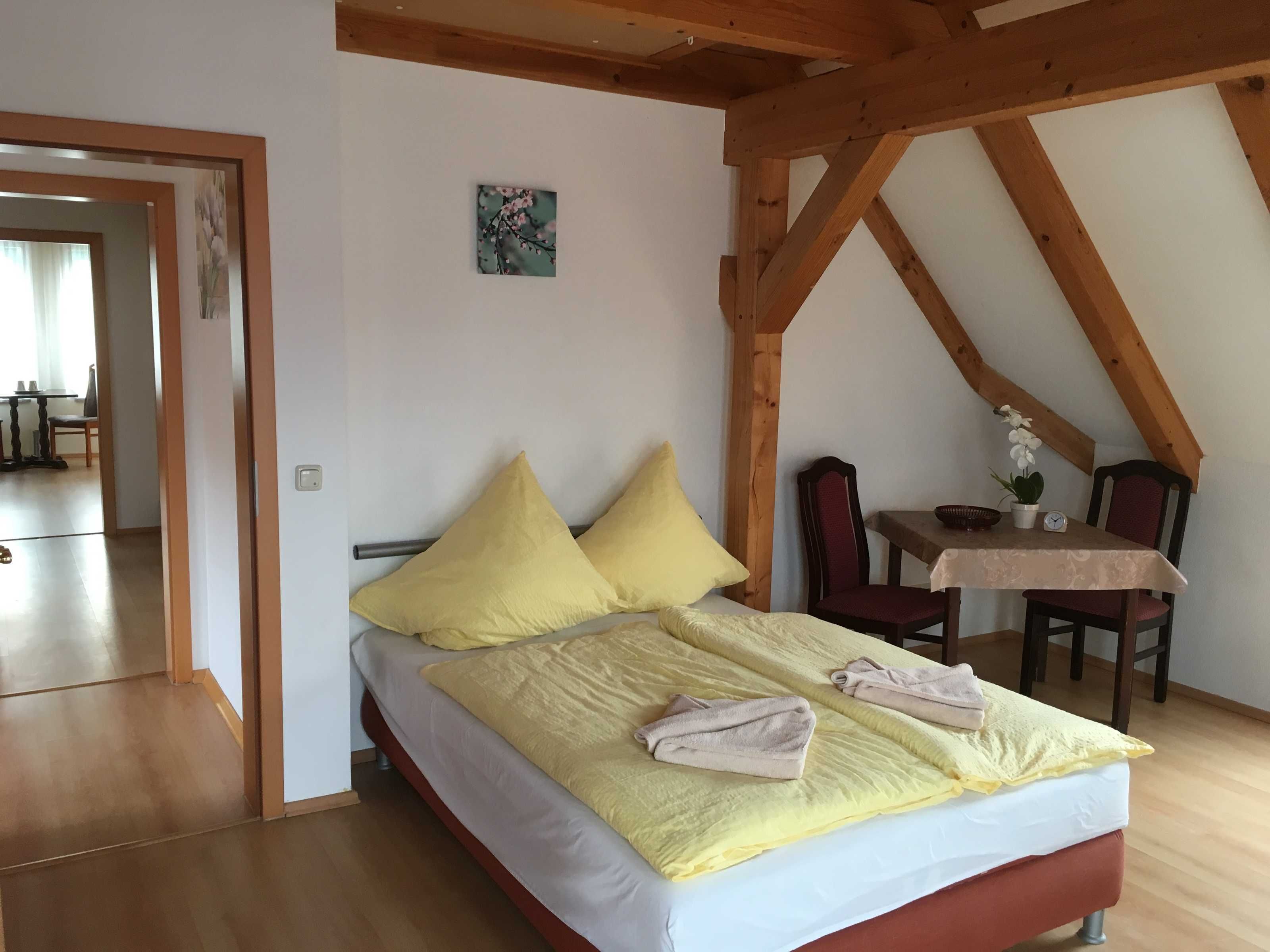 Im ersten Stock sind 2 Schlafzimmer, ein Wannenbad mit WC und BD sowie ein kleiner Aufenthaltsraum mit Kühlschrank, Wasserkocher, Bügeleisen und Bügelbrett.