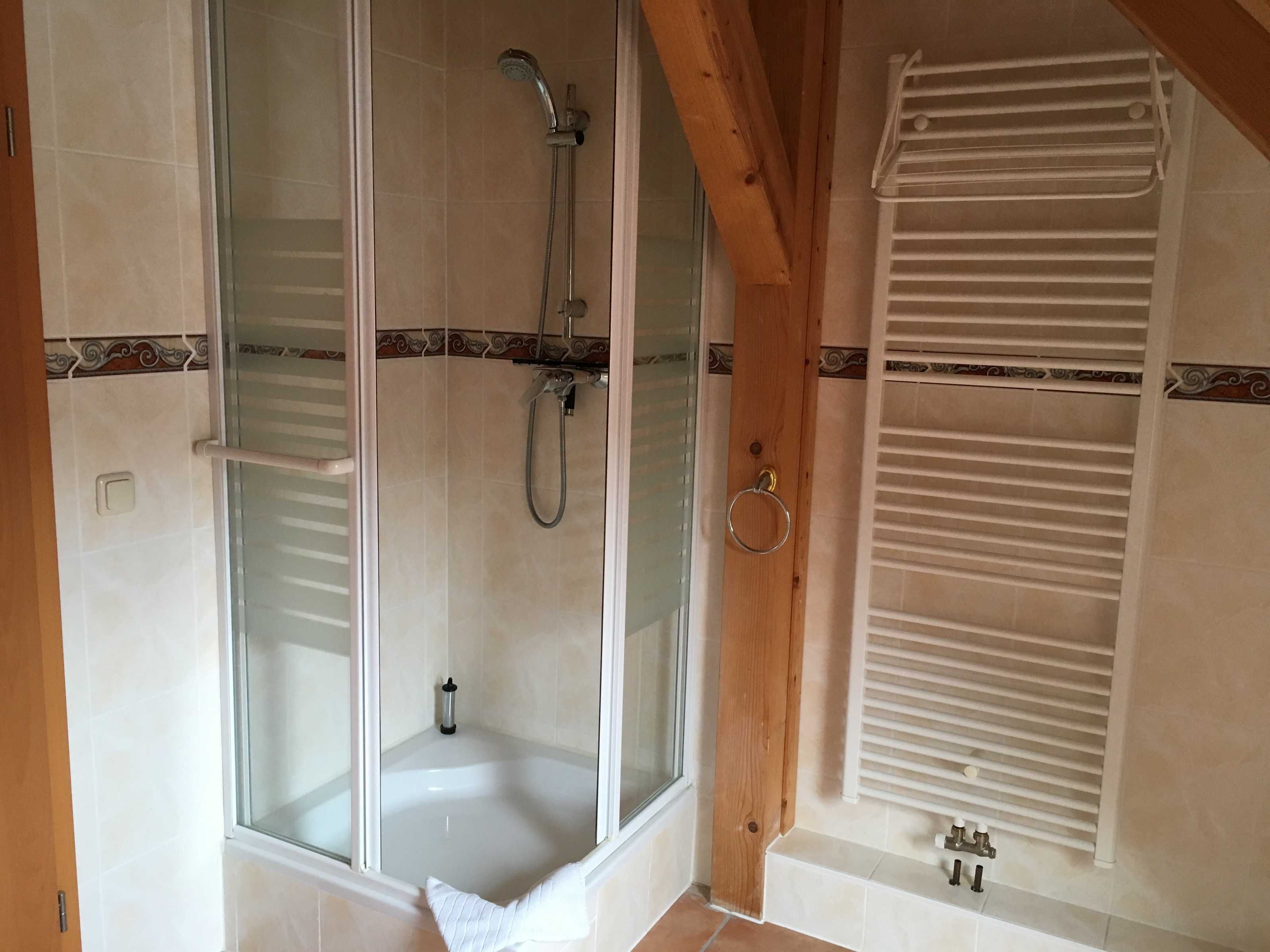 Im zweiten Stock gibt es auch 2 Schlafzimmer, eins davon mit Balkon. Das Bad hat eine Dusche und ein WC. Besonders gemütlich ist das Wohnzimmer mit Balkon. Hier gibt es einen Kühlschrank.