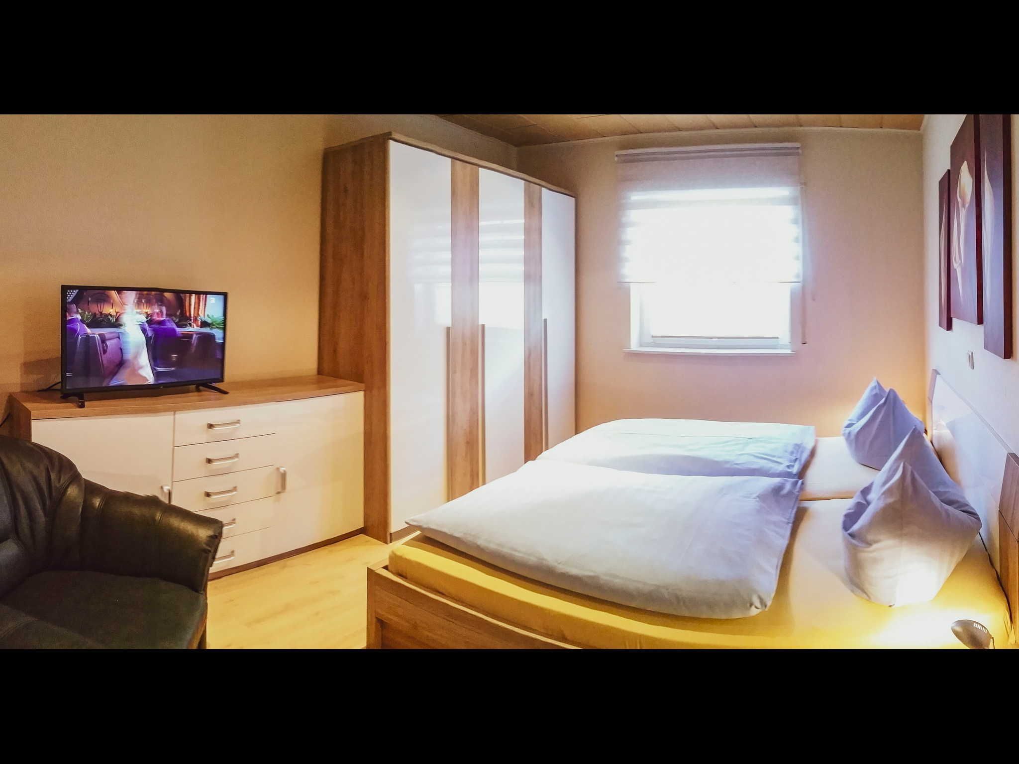 Doppelbett, Kleiderschrank, eine Kommode sowie ein zusätzlicher Flachbild-TV.