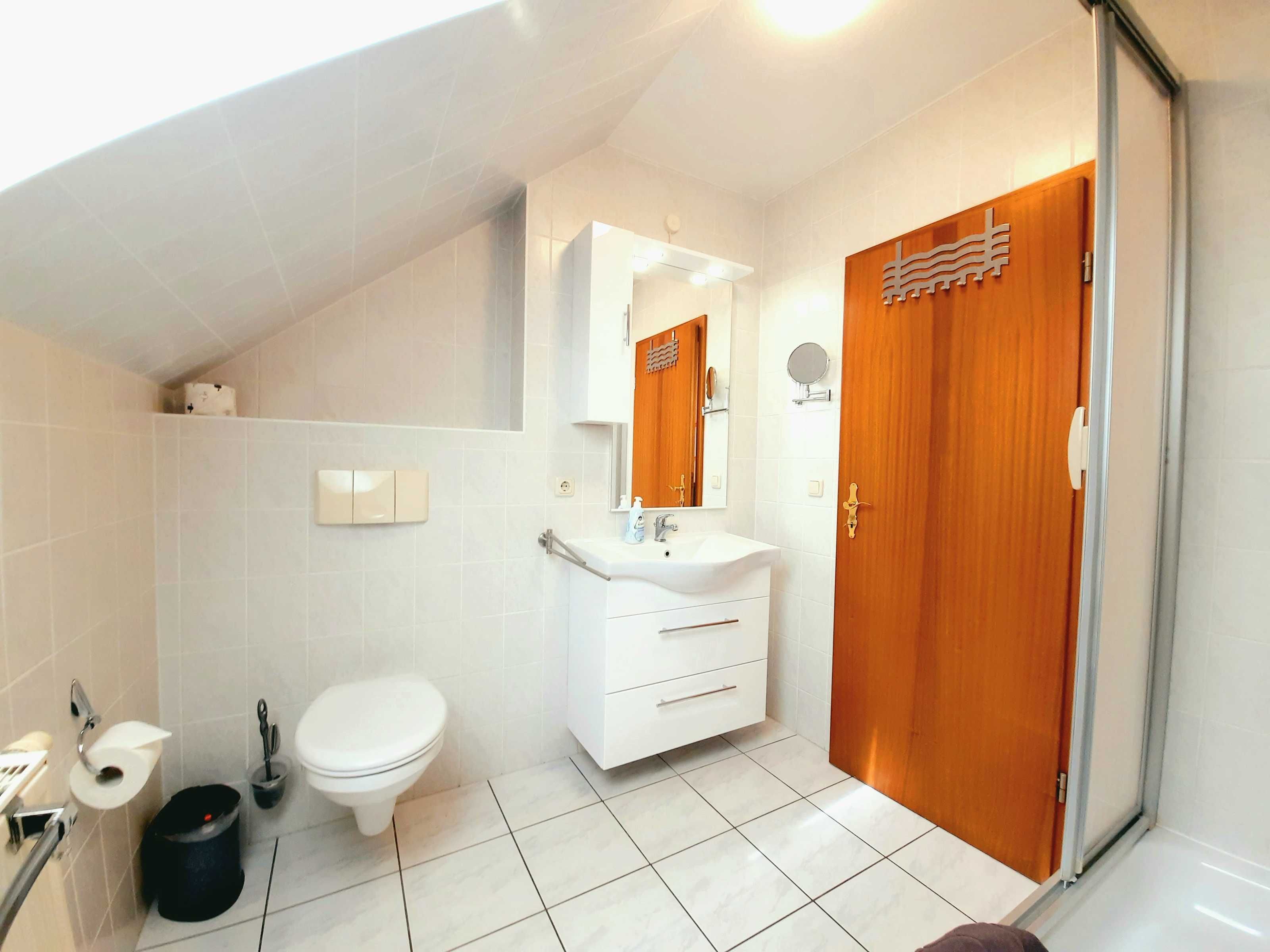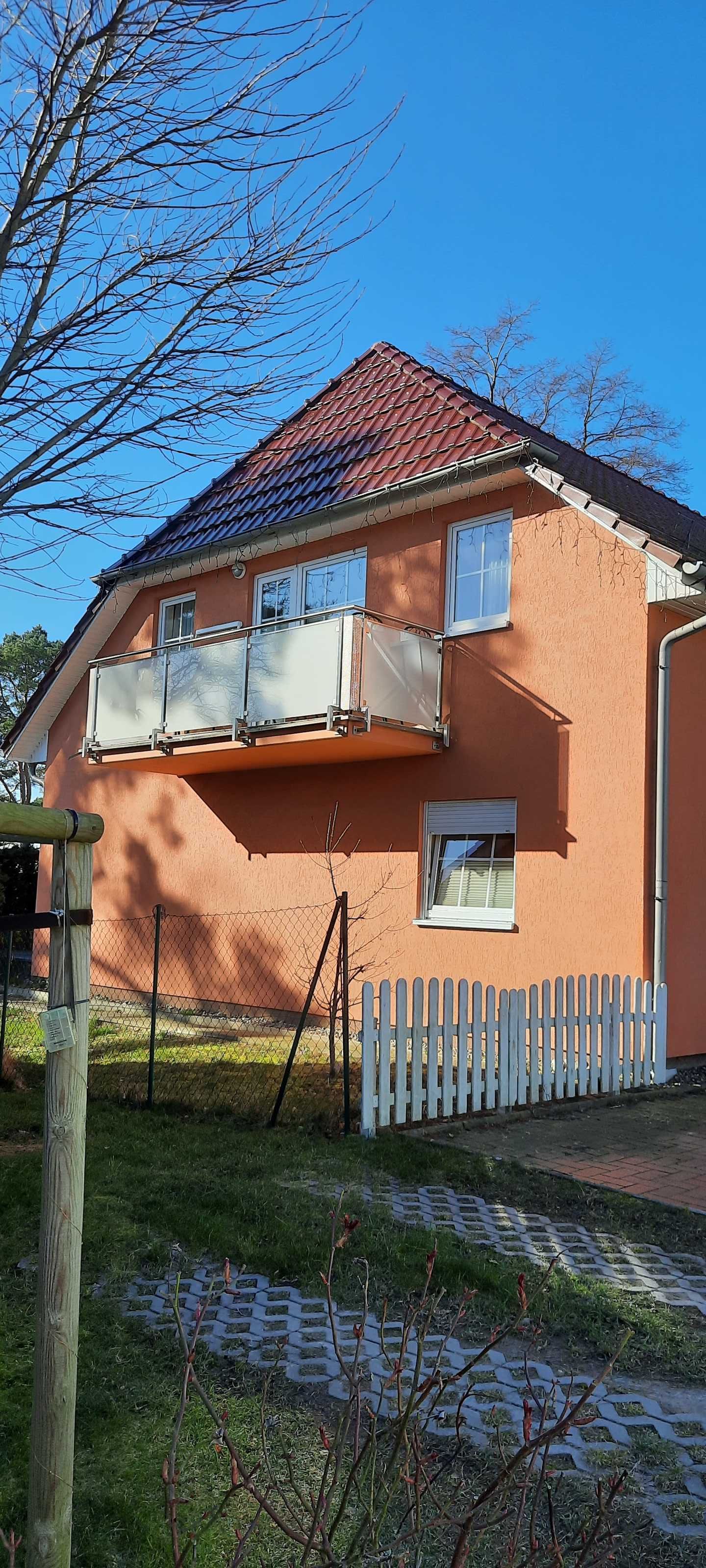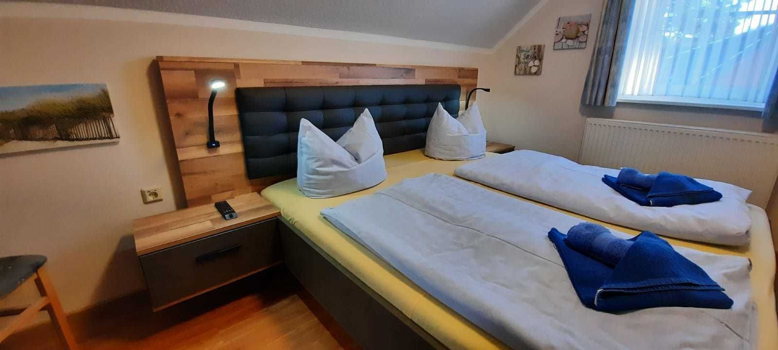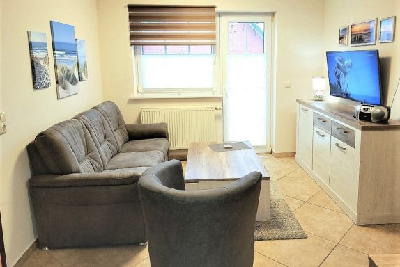 Unsere gemütlich eingerichtete 3-Zimmerwohnung (Nr. 4 oder Nr. 5) befindet sich im 1. Obergeschoss und verfügt über ca. 43 qm. Sie verfügt über einen möblierten Balkon und kann mit bis zu 4 Personen genutzt werden. Die Nichtraucherwohnung teilt sich auf in einen Wohnbereich, zwei Schlafzimmer, Tageslichtbad sowie eine im Wohnzimmer integrierte Küchenzeile mit Essbereich. Das Hauptschlafzimmer erwartet Sie mit Doppelbett sowie Kleiderschrank und TV. Im zweiten Schlafbereich stehen zwei Einzelbetten, Kleiderschrank und TV, zur Verfügung. Das Wohnzimmer ist mit Sofa, Sessel sowie mit einem Flachbild-Smart TV, WLAN und CD-Player mit Radio ausgestattet. Die Küchenzeile verfügt über einen Kühlschrank mit Gefrierfach, Backofen, Geschirrspüler, Geschirr, Besteck, Toaster, Mikrowelle, Ceranfeld, Kaffeemaschine und Wasserkocher. Das Tageslichtbad begrüßt Sie mit Dusche, Haartrockner und WC. Ein PKW- Stellplatz sowie Fahrradabstellmöglichkeit sind am Haus vorhanden.