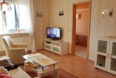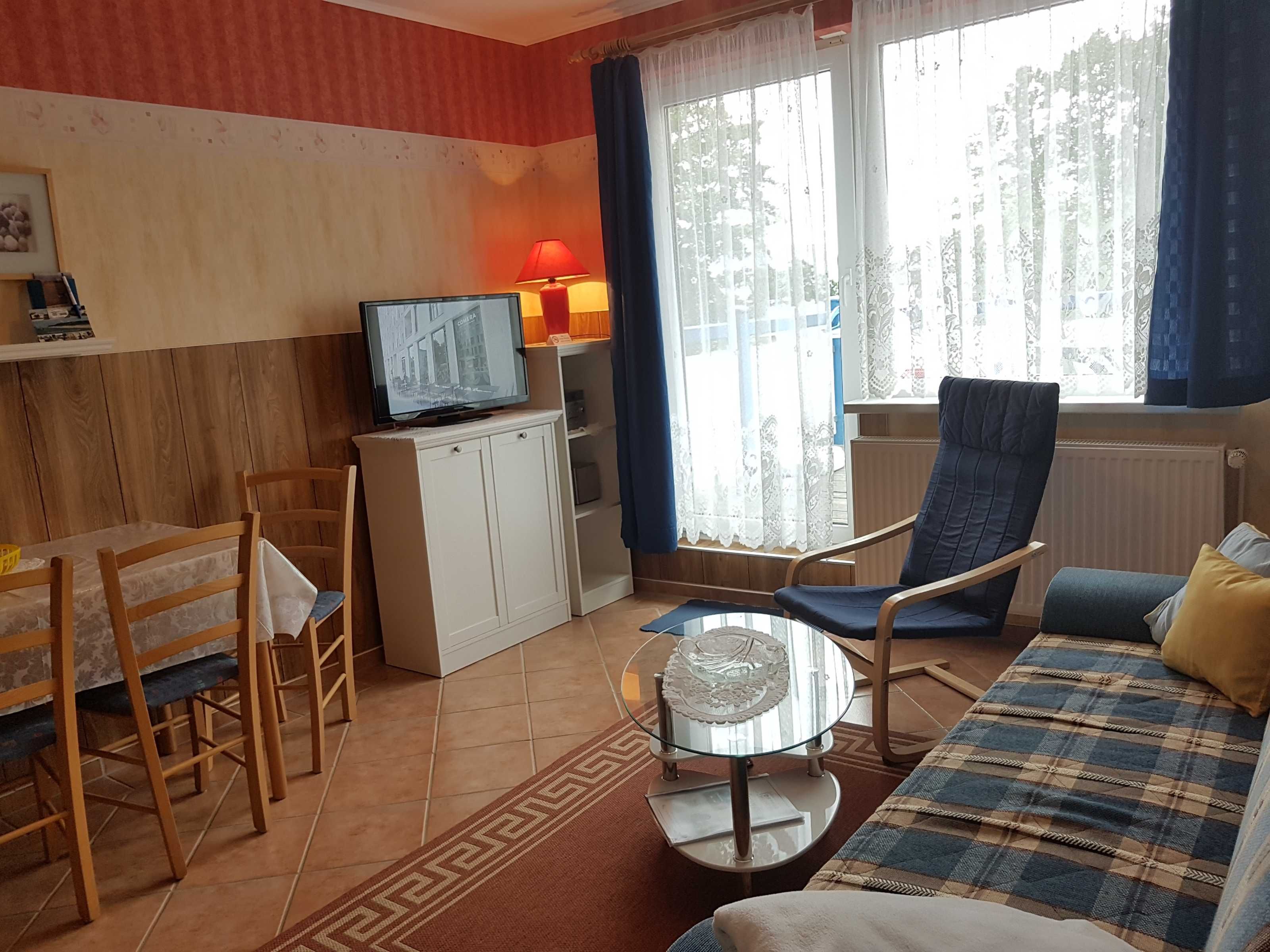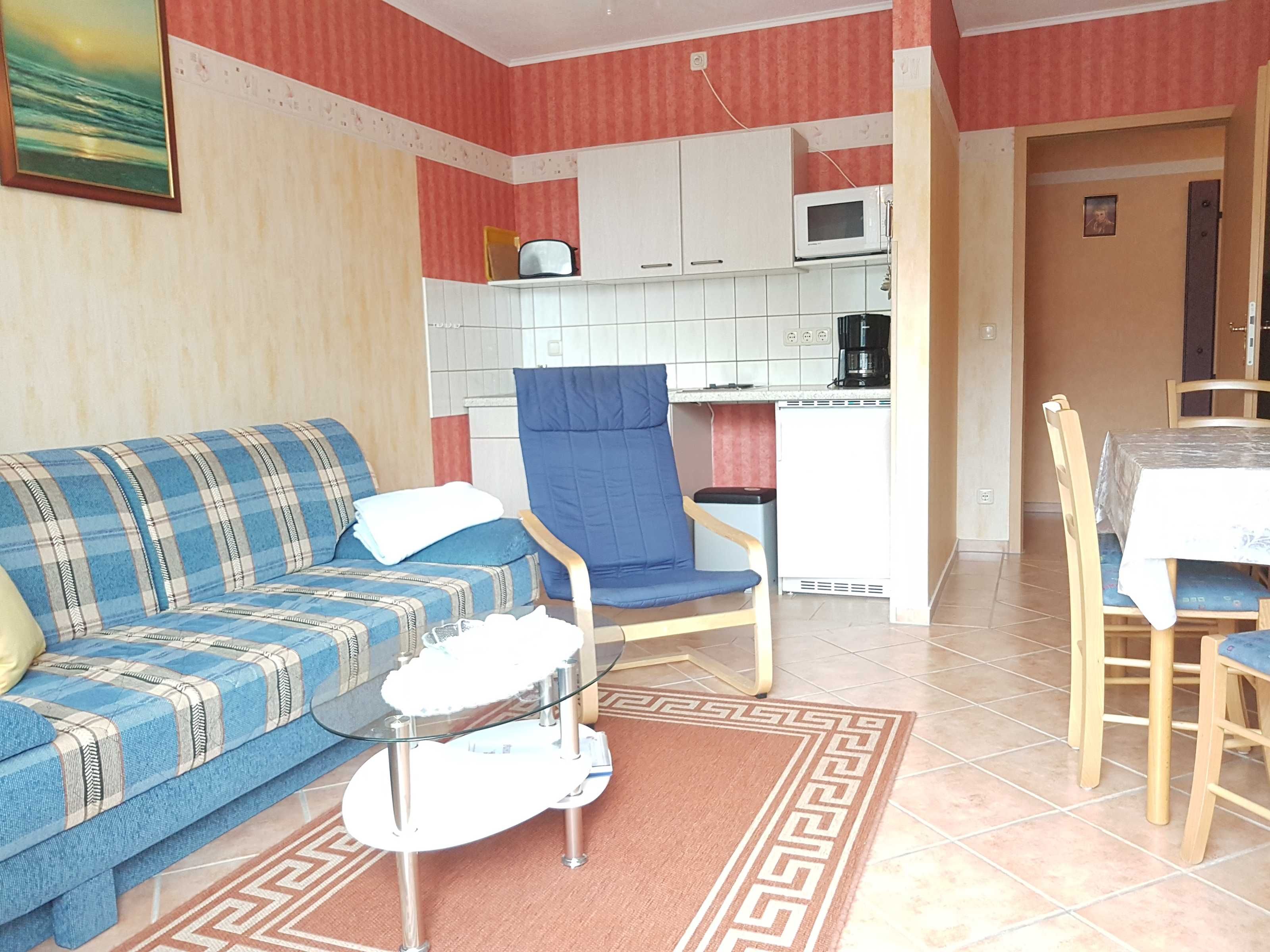 Unser Ferienhaus liegt ca.15 Geh-Minuten vom Strand entfernt in einer ruhigen Wohnlage. Die komplett eingerichtete Ferienwohnung mit Wohnzimmer, ein Schlafzimmer mit einem Ehebett und einer Liege, Küchenzeile, Dusche, WC, Flur und großem Balkon/Terrasse würde für Sie bereitstehen. Zur Ausstattung gehören weiter Radio, Fernseher, einmalig Bettwäsche und Handtücher. In der Küchenzeile sind Mikrowelle, Kaffeemaschine und Toaster, Eier-und Wasserkocher sowie ein 2-Platten-Kocher, Kühlschrank und Geschirr vorhanden. Eine Aufbettung ist im Wohnzimmer nach Absprache auf dem ausziehbarem Sofa möglich. Zu jeder Wohnung gehört ein kostenloser Parkplatz für Ihr Auto. In dieser Wohnung sind k e i n e Haustiere erlaubt!