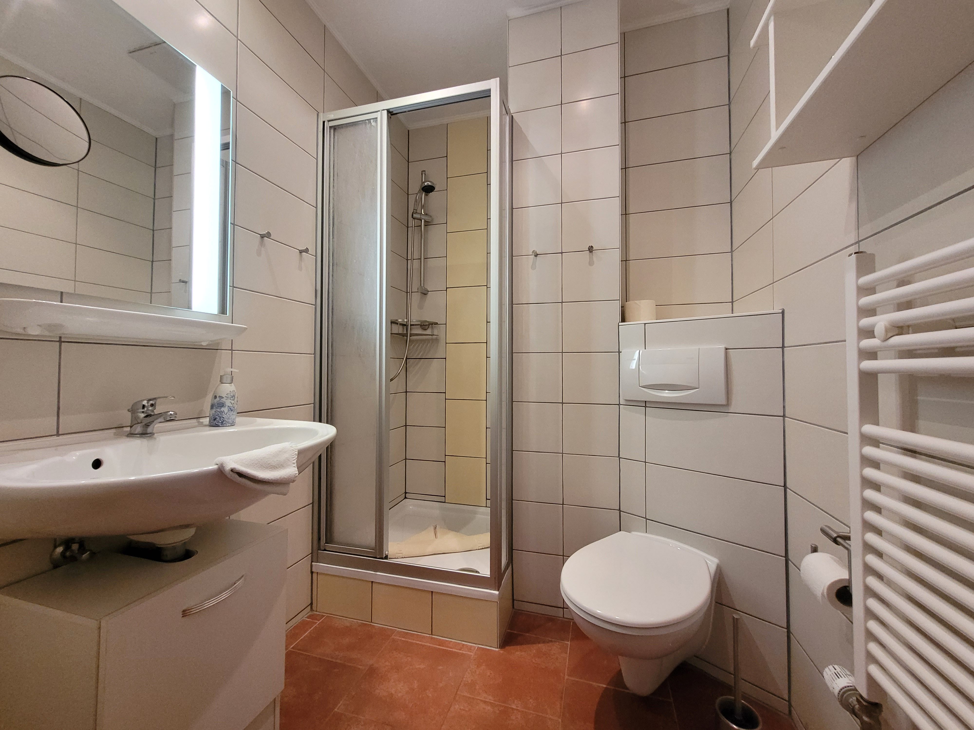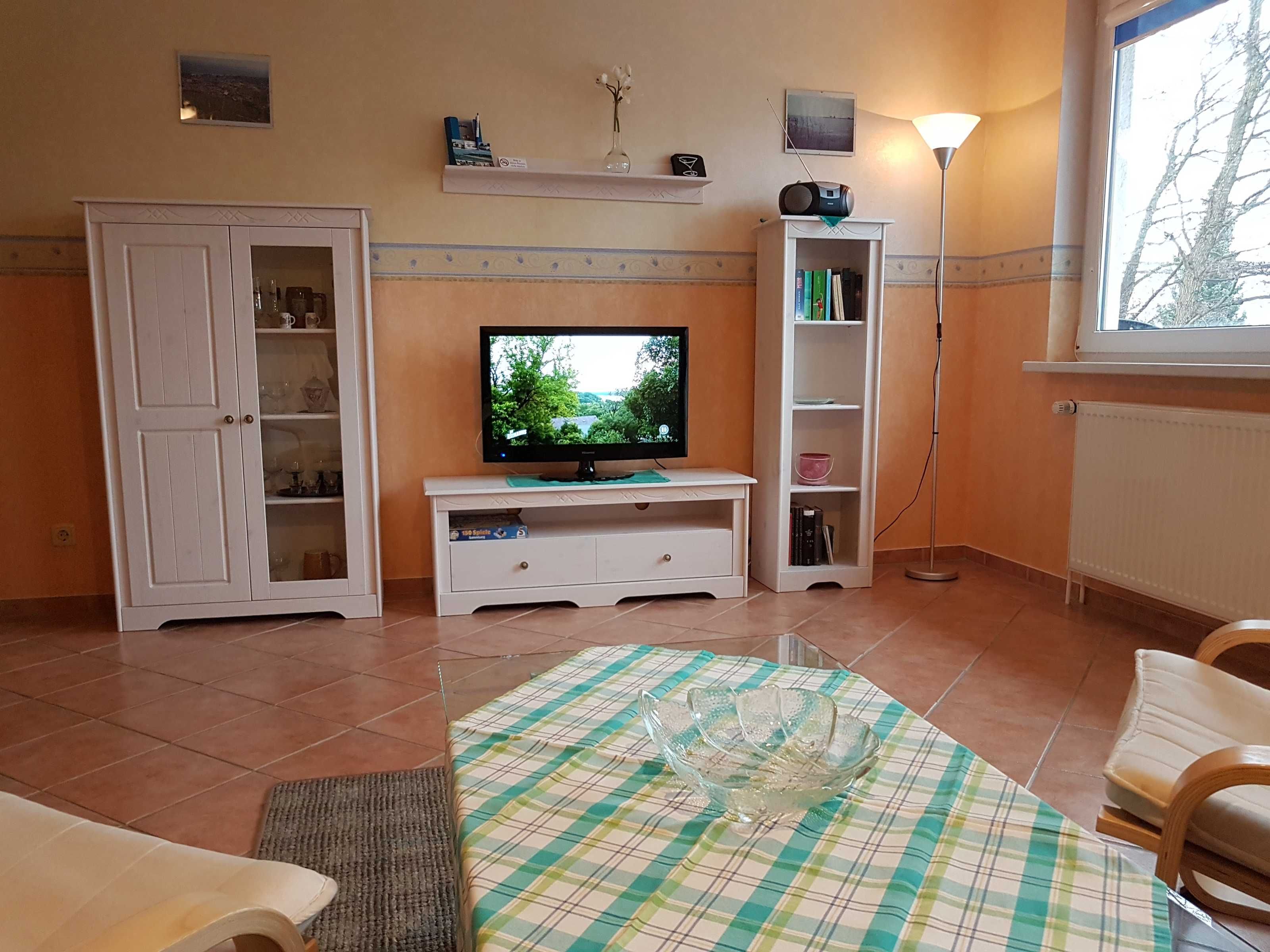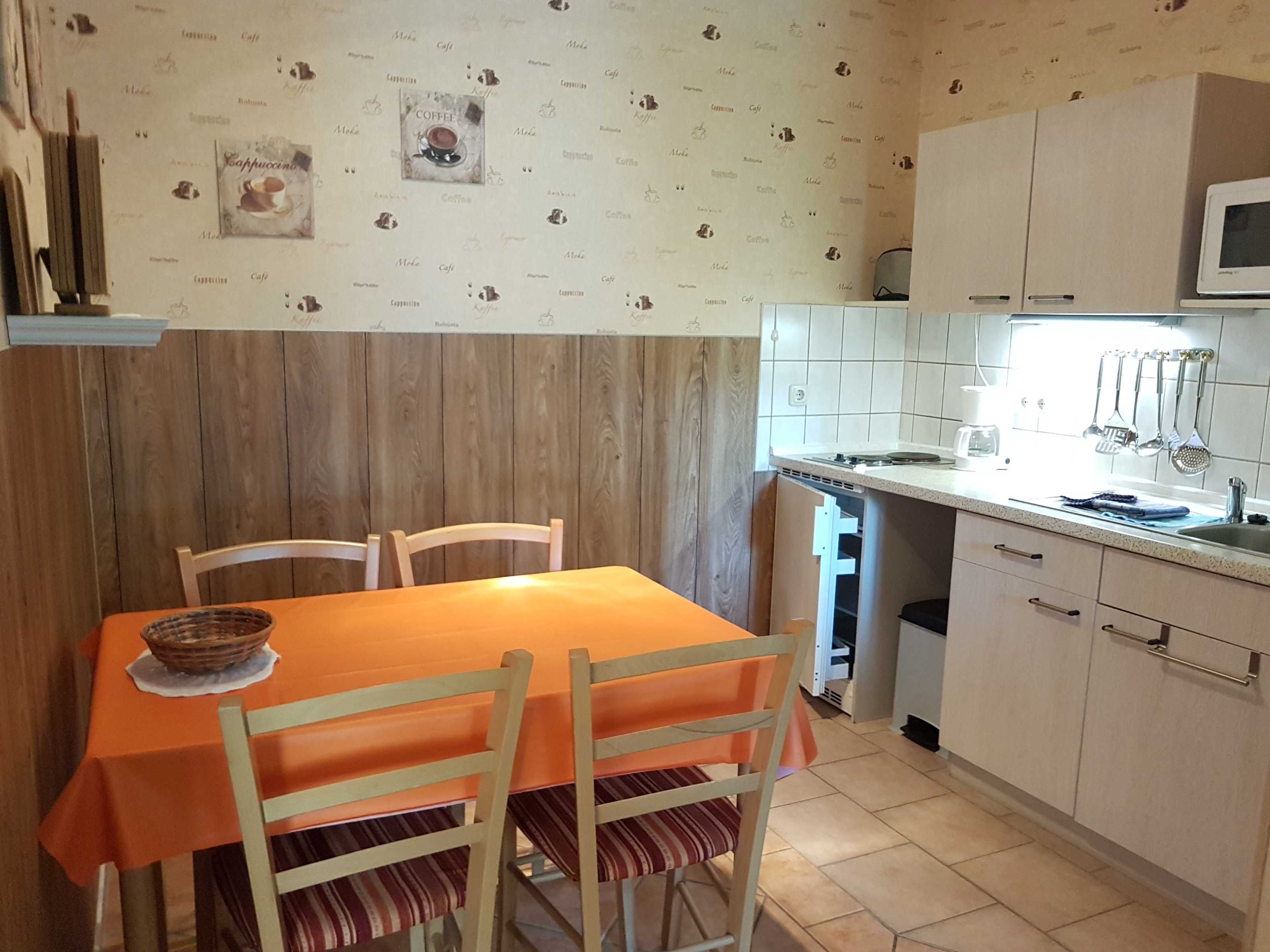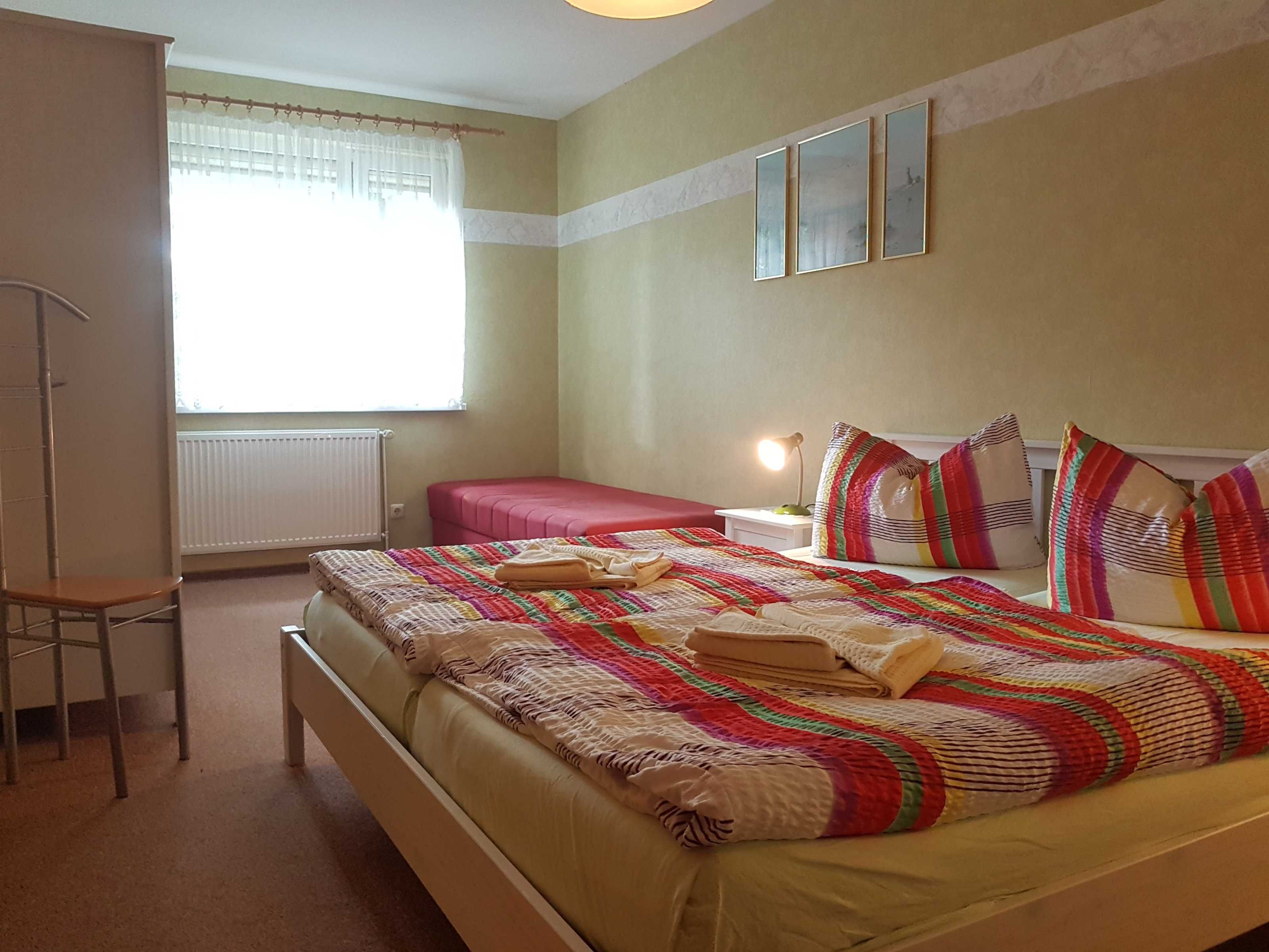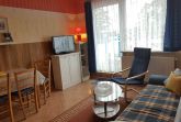 Die komplett eingerichtete Ferienwohnung mit Wohnzimmer, ein Schlafzimmer mit einem Ehebett und einer Liege, Küchenzeile, Dusche, WC, Flur und großem Balkon würde für Sie bereitstehen. Zur Ausstattung gehören weiter Radio, Sat-Fernseher, einmalig Bettwäsche und Handtücher. In der Küchenzeile sind Mikrowelle, Kaffeemaschine und Toaster, Eier- und Wasserkocher sowie ein 2- Platten-Kocher, Kühlschrank und Geschirr vorhanden. Wir möchten Sie darauf hinweisen, dass es sich bei unseren Ferienwohnungen um Nichtraucherwohnungen handelt. Natürlich dürfen Sie auf dem Balkon oder der Terrasse rauchen. Die Waschmaschinen- und Trocknerbenutzung ist nach vorheriger Absprache möglich.