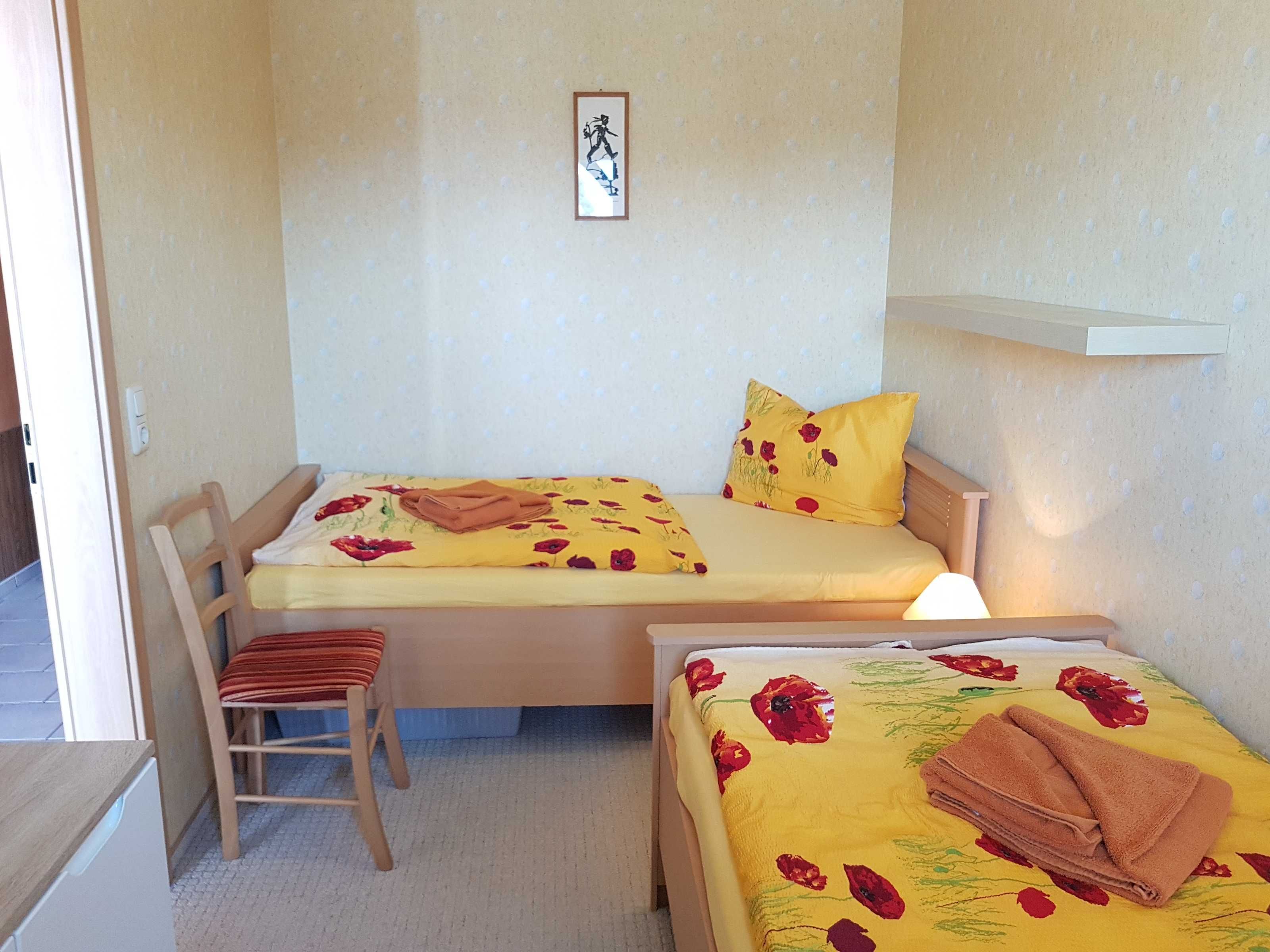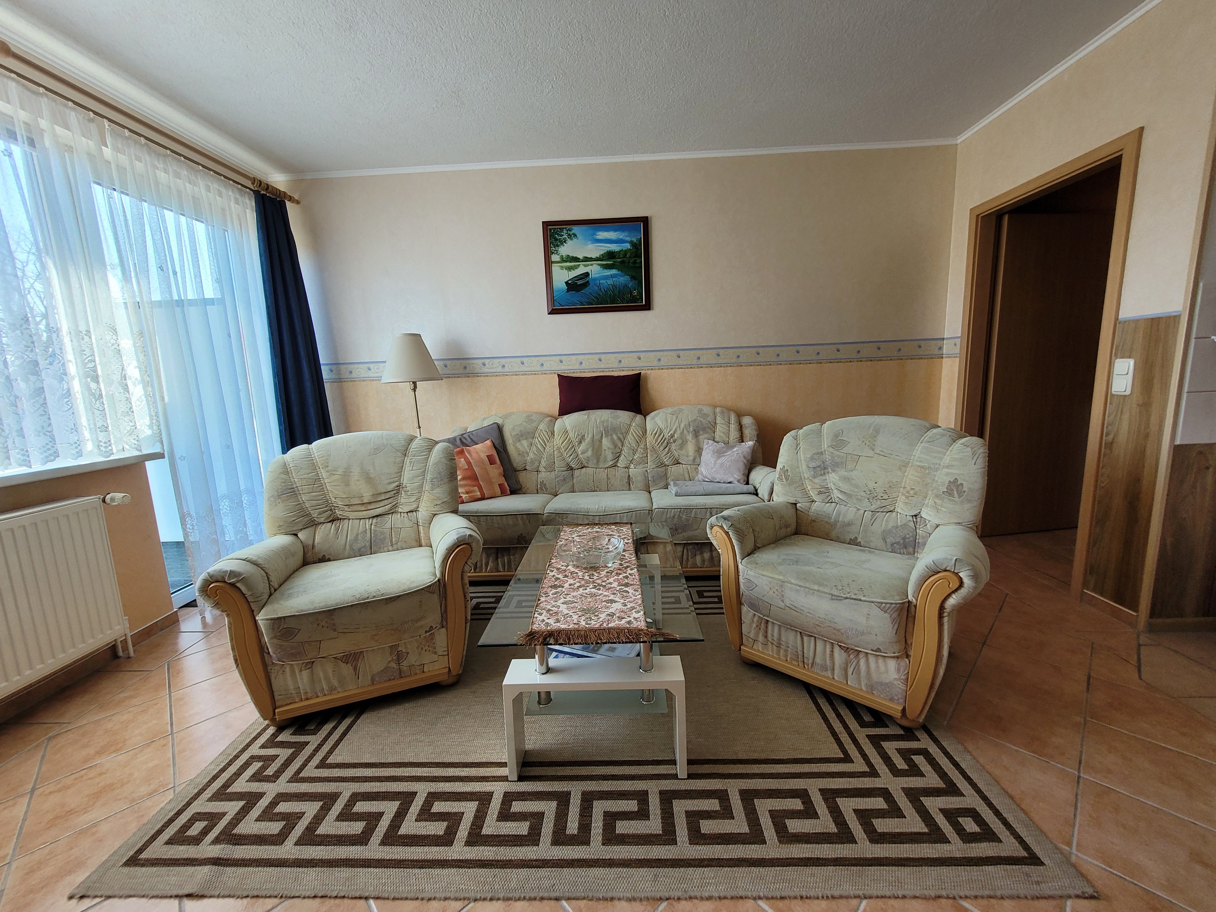 Die komplett eingerichtete Ferienwohnung mit Wohnzimmer, zwei Schlafzimmern mit einmal einem Doppelbett und einmal zwei Einzelbetten, Küchenzeile, Dusche, WC, Flur und großer Terrasse/Balkon würde für Sie bereitstehen. Zur Ausstattung gehören weiter Radio, Sat- Fernseher, einmalig Bettwäsche und Handtücher. In der Küchenzeile sind Mikrowelle, Kaffeemaschine und Toaster, Eier- und Wasserkocher sowie ein 2- Platten-Kocher, Kühlschrank und Geschirr vorhanden.