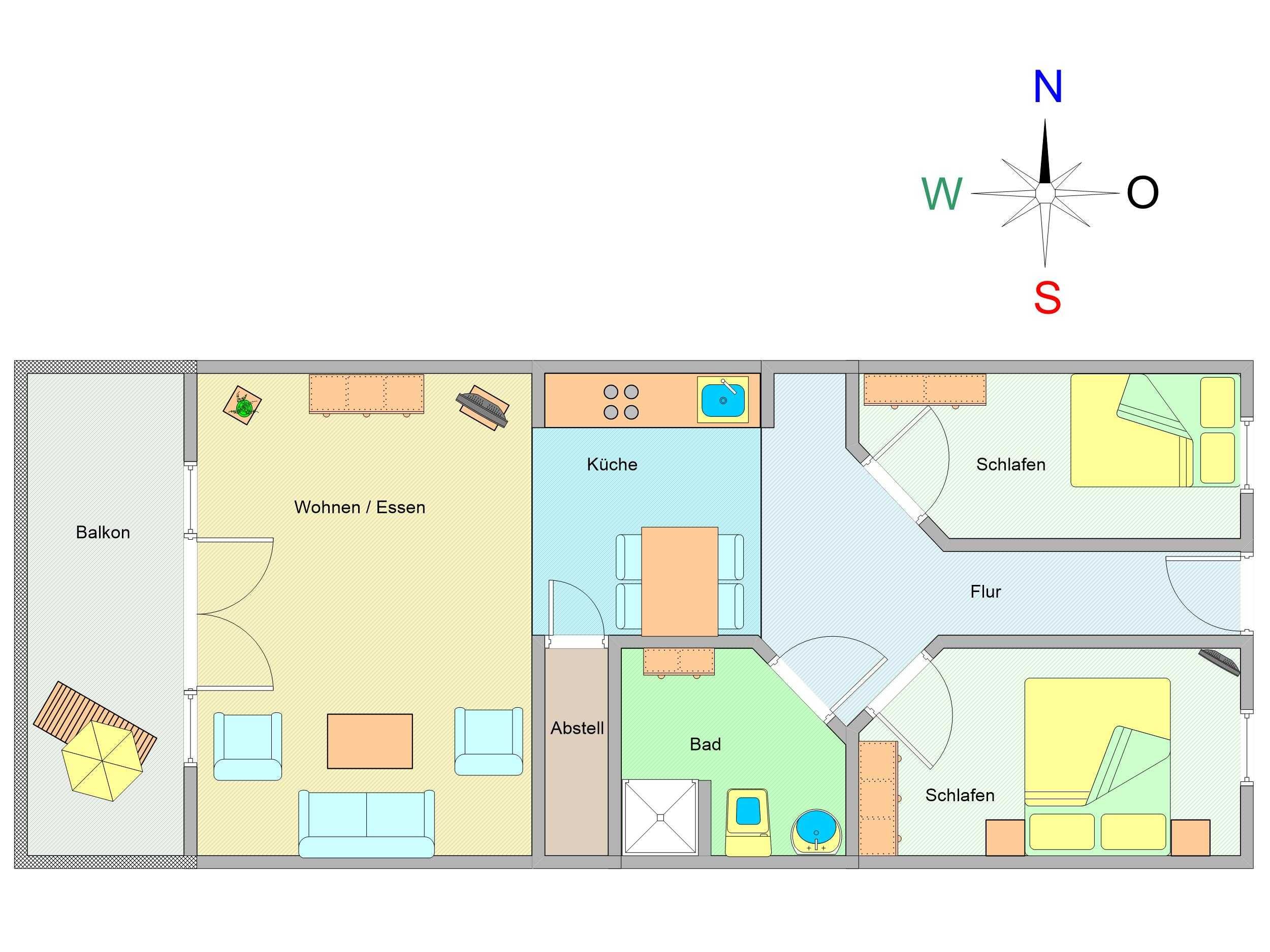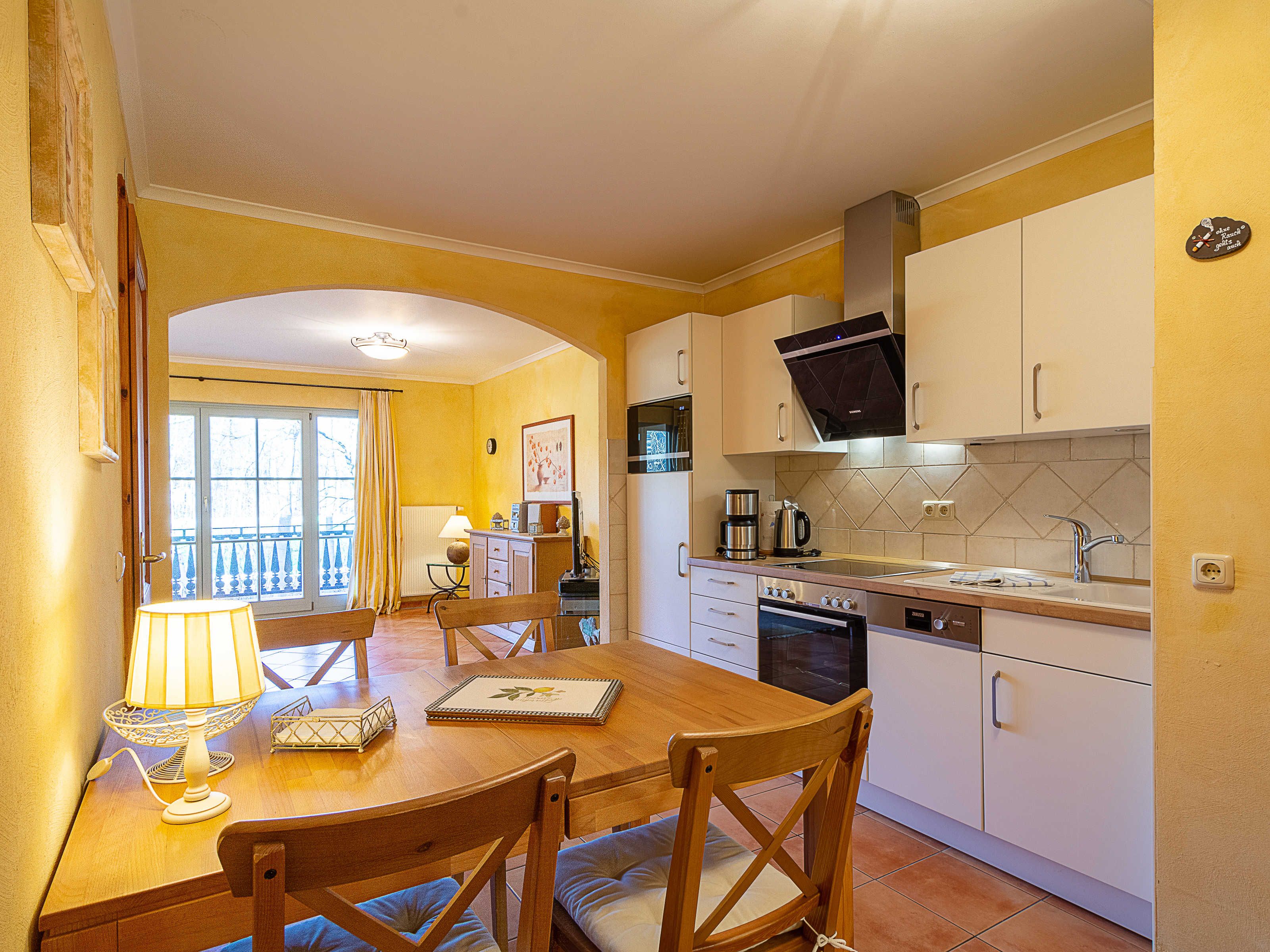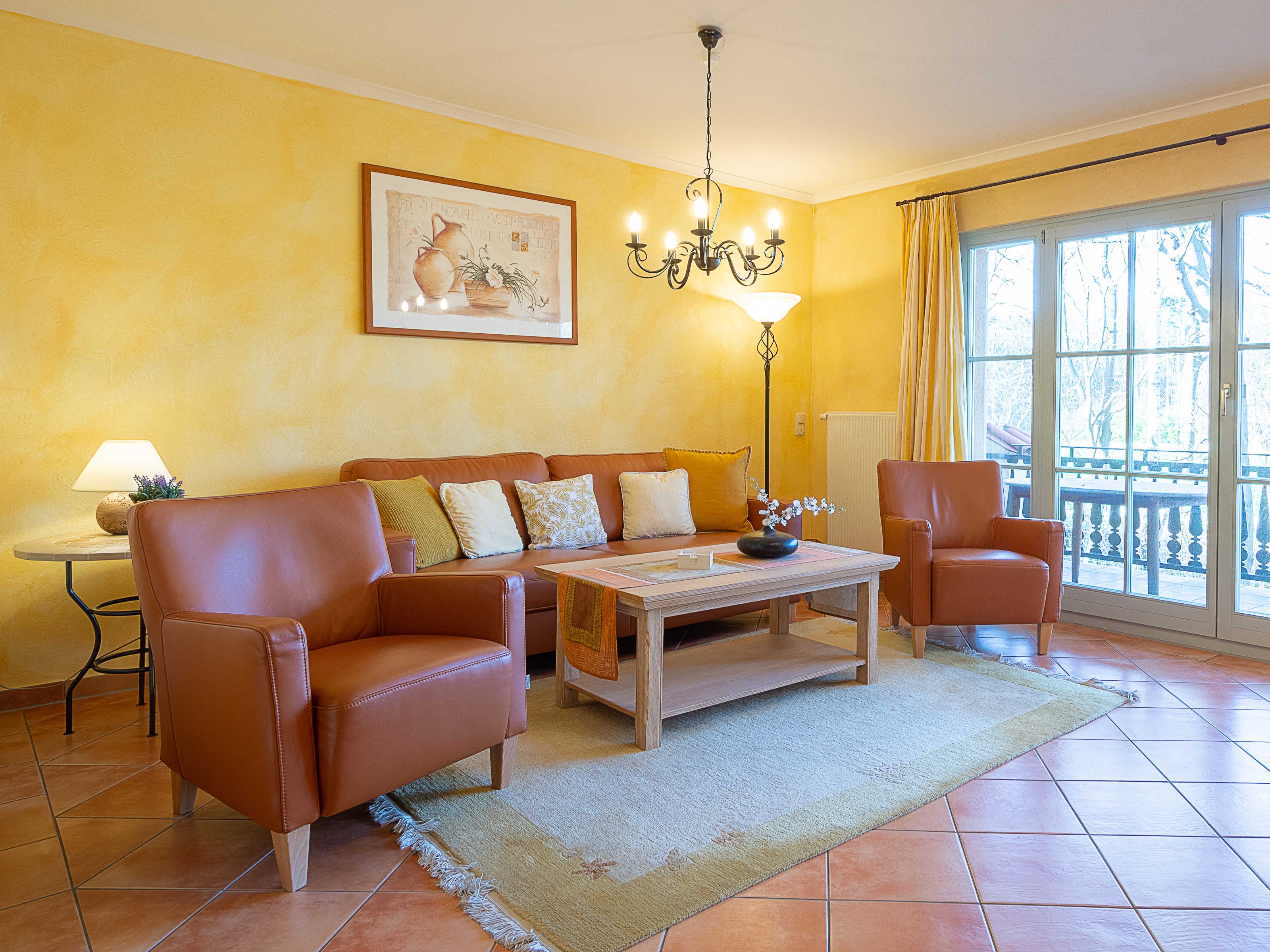 Herzlich willkommen in der Wohnung Nr. 35 in der Appartementanlage der Residenz Laguna. Die liebevoll eingerichtete 3-Raum-Ferienwohnung befindet sich im hinteren Haus der Anlage im ersten Obergeschoss und ist über den Treppenflur oder den Fahrstuhl erreichbar. Sie wohnen in einer 72 m² großen Ferienwohnung, die für 2-4 Personen geeignet ist. Es empfängt Sie ein freundlicher mediterran gestalteter Wohnraum mit hochwertiger Couchgarnitur und Möbeln, Flachbild-TV, Stereoanlage und Zugang zum möblierten Balkon. Der nach Westen ausgerichtete Balkon bietet einen Blick auf den Kühlungsborner Stadtwald und Ruhe sowie Entspannung vom Trubel im Sommer. Dem Wohnraum schließt sich der Ess- und Küchenbereich an. Die voll ausgestattete Küchenzeile bietet alle wichtigen Küchengeräte und -utensilien, die Sie für Ihr „perfektes Dinner“ benötigen: Geschirrspüler, 4-Platten-Cerankochfeld mit Backofen und Dunstabzug, Geschirrspüler, Mikrowelle Kühlschrank, Kaffeemaschine etc. sind vorhanden. Ein Schlafzimmer mit Doppelbett und großzügigem Kleiderschrank, ein Schlafraum mit zwei Einzelbetten sowie das geflieste Bad mit Dusche und WC vervollständigen das Gesamtbild dieser Wohnung.