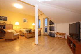 Ferienwohnung für 2 Personen zzgl. einem Kleinkind (ca. 46 m²) im 2.OG / Dachgeschoss mit Wohn- und Schlafzimmer, Küche, Bad und 2 Balkonen.