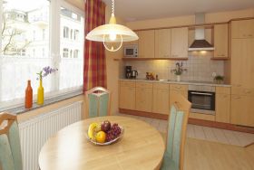 Mit dem Komfort eines Neubaus und der reizvollen Nähe zu mondänen Villen der Gründerzeit empfängt Sie die Villa Seestern im Neuen Weg im Seebad Heringsdorf. Die komfortable 2-Zimmerwohnung (Nichtraucher) im Erdgeschoss des Hauses ist 48 qm groß und bietet zwei bis vier Personen Platz. Es verfügt über ein Wohnzimmer mit einer Schlafcouch (1,50 m Liegefläche), eine komplett ausgestattete Küchenzeile mit Geschirrspüler, Mikrowelle, Herd mit Ceranfeld usw., ein Schlafzimmer mit Doppelbett und einen Balkon. Handtuchpakete, Kinderreisebetten, und Hochstühle können kostenpflichtig ausgeliehen werden. Die in den Kaiserbädern fällige Kurtaxe ist bar vor Ort bei Anreise zu zahlen.